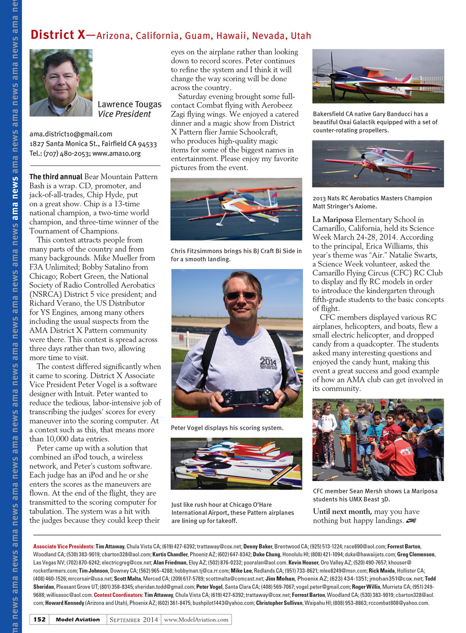 This contest brings people from many parts of the country and from many backgrounds. Mike Mueller from F3A Unlimited, Bobby Satalino from Chicago, Robert Green the National Society of Radio Controlled Aerobatics (NSRCA) District 5 vice president, Richard Verano the U.S. Distributor for YS Engines, and among many others including the usual suspects from the AMA District X Pattern community. This contest is spread across three days rather than two, allowing more time to visit with the travelers.