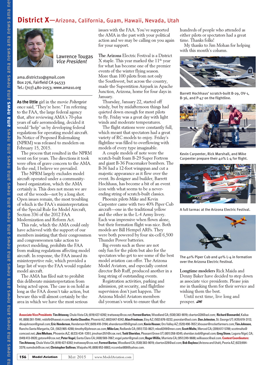 As the little girl in the movie Poltergeist once said, “They’re here.” I’m referring to the FAA, the large federal agency that, after reviewing AMA’s 70-plus years of safe Aeromodeling, decided it would develop federal regulations for operating model aircraft. Its notice of proposed rulemaking (NPRM) was released to modelers on February 15, 2015.
