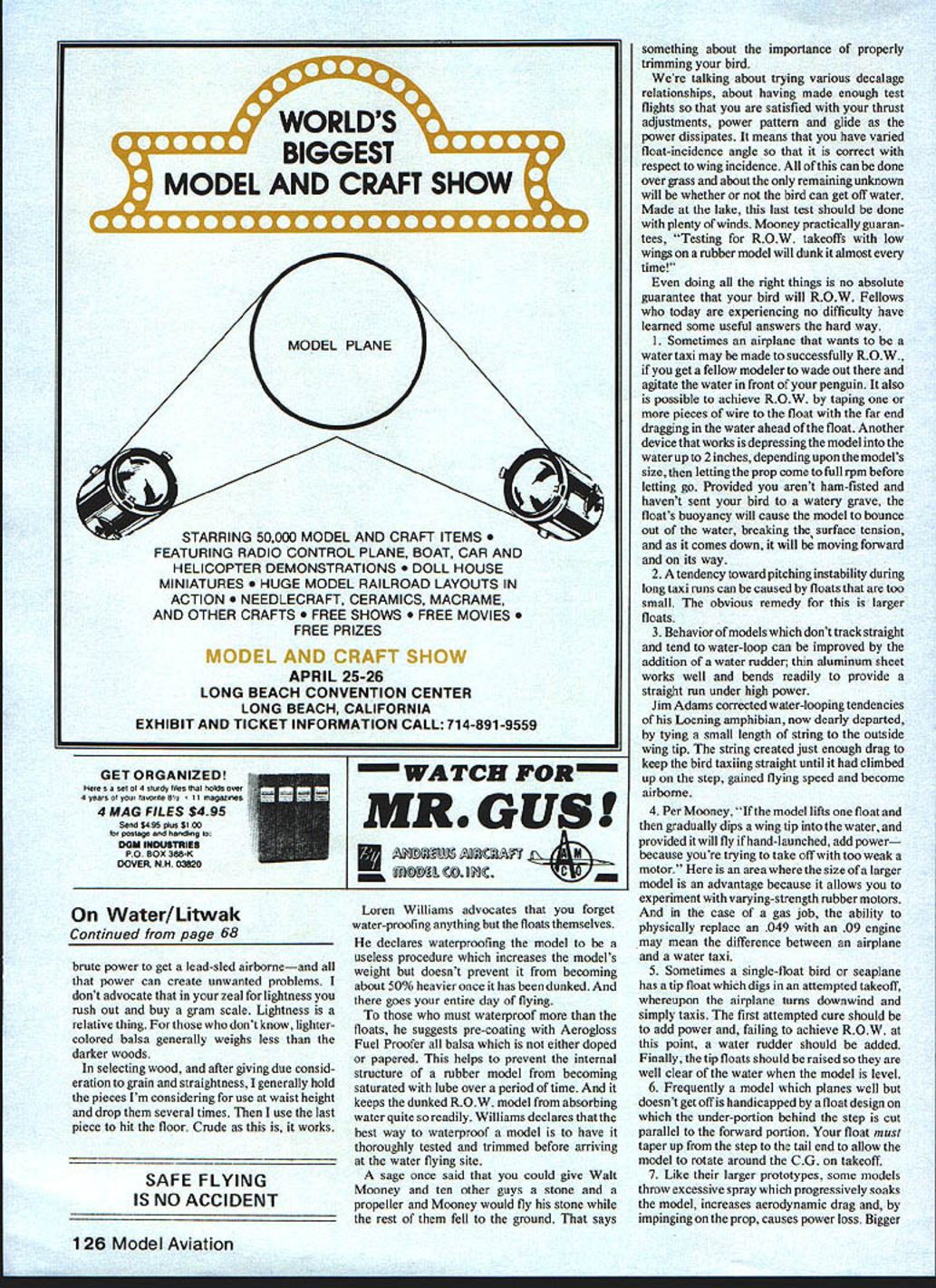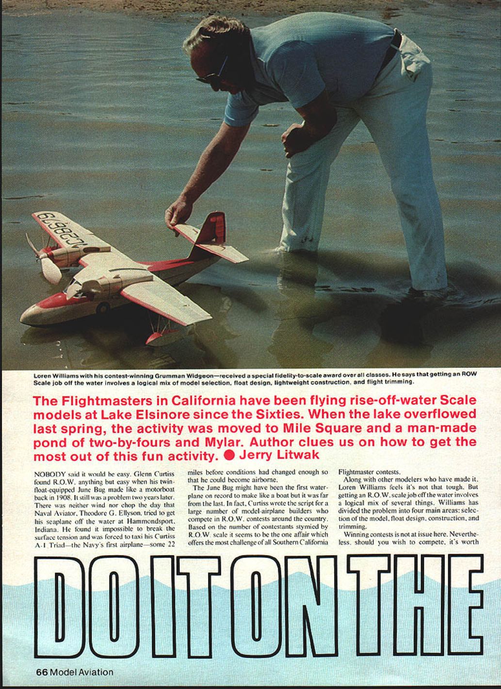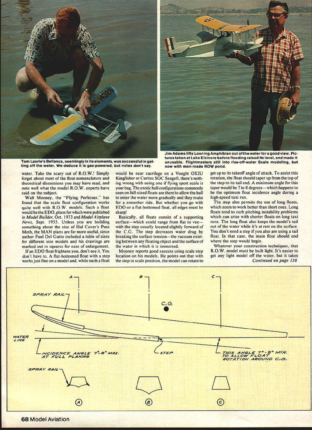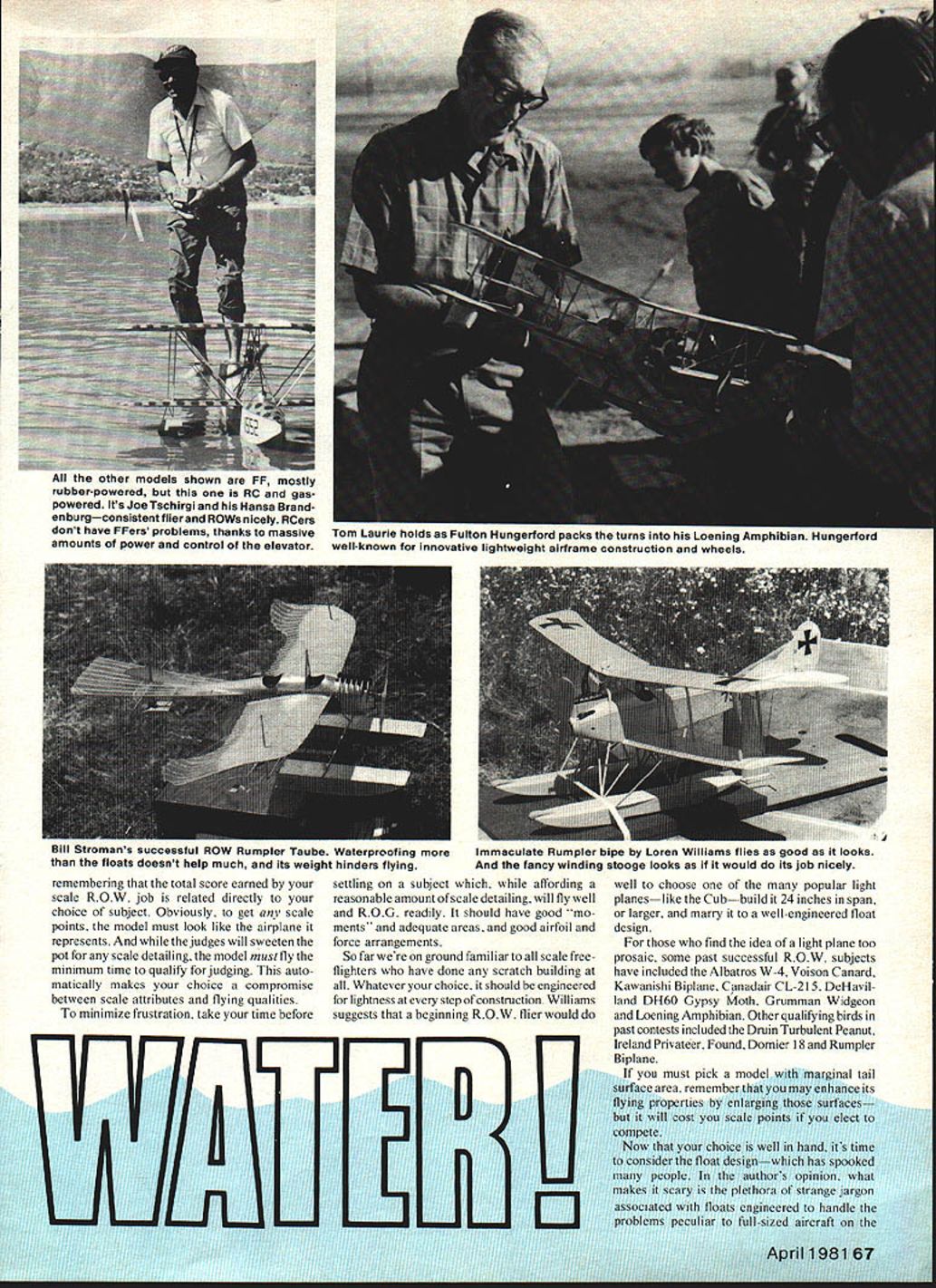 Loren Williams contest-winning Grumman Widgeonreceived special fidelity-to-scale award over classes says getting ROW Scale job off water involves logical mix model selection float design lightweight construction flight trimming Flightmasters California have flying rise-off-water Scale models Lake Elsinore since Sixties lake overflowed last spring activity moved Mile Square man-made pond two-by-fours Mylar Author clues us get out fun activity S Jerry Litwak NOBODY said would easy Glenn Curtiss miles before conditions changed enough Flightmaster contests found ROW anything easy twin could become airborne Along other modelers have made float-equipped June Bug made like motorboat June Bug might have first water- Loren Williams feels ifs tough back 1908 still problem two years later plane record make like boat far getting ROW scale job off water involves neither wind nor chop day last fact Curtiss wrote script a logical mix several things Williams has Naval Aviator Theodore 6 Ellyson tried get large number model-airplane builders divided problem four main areas selec seaplane off water Hammondsport compete ROW contests around country tion model float design construction Indiana found impossible break Based number contestants stymied trimming surfacc tension forced taxi Curtiss ROW scale seems affair Winning contests issue Neverthe A-I Triad thc Navys first airplanesome 22 offersthemostchallengeofall SouthernCalifornia less should wish compete ifs worth 66 Model Aviation 1aU1b aIUWI rr mostiy rubber-~red RC gaspowered Its Joe Tschirgi Hansa Brand enburgconsistent flier ROWs nicely RCers dont have FFers problems thanks massive Tom Laurie holds Fulton Nungerford packs turns Loening Amphibian Hungerford amounts power control elevator well-known innovative lightweight airframe construction wheels remembering total score earned scale ROW job related directly choice subject Obviously get scale points model must look like airplane represents judges will sweeten pot scale detailing model must fly minimum time qualify judging auto matically makes choice compromise between scale attributes flying qualities minimize frustration take time before settling subject affording reasonable amount scale detailing will fly well ROG readily should have good mo ments adequate areas good airfoil force arrangements So far ground familiar scale free fighters have done scratch building Whateveryourchoice should engineered lightness step construction Williams suggests beginning ROW flier would 27Li\ULEE3 U 0 well choose popular light planeslike Cub build 24 inches span larger marry well-engineered float design find idea light plane too prosaic some past successful ROW subjects have included Albatros W-4 Voison Canard Kawanishi Biplane Canadair CL-2 15 DeHavil land DH6O Gypsy Moth Grumman Widgeon Loening Amphibian Other qualitVing birds past contests included Drum Turbulent Peanut Ireland Privateer Found Domier 18 Rumpler Biplane must pick model marginal tail surface area remember may enhance its flying properties enlarging surfaces will cost scale points elect compete Now choice well hand its time consider float designwhich has spooked people authors opinion what makes scary plethora strange jargon associated floats engineered handle problems peculiar full-sized aircraft April1981 67 uiii rromans successtul HOW Bumpier Taube Waterproofing floats doesnt help much its weight hinders flying Immaculate Bumpier bipe Loren Williams riles gooo looks fancy winding stooge looks would its job nicely water Take scary out ROW Simply forget about float nomenclature theoretical discussions may have read note well what model ROW experts have said subject Walt Mooney Flying Perfesser has found scale float configuration works quite well ROW models Such float would EDO plans published Model Builder Oct 1973 Model ane News Sept 1955 Unless building something about size Hal Covers Puss Moth MAN plans far useful since author Paul Del Gatto included table sizes different size models drawings marked out squares ease enlargement EDO float frightens dont use dont have flat-bottomed float step works just fine model such float 1 would near sacrilege Vought 052U Kingfisher Curtiss SOC Seagull theres noth ing wrong using flying sport scale bag exotic hull configurations commonly seen full-sized floats thereto allow hull enter water gradually make smoother ride whether go EDO flat-bottomed float edges must sharp Basically floats consist supporting surfacewhich could range flat vee step usually located slightly forward CO step decreases water drag breaking surface tensionthe vacuum exist ing between floating object surface water immersed Mooney reports good success using scale step location models points out step scale position model can rotate 7 get up its takeoff angle attack assist rotation float should taper up top step its tail end minimum angle taper would 7 8 degreeswhich happens optimum float incidence angle during high-speed taxi run step also permits use long floats seem work better short ones Long floats tend curb pitching instability problems can arise shorter floats long taxi runs long float also keeps models tail out water its rest surface dont need step also using tail float case main float should end step would begin Whatever construction techniques ROW model must built light Its easier get light model off water takes Continued page 126 C WA 7ER ________________________________ L /AE 74IS AAGLE 70-8M/N ro ALLOW ~LOAT O rA TI ON .4eOUAO C OENCa A//EL MAX AT /LL LANING LZ 0 0 68 Model Aviation Lauries Bellanca seemingly itselements successful get ting off water deduce gas-powered notes dont say UC, flUdUIb S UUt iiipii CCI UUL UC 11CC WULUF CUIC UUU VIUW rIG tures taken s Lake lore berure flooding raised its level made unusable Flightmasiers still rise-off-water Scale modeling now man-made ROW pond MODEL AND CRAFT SHOW GET ORGANIZED70R s set ot 4 stsdy $tes hotOs see 4 yeas ot tavonte 8a11 magazines 4 MAG FILES $495 MRGUS DOVER NH 03820U