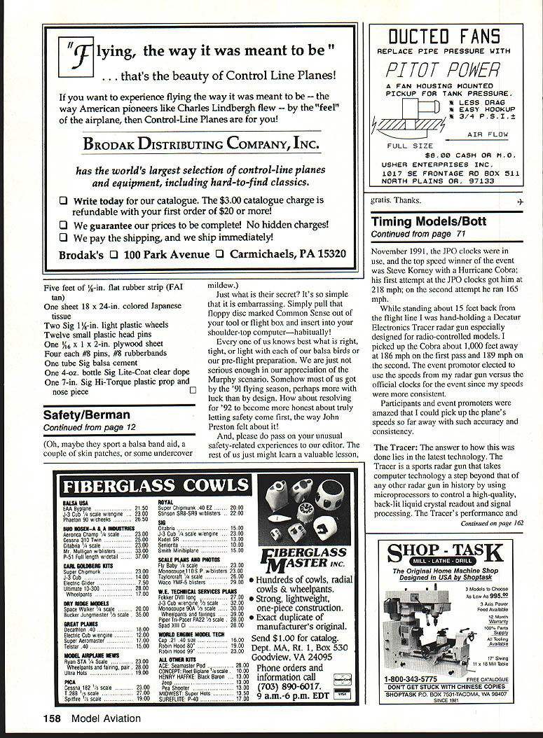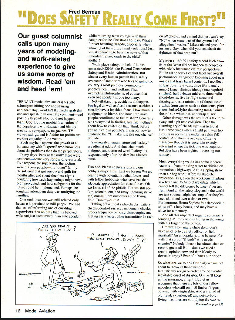 FredBerman V 0 FEI~ guest columnist calls upon years modelingand work-related experience give us some words wisdom Read em heed em ERRANT model airplane crashes schoolyard killing injuring another Boy wouldnt media grab splash over continentand possibly beyond No did happen thank God morbid fascination populace disaster bloody gruc sells newspapers magazines TV viewer ratings fodder politicians seeking empathy voters Such mayhem spawns growth bureaucracy experts know less about problems perpetrators days back mill accidentssome very serious fatal responsible supervisor victims own peoplehis other family suffered gut sorrow guilt months after spent sleepless nights pondering such happenings might have prevented safeguards future could implemented Perhaps toughest subsequent duty notifying families such instance mill related because pertained mill people task informing diligent supervisors duty beloved wife just succumbed auto accident AR REALLY GcAtG Th FLY ThAT returning college daughter Christmas holiday What forever haunting tragedy especially knowing close family relations Just visualize having bear news schoolyard plane crash childs mother Work place safety lack has generated OSHA Federal Occupational Safety Health Administration almost human pursuit has safety overseer some sort tries guard countrys precious commodity peoples health welfare overriding philosophy course accident too Notwithstanding accidents happen legal well fiscal reasons accidents usually have lopsided focus much equipment blame little have people contributed mishap Generally stymied finding sure fire methods about switch think before act chip peoples brains eradicate Ill take just chance attitude Summarily human nature safety arc often odds trite much maligned overused word safety respected after dam has already burst Fun Pleasant diversions hobbys major aims Lest forget dealing potentially lethal forces fellow hobbyists have less adequate appreciation forces Oh know pitfalls still see em tolerate em may lightning strike commit em ourselves flying field Dummy-cisms Taking off radio checks battery checks control surfaces movement checks proper frequency pin discipline engine fueling assurances other transmitters rack O CcxJisG GOT IT 1Ack ~ti4 LAST FLIQ-4T P4T ? off checks mind just cant say No some part system isnt altogether kosher Like nicked prop instance Say did last check tightness prop nut own clubs 91 safety record clean what did happen people AMA insurance claims perspective honesty cannot label overall performance good knowing about near misses trash barrel contents recollect least four fly-aways three fortunately minor finger slicings though required stitches half dozen mid-airs three radio shoot-downs five in-flight structural disintegrations minimum three dozen crashes causes such flameouts pilot errors balsa/Mylar-devouring trees wind shear sun white-out wasp attack Other damage result taxi run away pit area collision alarming cry heads up heard least three times flight path too close seemingly under less full control case Lyme disease though uncertain exactly tick bite acquired deer have sighted traversing runway Most everything has some inherent hazardsfrom drinking water driving nations highways sipping straw air bag wont afford us absolute protection Yes workbench harbors saw teeth X-Acto blade edges cannot tell difference between fiber flesh safety slogans world just much alphabet soup after theyve skimmed over time two Furthermore Homo Sapiens daredevil show-off lazy-bones may have sieve memory imperfect organic software tempting Murphy hiding wings finger button Hmmm clubs dont have effective safety officer field marshall An unpopular job sure sort friends needs enemies Nobody likes admonished second guessed Butdont need second opinion now thwart Murphy hurts pride So what Certainly about throw towel fatalistically resign ourselves eventual inevitable onset disaster Oh well keep up insurance alright let us recognize lots fellow modelers still own 10 limber fingers covered virgin skin myriad old read experienced not-so-bold flying machines still plying ozone Continued page 1S8 12 Model Aviation Five feet A-in flat rubber strip FAL tan sheet 18 x 24-in colored Japanese tissue Two Sig 1 A-in light plastic wheels Twelve small plastic head pins 1/16 x 1 x 2-in plywood sheet Four #8 pins #8 rubberbands tube Sig balsa cement 4-oz bottle Sig Lite-Coat clear dope 7-in Sig Hi-Torque plastic prop nose piece Safety/Berman Continued page 12 Oh maybe sport balsa band aid couple skin patches some undercover BALSA USA EM Byplane2150 J-3Cub /4 scale wfengine23 00 Phueton 90 wcheeks26 50 EarnA & EUSrUB Aeronca Champ 1/4scale2300 Cessna 310 Twin2500 Citabria /4 scale2300 Mr Mulliganwfblisters 3300 P-51 Full lengthw/detail3700 CAN BOLDuIRS KITS Super Chipmunk2300 J-3 Cub1400 Electric Glider750 Ultimate 10-3002800 Wheelpanta17 00 Y EON MIELS Space Walker /4 scale20 00 Bucker Jungmeister scale35 00 BOLAT PUIES Decathlon 401800 Electric Cub wiengine1200 Super Aeromaster1700 Telutar 401500 MCMI AIIPUE EWS Ryan STA /4 Scale23 00 Wheelpants tairing pair28 00 Ultra Hots1900 PICA Cessna 182 /5 scale2300 T28B 1/5 scale2700 Spittire scale1800 mildew Just what secret Its simple embarrassing Simply pull floppy disc marked Common Sense out tool flight box insert shoulder-top computerhabitually us knows best what right tight light balsa birds pre-flight preparation just serious enough appreciation Murphy scenario Somehow us got IZ 91 flying season perhaps luck design about resolving 92 become honest about truly letting safety come first way John Preston felt about please pass unusual safety-related experiences editor rest us just might learn valuable lesson SI Citabria 1500 J-3 Cub /4 scale w/engine . 2300 Kadet SR 1300 Seniurita1000 Smith Minihiplane 1500 SCALE PIIIS AM P110105 Fly Baby scale2300 Monucuspe liOS Fwhlsters2300 Taylorcraft 1/4 scale2600 Wacs YMF-5 hlioters2900 WI TECHnICAL SERVICES PUNS Fukker DVII lung 2700 J-3