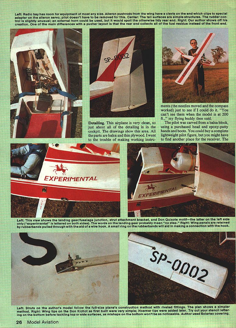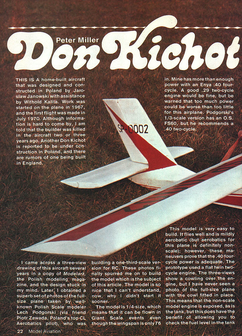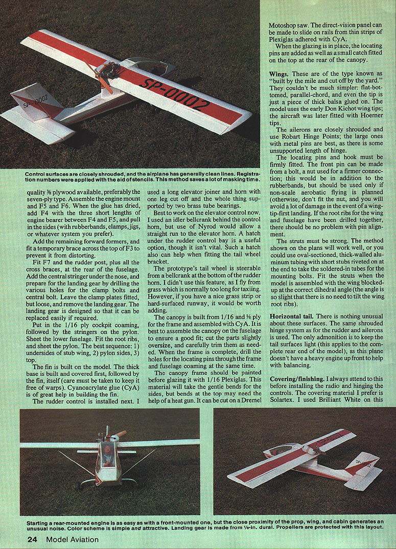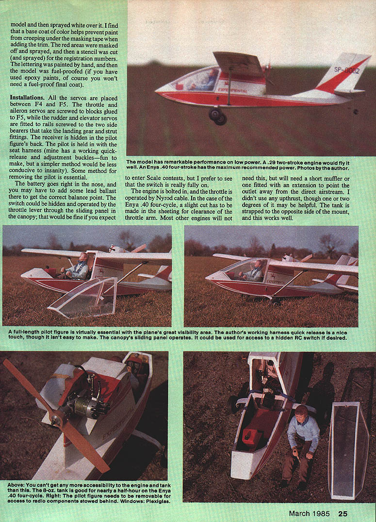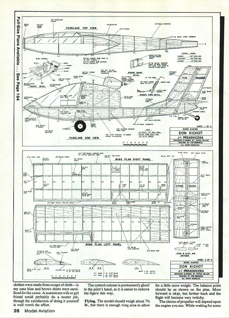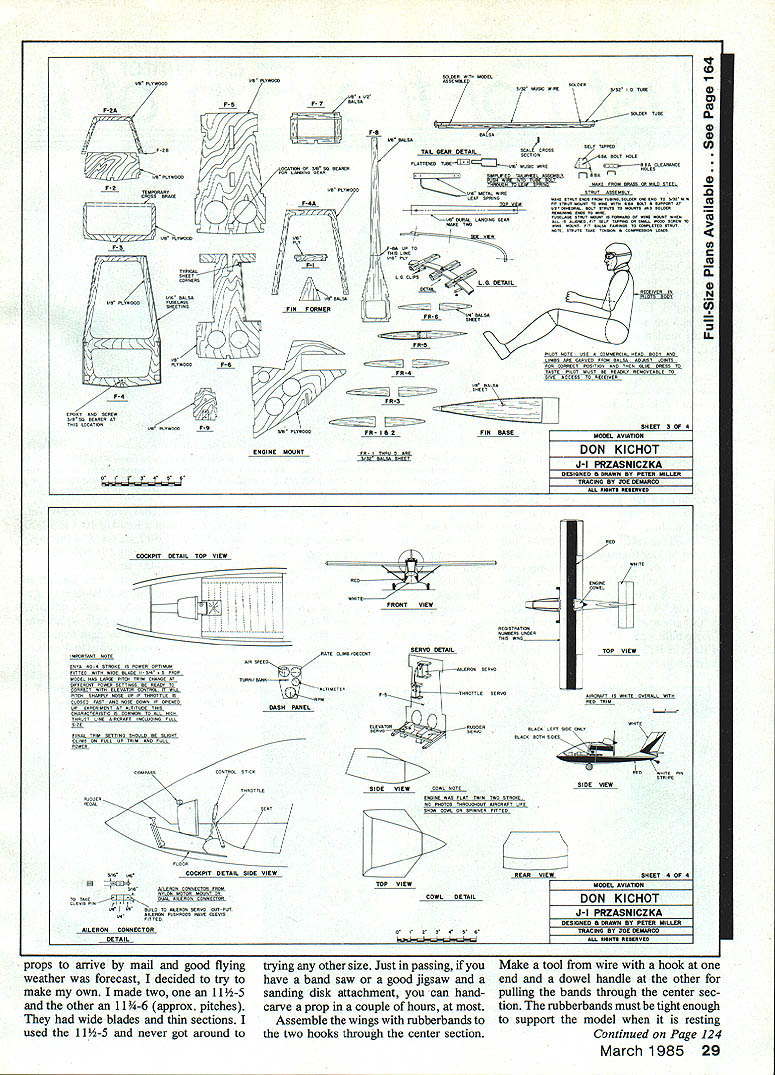 NO OCR TEXT NO OCR TEXT rracaen era * olvwood 4sser * with ie bearer betii sides withri e ren tram d 7 [I ral stringer u e landing g wing athi vere must Snerally C d saves elevator j off thi brass tnt oencran e Ny elei idder cant j~t rank ii t use th norm runwi built ad L& GR tie fran locath elage coan canonv fr taKe rn tads 4 v mereu glazing ed w p r ai mile t mu -chord thick early later ram Hinge 1omts tile nns best thei hinge g pins boa front nut used fc ould sh ,dont nfdam8 gIf have D no pr t must plans Tal-sectiane ig short take soldei tg bolts Fit tha assembled Affect diheora ajanci tces br th i coi used NO OCR TEXT has room t aileron am unusual th main XPERIrIENI Lilathee Thin urn bals ble ruon strut rrds Ia k small rl 5CC II COUJO ao model buddy wwcarvedfro rohased head oats cm flaking Sb%fh% DON KICHOT Peter Miller PLEXIGLA UDDER HORN W BALL CONNECTOR LOCATING PIN5 ALL CONTROL 3URFACES bATWRYINNO5E MOUNTING BOLr8Y4 5Q EALA FRONT SEAT &UPI4OLSTPYSPAR5 10P&BOTfOM FROM DUMMY INSTRUMENT POD A RIBS 3i BALSA SHEET LIA PLY COWIFIT NONE PR RI StB FLY 55150ENOBE K PTCP BOOSSCLeARANCEENGINE MOUNT STOOSBALASS PLOOIOLCASO BEBOOR1104 COcO WAY OLBOBTNETAR COOS WAS IAA SCOOT SESCERWENNE TUBE OWSECTBEARER RODOEN HORN DETAIL// Fl AIN SLACKS//SNRAORALLV flII~4bII .STENSISO CABLES ----~N _ ___-----INNER LAYER I/fl CARD BALSA IAN PLYTONE AAIJBLES ye BALSoESOS NEROIS NOALE OSA SPAN ANE SNIFF PUSSNOO SO RUASER FOLIOS HOBO BUILT PAR FUSELAGE SIDE VIEW 1 B3 4 5 N PLAN RItWT PANEL AEB / S-AN-ANYFTF04FSRN3HAIAHLSNA50RI LAN ELYISOOELAO CASINGE ERLINECALCA / LAS VA AK / ---- -I_ _1zI K KVI CA WANNBALAA 4 COKE OK 3/52MICROS ON 10 OF 3/30 NALSA CALAICS OF 10A BALSA hoK N-I \~ALR1 NOSAF ENCAOAKS ABLON ELOCE II II3/52 NALNA IELEV STAa 5/SICAC ##iII TF I/0 KIII F 1iCAL2IHI I~III -liiiLEE III j NOBAWH OS I/YBNA ANNANA SA ION NA If/O 500 STAN B ELEV RIO PATTERN SHEET S OF 4 MODEL AVIATION DON KICHOT J-t PRZASNICZKA clothes made scraps clothin case blue brown shirts sacri ficed cause seamstress wife girl friend could probably neater job though satisfaction doing yourself well worth effort control column permanently glued pilots hand easier remove figure way Flying model should weigh about 7 lb enough wing area allow little weight balance point should shown plan forward okay farther back flight will become very twitchy choice propeller will depend upon engine use waiting some 28 Model Aviation -n 0 -U m i 0 Cl 0 0 02 Co 0 02 MODEL AVIATION DON KICHOT FAA OAR RALSA LEANINA 0000 / J-I PRZASNICZKA VA PLY WINfl / AC lAND BALSA SNAILINSCACAOSIO.AOINONOCCON I/A IONSOBALCAPOINTBALSA F 0100 SIP I, L WING PLAN LEFT PANEL o Oil N-ON-3 NA ASORUOF NASA NALSA OP I/A BALSA F 25 F-S F-S / 1/00 01 0000FIASECAAE O0WOOOFO F-H 000 P100000F-S CV 0100000 F-S 000004 ROW SO MEASFE ROSA MUSIC WIRESOSB 0 flBE 4000 F7 00CM F-S5CC/CROSS [ITAL GEAR DETAILSEC OS OLATREROC 0000—OZ]~00 U/SCORE rI~C000CCCROBB I/F OC0MCE IF 0E0 ORE F-4A/ /OAF SORSA FN FORMER n FR-N FR-H 0/V PCTMOOO ENGINE MOUNT FR-UFR- S 2FIN SAGE FW-I00BGB 000 SWEET 3 OF 4 MOORS AVIATION DON KICHOT IOESIGGEDSORAWN SR PERKS MILLAR ITRA0/SN0 ST COCSPIT DETAIL TOP VIEW -fr zI ThIS 0SA 010000 0100 0100 SCOnE II S/B SR 0000 GASH PANEL 010 101COCKPIT DETAIL SIDE VIEW MAIlERON OSMECOCO FF00 CST/SM ROTOR 00000 00 00 0000UCE/IS PlOI LO ICC TA AUERS SET/C 0/S-C/C 040110000 PUSOFOCS 0000 01001$ AILERON CONNECTOR DETAIL SIDE 00010000 TOP SIDE VIEW REAR COWLDETAIL GREET 4 OF 4 MODEL AVIATION DON KICHOT IJ-i PRZASNICZKA 1000R5 DESIONED S USAWN ST PETER MILLER TRACING NY SE DEMARCO props arrive mail good flying weather forecast decided try make own made two 11 -5 other 11 -6 approx pitches wide blades thin sections used 11 -5 never got around trying other size Just passing have band saw good jigsaw sanding disk attachment can handcarve prop couple hours Assemble wings rubberbands two hooks through center section Make tool wire hook end dowel handle other pulling bands through center sec tion rubberbands must tight enough support model resting Continued Page 124 March 1985 29 CD 55 G 0 Cu 0 Cu CD 0 Cu 4 U G N U UTSP VIEW Fun/Winter Continued page 121 suggests go flying Bob pelt him foam coffee cups now 10 oclock Ill never make till two goes 52 weeks per year Weather permitting Muse now sprawled over old Min-X GG-1 transmitter Rand actuator making Zs So much art old rig still works adds fuel PP2 mess Lloyd has also talk about building couple pulse rudder/throttle things time machines hesitate As wife says cant go home again can visit neighbors dont take too seriously because also calls Quarter Scale models quarter pounders Well see Sorry thing has gotten completely out hand Gibbs dead-sticks tramps over attempt simple thank letter really what intended have sorry feeling todays RCers aware tantaliz ing mistique small man-made flying things Sportsmen rather modelers rate remind us older kids feeling lost among nutsand-bolts words published. Now hear As fellow member NYRC read great interest ar tide Arcola International Decem ber issue Model Aviation changes field over past year have nothing short amazing majority improvements ie bulletin board re-gravelling parking lot gravel boxes flight line refurbishing transmitter impound flowers reseeding have ac complished stalwart efforts Fred Locks 1984 NVRC vice-president son Sean hardest part labor im mediately evidentthe lobbying funds accomplish feats along others feel labors should acknowledged IS/David Beazley NVRC secretary 1985 Au Fred isa quiet frail guy white hair Ive talked him went about never-ending labors counterparts deserve medal Correction address Frank Macy re-creator Jim Walkers catapult 404 Interceptor other models A-J Fun Pak PO Box 545 Oregon City ORnot shown column last month Also see A-J Fun Pak ads issue flying season ended way began lovely long thermal flight Vagabond Old-Timer Just right lift hold altitude Such inner glow wonders guess Fun Objective Subjective airplane constantly impose will asserts its liberty doing its own bea