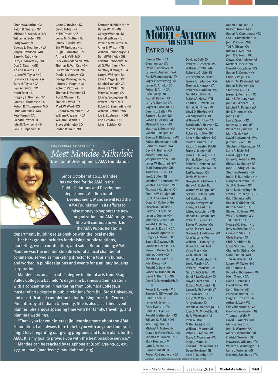 AMA Development team at donations@modelaircraft.org or (800) 435-9262,