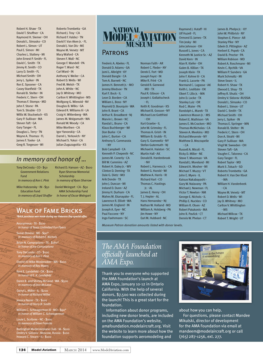 Listed are people and organizations that donated $10 or more in December 2013. These donations are earmarked for AMA’s programs, the National Model Aviation Museum, and the International Aeromodeling Center. If your name is not listed, or if you have questions regarding AMA program support, contact the AMA Development team at donations@modelaircraft.org or (800) 435-9262, extension 277.