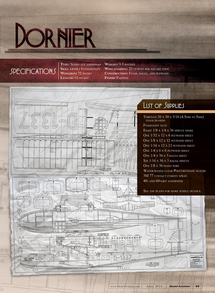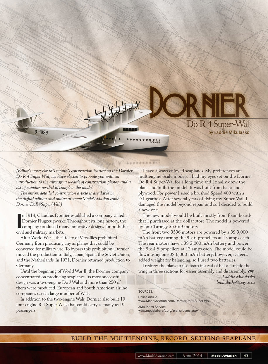 I have always enjoyed seaplanes. My preferences are multiengine scale models. I had my eyes set on the Dornier Do R 4 Super-Wal for a long time and I finally drew the plans and built the model.