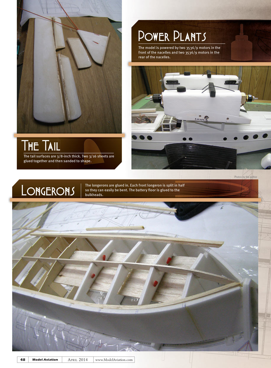 The front 2820 motors are powered by a 3S 5,000 mAh battery turning the 9 x 6 propellers at 23 amps each. The rear motors have a 3S 3,000 mAh battery and power the 9 x 4.5 propellers at 6 amps each. The model could be flown using one battery; however, it needs added weight for balancing, so I used two batteries.