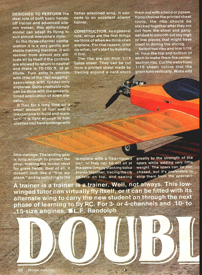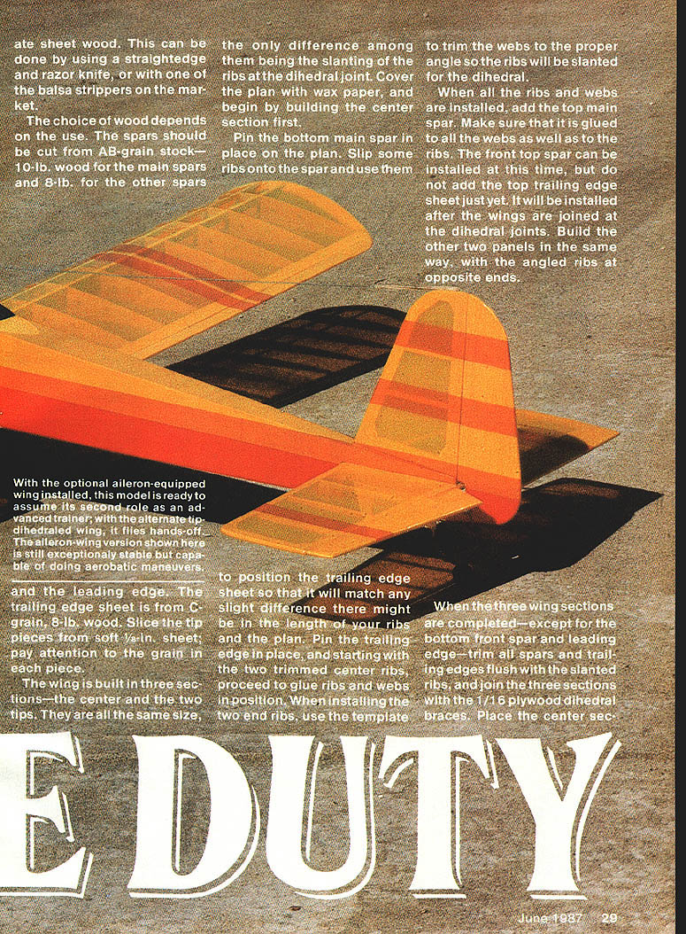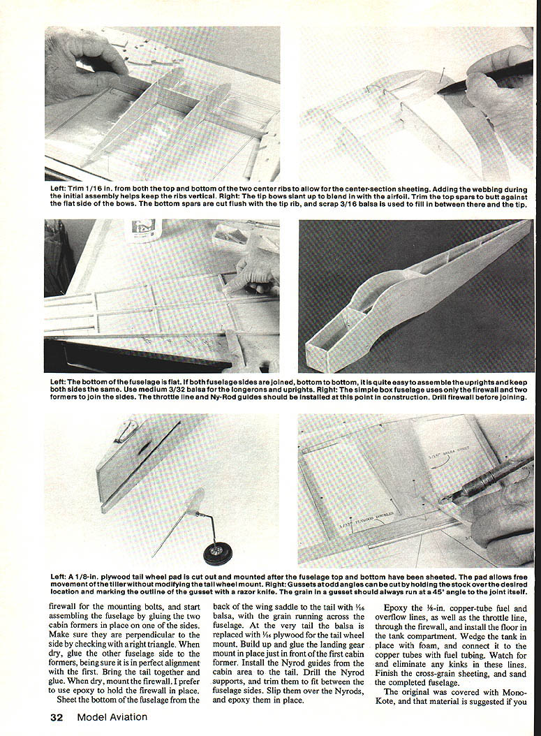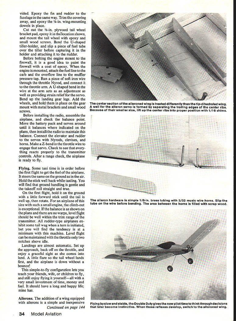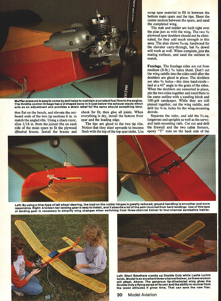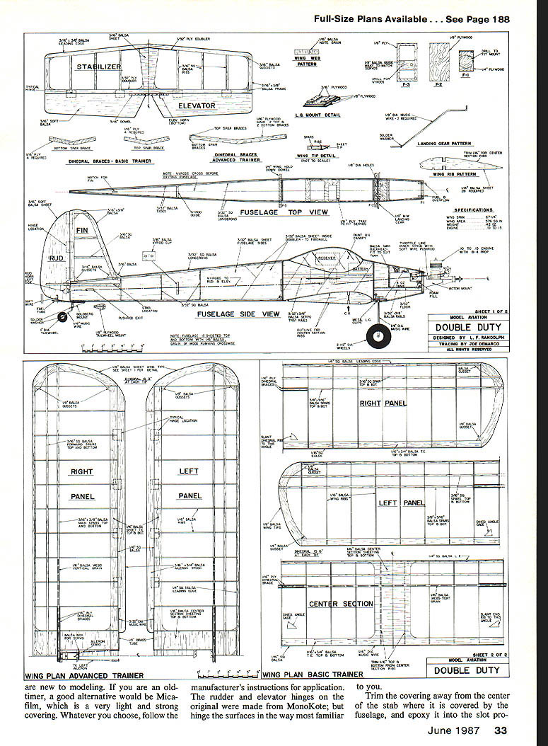 NO OCR TEXT NO OCR TEXT tion flat bench elevate out board ends two tip sections 6 match angled ribs Using sharp razor slice 1/16 joined ribs side main spars fit plywood dihedral braces Install braces check fit glue joints everything dry install bottom front spar leading edge tips glued two tip ribs Notice slant upwards become flush top top spar stubs Use scrap spar material fill between bottom main spars tips Sheet center section between spars sand completed wing stab rudder built right over plan just wing two 2 plywood spar doublers should elimi nated add much strength area plan shows 3/16-sq hardwood elevator carry-through /16 dowel will work well complete join mating surfaces sand outlines match Fuselage fuselage sides cut medium 8-lb /32 balsa sheet Dont cut wing saddle sides until after doublers glued place doublers also 3/n balsathis time hard-stock laid 450 angle grain sides doublers cemented place pin two sides together sand same outline sanding block 100-grit sandpaper still pinned together cut wing saddle drill -in holes wing-mounting dowels Separate sides add 3A2-sq longerons uprights well servoand tank-mounting rails Cut out drill firewall two cabin formers epoxy T nuts back side Left using stiller-type tall wheel steering load rudder hinges greatly reduced ground handling smoother responsive Right torsion bar landing gear easy install absorbs slot pain incurred hard landings Use type landing gear necessary simpilfy wing changes switching three-channel trainer four-channel aerobatics trainer 30 Model Aviation Muffler pressure easyto come helps maintain constantfuel flowto engine throttle control linkage has U-shaped bend just below exhaust stack acts adjustment provides strain relief servo should something bind Left Sherl Smothers cranks up Double Duty Leslie Lunch holds Model lean excellentthree-channeitrainer asthesewomen will attest Above generous tip-dihedraled wing gives Double Duty flying sense Its own abliltyto recoverfrom worst attItudes given time can save new flier 7--z 7-N PL N1 77 7N K 7 7I 1015K Z CrCL NGI N N1 -777--7 - BALSF 3HTU L TUB 0 DIR TPILV4HiL -7--- SQ L0NGR0N5 m AL5R DOUBI~R $HET TOP& BOTTOM BRLSA R~S BALSA SPAR 16 8 roP&BOTTOII N K-K Kr 96 4 7-7- -777 7 7 7p x3 *DIR flJ5IC WIR 3 / Left Trim 1/16 both top bottom two center ribs allow center-section sheeting Adding webbing during Initial assembly helps keep ribs vertical Right tip bows slant up blend airfoil Trim top spars butt against flat side bows bottom spars cut flush tip rib scrap 3/16 balsa used fill between tip Left The bottom fuselage flat both fuselage sides joined bottom bottom isqulte easyto assemblethe uprights keep both sides same Use medium 3/32 balsa forthe longerons uprights Right simple boxfuselage uses onlythe firewall two formers join sides throttle line Ny-Rod guides should installed atthls point construction Drill firewall before joining Left A 18-In plywood tail wheel pad cut out mounted after fuselage top bottom have sheeted pad allows free movement thetillerwithout modifying thetali wheel mount Right Gussets odd angles can cut holding stock overthe desired location marking outline gusset razor knife grain gusset should always run 45 angie joint itself firewall mounting bolts start assembling fuselage gluing two cabin formers place sides Make sure perpendicular side checking right triangle dry glue other fuselage side formers being sure perfect alignment first Bring tail together glue dry mount firewall prefer use epoxy hold firewall place Sheet bottom fuselage back wing saddle tail 6 balsa grain running across fuselage very tail balsa replaced V16 plywood tail wheel mount Build up glue landing gear mount place just front first cabin former Install Nyrod guides cabin area tail Drill Nyrod supports trim fit between fuselage sides Slip over Nyrods epoxy place Epoxy -in copper-tube fuel overflow lines well throttle line through firewall install floor tank compartment Wedge tank place foam connect copper tubes fuel tubing Watch eliminate kinks lines Finish cross-grain sheeting sand completed fuselage original covered Mono Kote material suggested 32 Model Aviation Full-Size Plans Available. See Page 188 316% SIr BALSASILtEDL3M PlY DOUBLER STA ILIZEN TYPICALS/15 510 TINGEBALSA FRMBE 016 BALSA WING WEB BOTTERN _BAF 110 BALjB0J 3/BWONLF ELEVATOR 3/IN DOEDT/10 DODD DORN BALSABOTTOM I/IS PLY V0 PLY DIHEDRAL BRACES BASIC TRAINER D/B NUOT RUD RODSV 1 WIREa TELSTAB TARESCREATION ROtORPASOEDIT WASIORC1NREISE TOILMOBAL110 PLYWOOD LA MOSINT DETAIL I/O PLYWOOD DIHEDRAL BRACESWING TIP DETAIL ADVANCED TRAINERDOT TO STOLE LS REDO DOLO 5/30 BALSO SIDESOROD 110 MA DOLES LANGEAR PATTERN TRIM PIN POD COSTED W RB RIB BOTTERN I/B BALSA NREET /7 I/IFSFL BALSAS/TO 60FUSELAGETOP VIEWL~\IYS BW ARSOEDOSSI/N PLY TRAYLANDING II\TO FIT FIN SAN DO 3/16 NALNAS/SO BALOM SLEETOOJSLER TO PIDEWOLLCARDED NYROD SATFUSELAGE ODORTODOSTLE LPSE NABEDEAR-SOFT ORE PUWIRODID TO IS EBSINE 3/TA SA WALSA.---PIT TO SAIDB-I PREP RECEIVER/ LARSUDROSSTONEA RALSA/3/TO RALSA STEED ISSIOEDOISY 00 S/IN BALSATAE BALSA ASSETS/TTERTSM 7 MCEST VIEWSASO510CSTATO%SRGREET DF S DO WAIBfI ~BLE DUTY OUTLINE FARTBASIC WIRE _TRAYRAILS/ RIBSDESISIED BY F RANDOLPH O 10 DIATRACING BY OE DEMARCO ________________________WREELS .aa Wt 0IA 3 43 0 3/TA NA BALSA FUSELAGE SIDE SPECIFICATIONS *160 SF60NT-lAO MODEL AVIATION /7 7 BALSA AG OS E T S r S -TANSA BALSAL POSNAPASFADS TOP 0100 PATTON RIGHT PANEL 3/B BALSA MAPS STUBS DDE AND BOTTOM 116 BALSA DENS . AERTISAL ORAlS PLY DIOEADAL MACES \ / lAIr BALGO1 SPEED TEI 3/SO Cod BDJSICAL I/B B00551 DALSO OUSOEDS TYPICAL DINGE LOCATION LEFT V ANEL I/IN BALSA RIDS Ir 3/A RALSA AILSOUS STOCK I/4DO MALSA. LEARPG EDAD lAD BALSA CENTER SECTION SOEEDIDO DDE N BOTTOM NALO BOOIll \OLERON III TON SERYOI WING PLAN ADVANCED TRAINER new modeling oldtimer good alternative would Micafilm very light strong covering Whatever choose follow lli AM PLY IB 3/IN60 TOP NBOTfl RIGHT PANEL 110 BALSA /660165/5 BALSA TE BALSAN PATTON BALSA SEN