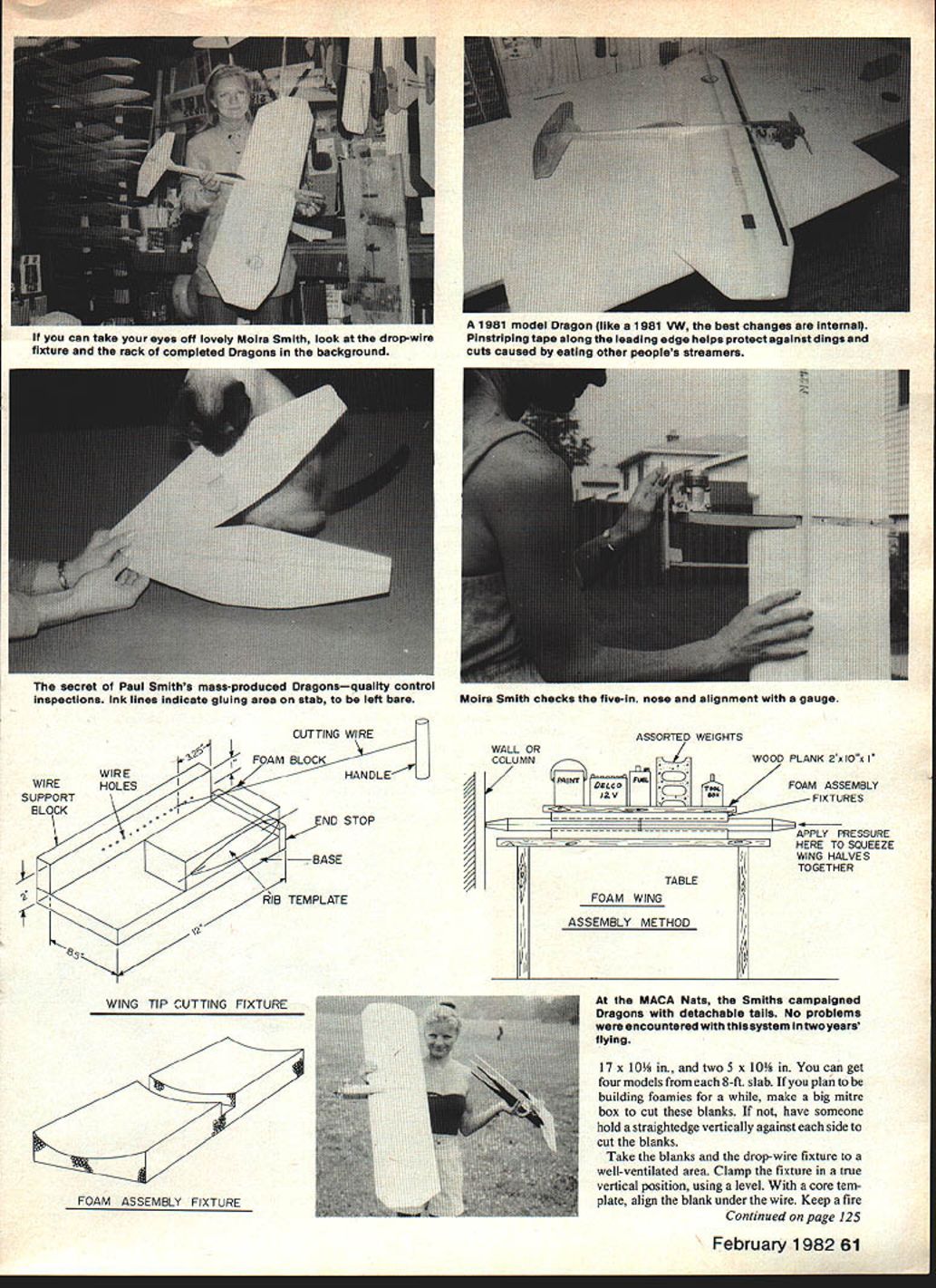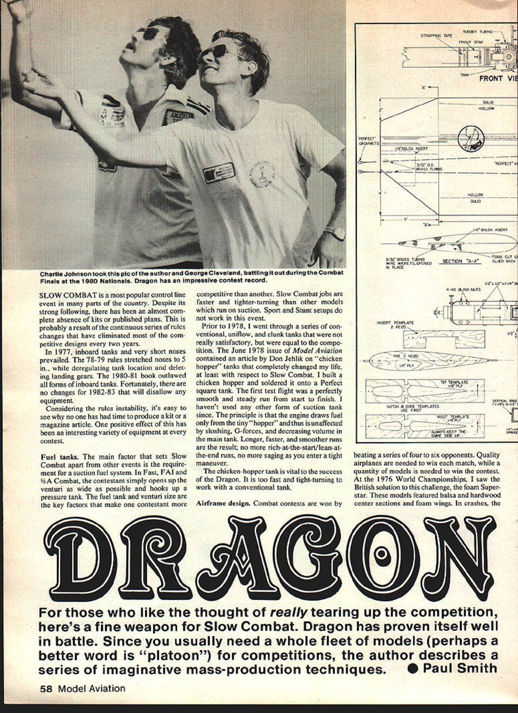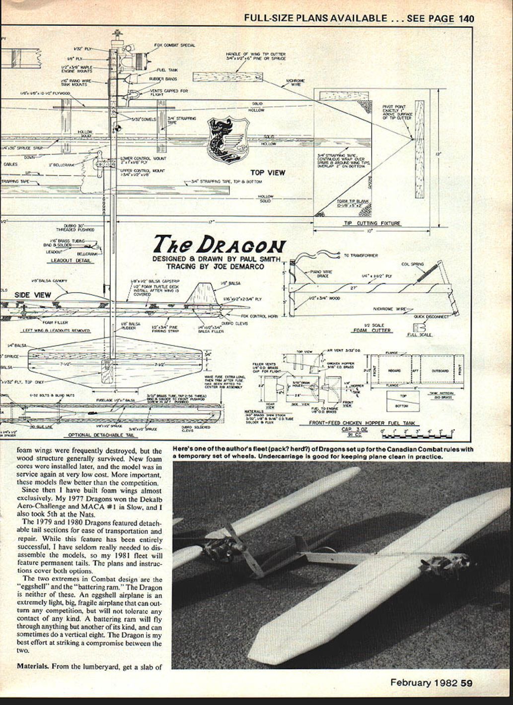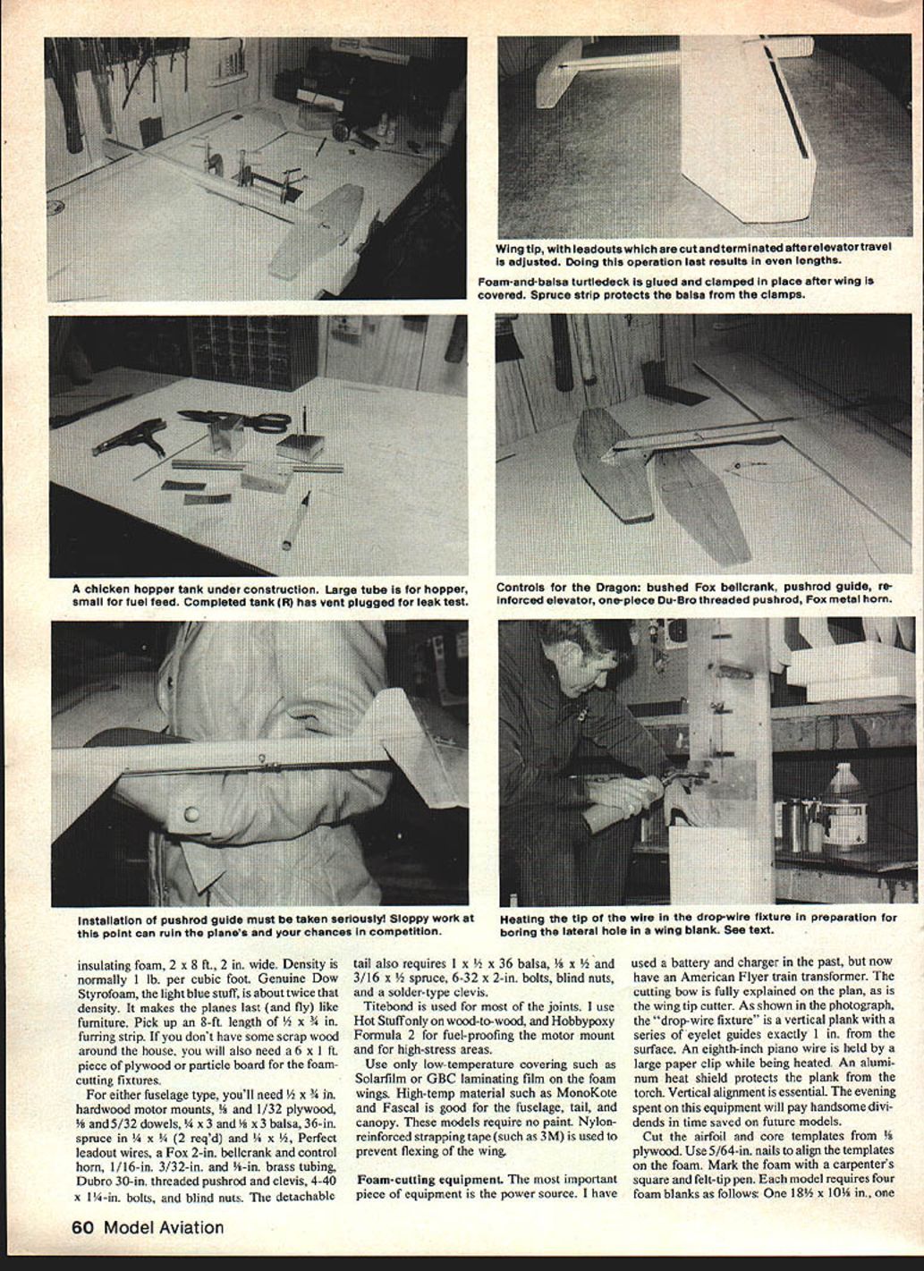 SLOW COMBAT popular control line event parts country Despite its strong following has almost com plete absence kits published plans probably result continuous series rules changes have eliminated coin petitive designs two years 1977 inboard tanks very short noses prevailed 7 8-79 rules stretched noses 5 deregulating tank location delet ing landing gears 1980-81 book outlawed forms inboard tanks Fortunately no changes 1982-83 will disallow equipment Considering rules instability its easy see no has time produce kit magazine article positive effect has interesting variety equipment contest Fuel tanks main factor sets Slow Combat apart other events require ment suction fuel system Fast FAI Combat contestant simply opens up venturi wide possible hooks up pressure tank fuel tank venturi size key factors make contestant competitive another Slow Combat jobs faster tighter-turning other models run suction Sport Stunt setups work event Prior 1978 went through series con ventional uniflow clunk tanks really satisfactory equal compe tition June 1978 issue Model Aviation contained article Don Jehlik chicken hopper tanks completely changed life least respect Slow Combat built chicken hopper soldered onto Perfect square tank first test flight perfectly smooth steady run start finish havent used other form suction tank since principle engine draws fuel tiny hopper thus unaffected sloshing G-forces decreasing volume main tank Longer faster smoother runs result no rich-at-the-start/lean-atthe-end runs no saging enter tight maneuver chicken-hopper tank vital success Dragon too fast tight-turning work conventional tank Airframe design Combat contests won RUBRER TUBING STRAPPING TERE FRONT SPON ITTI TANK FRONT VII SOLID HOLLOW RORFECT UROMMET I/GNALSA INSERT PERFECT H DO L LOW SLUG 5 BALSA INSERT FOAM CUT 0 332 BRASS TONINGSECTrON A-AOWED ROCK WIRE WICKETS EPOGIED IN PLACE INSERT TEMPLATE 2 BEER RIB 0 REOD -VA PLY I2 I2 I-V4 B A-AG BLIND NOTS V2 F TIP TEMPLATE IB PLF NOTCH CSRE TEMPLATES OSE FIROT P OR PLY 714ROOT TEMPLATE ALAWYS KEEP TIE ISAME SIRE OP I4 VA beating series four six opponents Quality airplanes needed win match quantity models needed win contest 1976 World Championships saw British solution challenge foam Super star models featured balsa hardwood center sections foam wings crashes 4 like thought really tearing up competition heres fine weapon Slow Combat Dragon has proven itself well battle Since usually need whole fleet models perhaps better word platoon competitions author describes series imaginative mass-production techniques Smith 58 Model Aviation ar JOhnsOfltOOK ipic55 101I.levulano uauuflguxc Finals 1980 Nationals uragon nas Impressive contest record FULL-SIZE PLANSAVAILABLE SEE PAGE 140 IR PLY ENIDRE MEER2TS VIE P53/JO 53/RE 1222 MEUSTS I/BEI-VBs 10-02 PLYWOLO IIH HOLW# 6 SPRUCE SPAR CAREES2 BELLCRAMn- - RAPPENG TAPE D5IBRO 30 TPREAOED PUSHROD 1/16 BRASS TUBING RING LEADOUTREUCRANI LEADOUT DETAIL 08 BALSA CANOPY LS SIDE VIEW ONWA SPE AL NO BSAOU PPE GH HANRE OP WING TIP CUTTER 3/As 2/2 P82 OR SPRUCE -NICI-WSRE WIRE Iii ill________ ROLLOW /A STRASPENG TAPE JI HALLOW Li LOWER CONTROL MOUNT 2I I/B PLY UPPER COESTROL MCERJT -3/An I/O I/B TOP VIEW UTRAPPNS TAPE TOP BOTTOM HALLOW ROLlS IS TA6 DRAOoN DESIGN ED 8 DRAWN BY PAUL SMITHTO TR22ASFURMER TRACING BY JOE DEMARCOTPANS WIPECCL URUNG BRUCEI/A I-I/O PLY I/As 02 BALSA CAPUTRIP 10 FOAM TURCOE CECICI/B BALSA 01 INSTALL AFTER WINS ISV COVERED I/RV2s2-3R PLYII/SS 3/A WOOD {NICRROME FOS COUTROL HORNSAEK ASEONNECT OURRO CLEVOI/S SCSLE VAEI/O33/AFOAM CUTTEIiI BALSA FELERFULL UCRLE ~FOAM FILLER5R BALSA DDER1/03/A PINE I/A BALSAFIRRING LEFT WING B LEADOETS REMOVESTRIP SPRACE-zz---~-3/A ALSA MARE PEWS EXTRA LEEB TREN TREE AFTER FUSE El/SO PLYTOP ORLYsB BEEN FF1150 TA EEBTER WE BEETS BNUTS3/32 ERASE TUBE TAP 2-SB TEBEAB POWLARE I25 BELSABAR B SOLEER RE EBEEST FLRARUE SOREW B AFT FURWEB BI VBELVSFROEV S/BEllS SF5588 OPTIONAL DETACHABLE TAIL foam wings frequently destroyed wood structure generally survived New foam cores installed later model service again very low cost important models flew better competition Since have built foam wings almost exclusively 1977 Dragons won Dekalb Aero-Challenge MACA #1 Slow also took 5th Nats 1979 1980 Dragons featured detach able tail sections ease transportation repair feature has entirely successful have seldom really needed dis assemble models 1981 fleet will feature permanent tails plans instruc tions cover both options two extremes Combat design eggshell3 battering ram Dragon neither An eggshell airplane extremely light big fragile airplane can Out turn competition will tolerate contact kind battering ram will fly through anything another its kind can sometimes vertical eight Dragon best effort striking compromise between two Materials lumberyard get slab PIVOT PONT A EXACTLY UBOVE URFATE UF TIP cUTTER ____7 3/A STRAPPENG TAPE/ CONTINUOUS WRAP OVER SPARS B AROUND WIND TIPS OVERLAP 0 ON BOTTOM FOAM TIP AL/OAR TIP CUTTING FIXTURE FOP VIEWAER AENT 3/3200 T1 IITB P1LEER ARMSOEEEEEE PEPPER LS AR BRASS- P/IS AD BRASS5 5P FLISETA0VUTBOPES0 3/32/WA111 22 AELES VIEWBEt UIE BR A55 5PM STREP 3/32. I/BS 9/IS PA TUBE BROWS B PEASR NPPER FUEL TANK Heres authors fleet pack herd Dragons set upforthe Canadian Combat ruleawith amrtnrcnr cot wkoola IndavaorvIoao So annA far manS na alone Ion Sn nroain insulating foam 2 x 8 ft 2 wide Density normally 1 lb per cubic foot Genuine Dow Styrofoam light blue stuff about twice density makes planes last fly like furniture Pick up 8-ft length urring strip dont have some scrap wood around house will also need 6 x 1 ft piece plywood particle board foamcutting fixtures either fuselage type youll need 4 hardwood motor mounts plywood 5/32 dowels x 3 balsa 36-in spruce / x qd erfect leadout wires Fox 2-in bellcrank control horn 1/16-in 3/32-in -in brass tubing Dubro 30-in threaded pushrod clevis 4-40 x l-in bolts blind nuts detachable tail also requires 1 x balsa /16 x ce 6-32 x 2-in bolts blind 