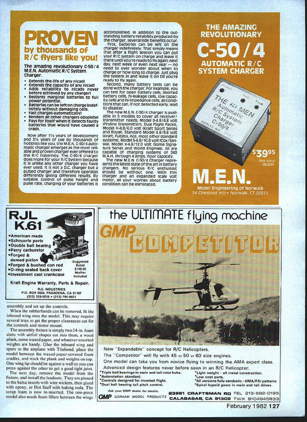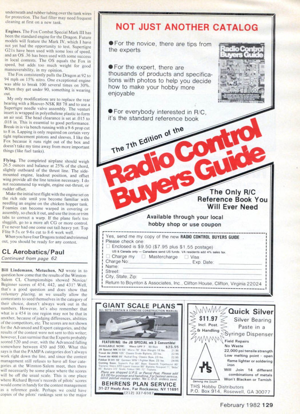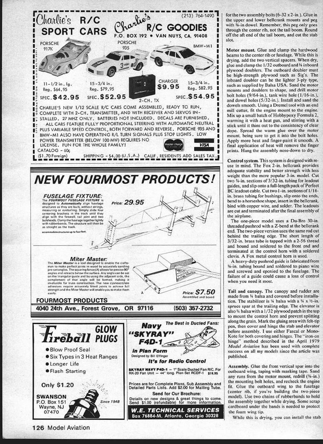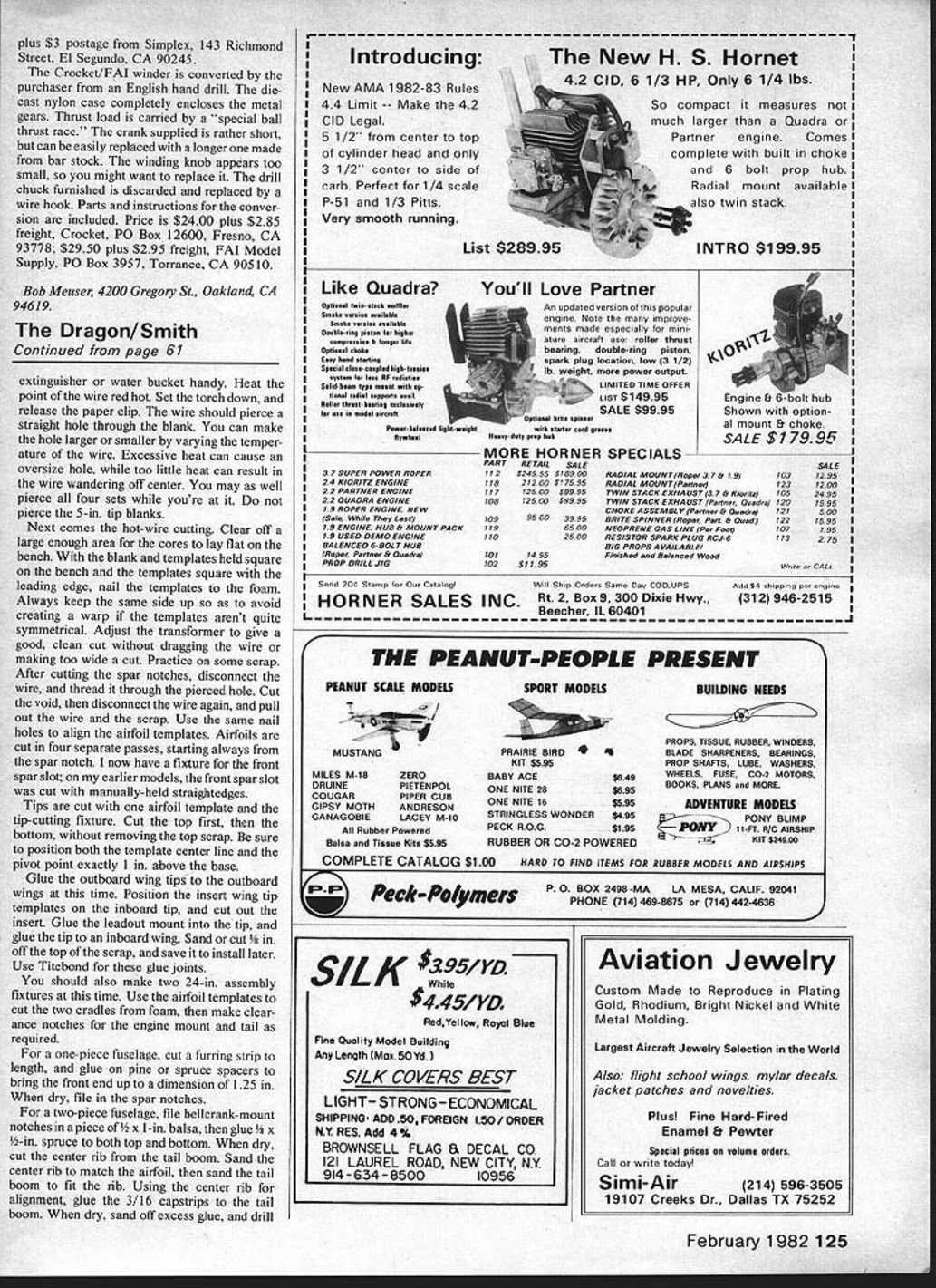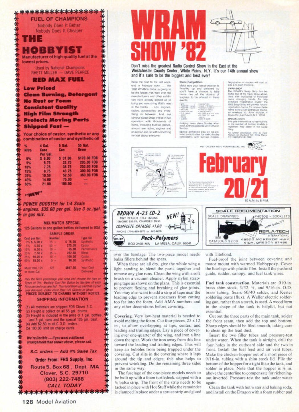 SLOW COMBAT popular control line event parts country Despite its strong following has almost com plete absence kits published plans probably result continuous series rules changes have eliminated coin petitive designs two years 1977 inboard tanks very short noses prevailed 7 8-79 rules stretched noses 5 deregulating tank location delet ing landing gears 1980-81 book outlawed forms inboard tanks Fortunately no changes 1982-83 will disallow equipment Considering rules instability its easy see no has time produce kit magazine article positive effect has interesting variety equipment contest Fuel tanks main factor sets Slow Combat apart other events require ment suction fuel system Fast FAI Combat contestant simply opens up venturi wide possible hooks up pressure tank fuel tank venturi size key factors make contestant competitive another Slow Combat jobs faster tighter-turning other models run suction Sport Stunt setups work event Prior 1978 went through series con ventional uniflow clunk tanks really satisfactory equal compe tition June 1978 issue Model Aviation contained article Don Jehlik chicken hopper tanks completely changed life least respect Slow Combat built chicken hopper soldered onto Perfect square tank first test flight perfectly smooth steady run start finish havent used other form suction tank since principle engine draws fuel tiny hopper thus unaffected sloshing G-forces decreasing volume main tank Longer faster smoother runs result no rich-at-the-start/lean-atthe-end runs no saging enter tight maneuver chicken-hopper tank vital success Dragon too fast tight-turning work conventional tank Airframe design Combat contests won RUBRER TUBING STRAPPING TERE FRONT SPON ITTI TANK FRONT VII SOLID HOLLOW RORFECT UROMMET I/GNALSA INSERT PERFECT H DO L LOW SLUG 5 BALSA INSERT FOAM CUT 0 332 BRASS TONINGSECTrON A-AOWED ROCK WIRE WICKETS EPOGIED IN PLACE INSERT TEMPLATE 2 BEER RIB 0 REOD -VA PLY I2 I2 I-V4 B A-AG BLIND NOTS V2 F TIP TEMPLATE IB PLF NOTCH CSRE TEMPLATES OSE FIROT P OR PLY 714ROOT TEMPLATE ALAWYS KEEP TIE ISAME SIRE OP I4 VA beating series four six opponents Quality airplanes needed win match quantity models needed win contest 1976 World Championships saw British solution challenge foam Super star models featured balsa hardwood center sections foam wings crashes 4 like thought really tearing up competition heres fine weapon Slow Combat Dragon has proven itself well battle Since usually need whole fleet models perhaps better word platoon competitions author describes series imaginative mass-production techniques Smith 58 Model Aviation ar JOhnsOfltOOK ipic55 101I.levulano uauuflguxc Finals 1980 Nationals uragon nas Impressive contest record FULL-SIZE PLANSAVAILABLE SEE PAGE 140 IR PLY ENIDRE MEER2TS VIE P53/JO 53/RE 1222 MEUSTS I/BEI-VBs 10-02 PLYWOLO IIH HOLW# 6 SPRUCE SPAR CAREES2 BELLCRAMn- - RAPPENG TAPE D5IBRO 30 TPREAOED PUSHROD 1/16 BRASS TUBING RING LEADOUTREUCRANI LEADOUT DETAIL 08 BALSA CANOPY LS SIDE VIEW ONWA SPE AL NO BSAOU PPE GH HANRE OP WING TIP CUTTER 3/As 2/2 P82 OR SPRUCE -NICI-WSRE WIRE Iii ill________ ROLLOW /A STRASPENG TAPE JI HALLOW Li LOWER CONTROL MOUNT 2I I/B PLY UPPER COESTROL MCERJT -3/An I/O I/B TOP VIEW UTRAPPNS TAPE TOP BOTTOM HALLOW ROLlS IS TA6 DRAOoN DESIGN ED 8 DRAWN BY PAUL SMITHTO TR22ASFURMER TRACING BY JOE DEMARCOTPANS WIPECCL URUNG BRUCEI/A I-I/O PLY I/As 02 BALSA CAPUTRIP 10 FOAM TURCOE CECICI/B BALSA 01 INSTALL AFTER WINS ISV COVERED I/RV2s2-3R PLYII/SS 3/A WOOD {NICRROME FOS COUTROL HORNSAEK ASEONNECT OURRO CLEVOI/S SCSLE VAEI/O33/AFOAM CUTTEIiI BALSA FELERFULL UCRLE ~FOAM FILLER5R BALSA DDER1/03/A PINE I/A BALSAFIRRING LEFT WING B LEADOETS REMOVESTRIP SPRACE-zz---~-3/A ALSA MARE PEWS EXTRA LEEB TREN TREE AFTER FUSE El/SO PLYTOP ORLYsB BEEN FF1150 TA EEBTER WE BEETS BNUTS3/32 ERASE TUBE TAP 2-SB TEBEAB POWLARE I25 BELSABAR B SOLEER RE EBEEST FLRARUE SOREW B AFT FURWEB BI VBELVSFROEV S/BEllS SF5588 OPTIONAL DETACHABLE TAIL foam wings frequently destroyed wood structure generally survived New foam cores installed later model service again very low cost important models flew better competition Since have built foam wings almost exclusively 1977 Dragons won Dekalb Aero-Challenge MACA #1 Slow also took 5th Nats 1979 1980 Dragons featured detach able tail sections ease transportation repair feature has entirely successful have seldom really needed dis assemble models 1981 fleet will feature permanent tails plans instruc tions cover both options two extremes Combat design eggshell3 battering ram Dragon neither An eggshell airplane extremely light big fragile airplane can Out turn competition will tolerate contact kind battering ram will fly through anything another its kind can sometimes vertical eight Dragon best effort striking compromise between two Materials lumberyard get slab PIVOT PONT A EXACTLY UBOVE URFATE UF TIP cUTTER ____7 3/A STRAPPENG TAPE/ CONTINUOUS WRAP OVER SPARS B AROUND WIND TIPS OVERLAP 0 ON BOTTOM FOAM TIP AL/OAR TIP CUTTING FIXTURE FOP VIEWAER AENT 3/3200 T1 IITB P1LEER ARMSOEEEEEE PEPPER LS AR BRASS- P/IS AD BRASS5 5P FLISETA0VUTBOPES0 3/32/WA111 22 AELES VIEWBEt UIE BR A55 5PM STREP 3/32. I/BS 9/IS PA TUBE BROWS B PEASR NPPER FUEL TANK Heres authors fleet pack herd Dragons set upforthe Canadian Combat ruleawith amrtnrcnr cot wkoola IndavaorvIoao So annA far manS na alone Ion Sn nroain insulating foam 2 x 8 ft 2 wide Density normally 1 lb per cubic foot Genuine Dow Styrofoam light blue stuff about twice density makes planes last fly like furniture Pick up 8-ft length urring strip dont have some scrap wood around house will also need 6 x 1 ft piece plywood particle board foamcutting fixtures either fuselage type youll need 4 hardwood motor mounts plywood 5/32 dowels x 3 balsa 36-in spruce / x qd erfect leadout wires Fox 2-in bellcrank control horn 1/16-in 3/32-in -in brass tubing Dubro 30-in threaded pushrod clevis 4-40 x l-in bolts blind nuts detachable tail also requires 1 x balsa /16 x ce 6-32 x 2-in bolts blind 
