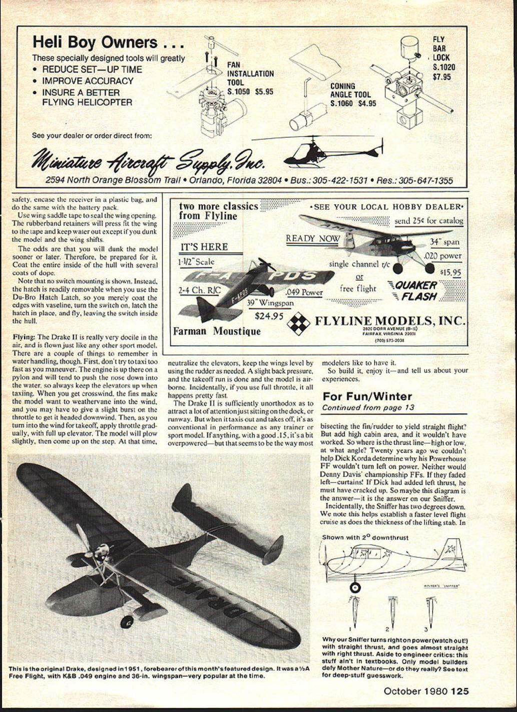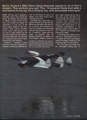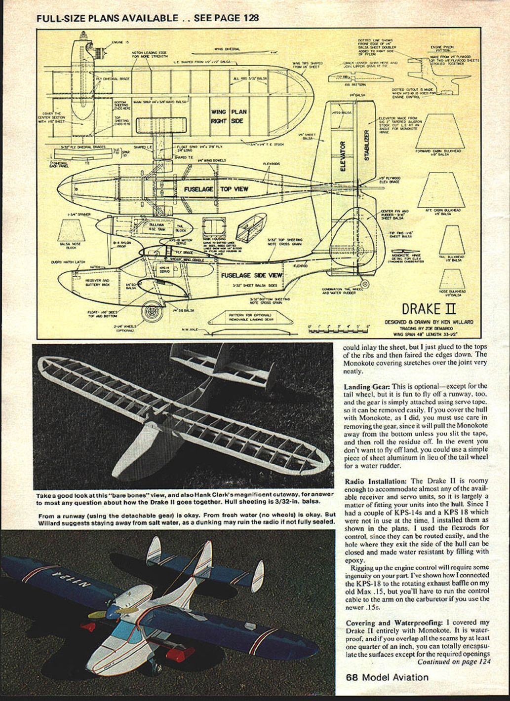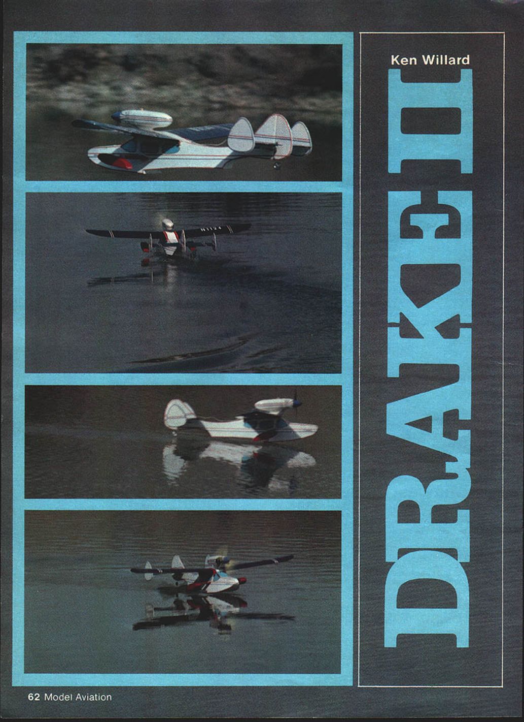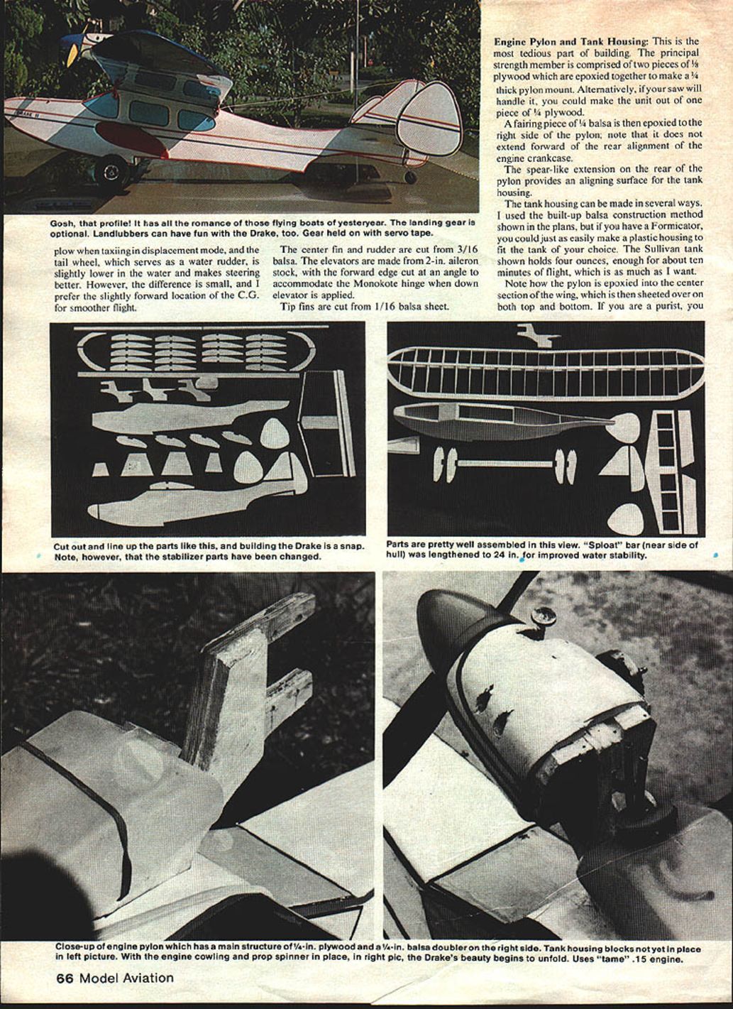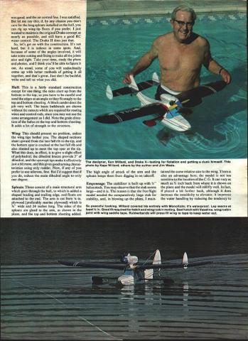 NO OCR TEXT NO OCR TEXT tached flight finebut almost free flight triple fins made directionally stable rudder barely able make model turn So took home enlarged rudder put maximum traveL Max 15 used power same engine Honcho Gasser won Intermediate Class championship aerobatics 1959 Nats engine two years old 22-year-old Max smoothest operating engines ever built 8-inch diameter 4-inch pitch prop revs up 12000 idles down reliably 3000 rpmbetterthan todays versions Since idle reliable ran swimming pool check flotation water triple tail gives Drake II special airsomething like old Boeing 314 FlyIng Boat Lockheed ConstellatIon Beilanca Cruiser Truly middle fin simply easy rudder operation handling looked great So out lake fly off water Youd think now could take test flights new designeven new version old designin stride Nope still get nervous Item have retrieval boat seven feet long three half feet wide Its plastic light very maneuverableif remember take two oars took Another example comes up bit later slight breeze blowing making nice ripple water friends Jim Wade Ilan Kroo helping fired up Max 15 set Drake II water started taxi out Right knew needed further modification As turned crosswind down wind wing tip went water sploats didnt provide enough flotation call sploats because theyre wing-tip floats nor really sponsons thats hybrid name comes time remembered flying free flight flying boats dont have engine control takeoff made holding model headed wind slightly quartering wind right moves forward turns wind takes off Anyway finally got position quartering wind gave throttle took off left water already turned slightly crosswind left rudder still effective enough wind got under right wing dumped Drake II drink Blast Ilan accomplished canoeist oar got out model retrieved damage broken arm left sploat radio got wet Several times Ive asked dont recommend flying off salt water reason simple dont have radio fully encap sulated wont get wet salt water will ruin Fresh water will temporarily short out get fast blow dry let sit sun usually can get back operation about hour thats what did radio drying out repaired broken arm Hot Stuff didnt have microballoons baking soda used plain old dusty dirt worked too Finally everything ready try number two going hand launch since knew couldnt handle cross wind wind died down another takeoff seemed worth trying engine dried out ran fine han put Drake II water taxied out nicely no wind guided Out near center lake suddenly engine went full throttle model took off turned left dumped drink again Blast As said earlier youd think wouldnt get nervous No Well can tell radio range reduced considerably particularly surface forget extend transmitter antenna So once again drying out another try since still calm third time charm saying goes Drake II took off fine flight didnt press luck further Just went home Once back shop modified sploats extending out 15 inches overall 24 inches 12 inches out side center line thought about giving up design concept going tip floats looked like might job still keep unusual configuration did few days later agaln went out several successful test flights Water handling 64 Model Aviation iut inc iaiiwneei wneiner wiii ue water wet stuff acts water rudder dont plan fly land could substitute sheet aluminum wrniiara cairns em -spoats because theyre wing tip floats nor really sponsons lengthen spread 15 shown 24 gave enough leverage good air control fine satisfied let say chance dont care long sploats installed hull can rig up wing-tip floats prefer just wanted maintain original Drake concept nearly possible still have good RC water control Drake II does just So lets get construction Its hard tedious some spots because some angles involved will take some cutting fitting make joints nice tight Take time study plans photos think youll able figure out As usual some will undoubtedly come up better methods getting together thats great Just dont bashful write tell us what did Hull This fairly standard construction except thing sides slant up bottom top have careful sand edges angle fit snugly top bottom sheeting block sander does job very well basic bulkheads shown cutouts required routing wires control rods since may use same arrangement did Note grain direc tion balsa top bottom sheeting adds lot strength structure Wing should present no problem unless wing tips bother shaped sections slant upward last full rib tip bottom spar cracked last full rib also slanted up meet top spar tip What does effect give slight effect polyhedral dihedral braces provide 30 dihedral upswept tips make effectively just bit gives good turning charac teristics using rudder Now prefer use ailerons fine Id suggest reduce main dihedral angle degree Sploats These consist main structural arm goes through hull added shaped leading trailing edge floats attached end arm cut -in plywood preferably marine plywood /s wide 24 inches long sides sploats glued arm shown plans top bottom sheeting added high angle attack arm tamed same relative size wing sploats keeps digging takeoff also advantage model too sensitive location CG can vary Empennage stabilizer built up back shown balsa stock may observe stab seems plans model will still fly well fact largeand reason free flight placed bit further back although does model needed comparatively large stab increase sensitivity elevator improves stability blowing up plans main- water handling reducing tendency So peaceful looking Willard covered entirely MonoKote its waterproof Lap seams least1/4 Good fit required forhatch wing/cabin mating Seal hatch Vaseline wing/cabin joint wing saddle tape Rubberbands will press-fit wing tape keep water out designer Ken Willard Drake Iltesting tor flotation getting dunk himself photo Kaye Willard others author Jim Wade plow taxiing displacement mode tail wheel serves water rudder slightly lower water makes steering better However difference small prefer slightly forward location CG smoother flight center tin rud