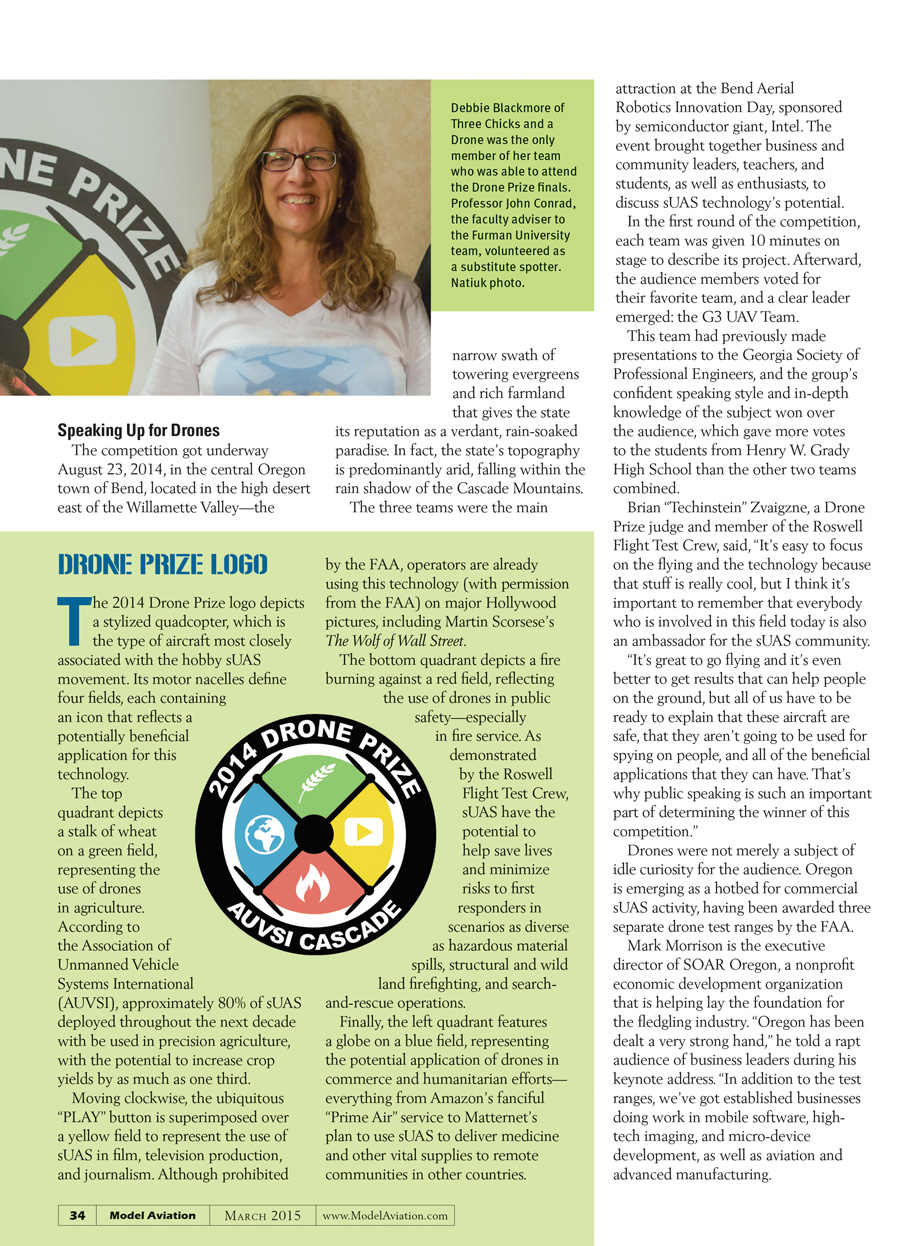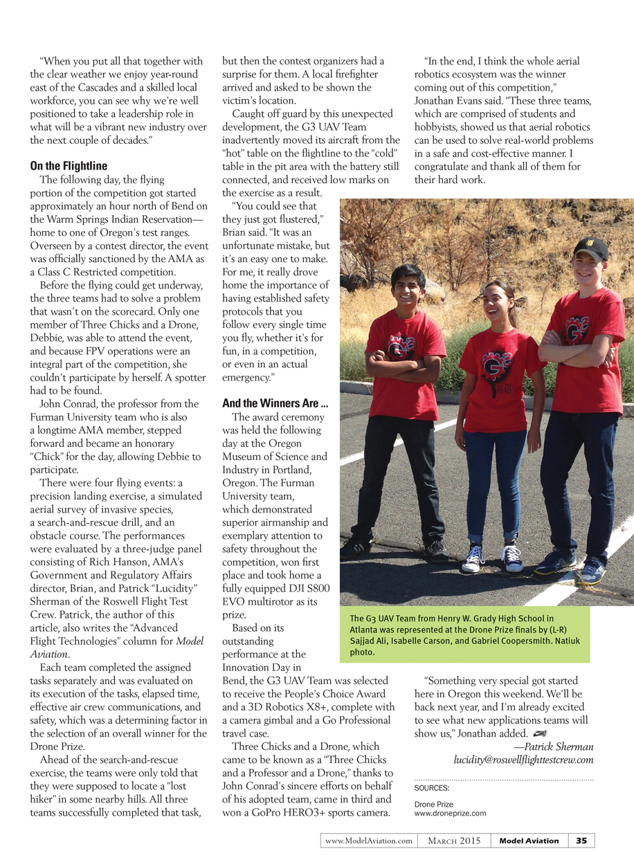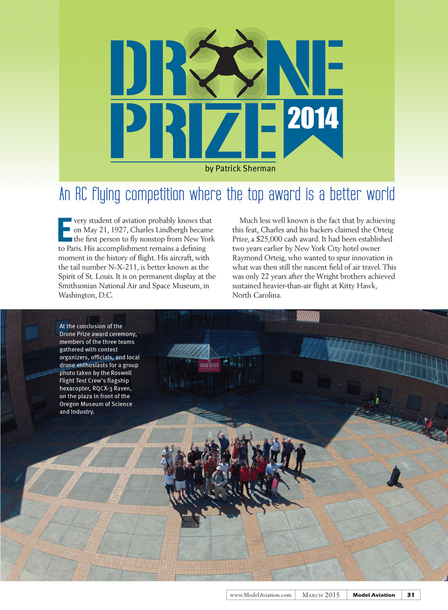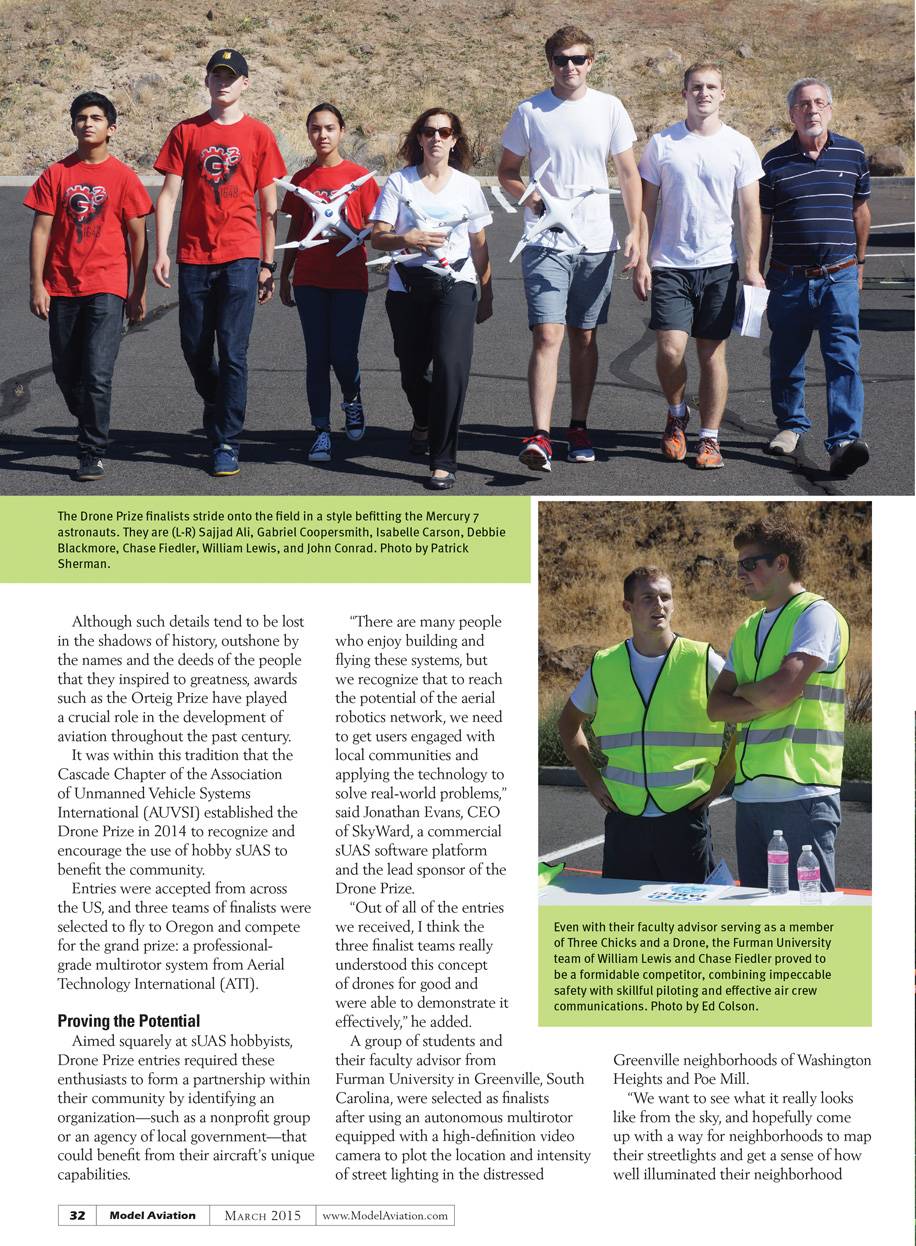 The logo of the 2014 Drone Prize depicts a stylized quadcopter, which is the type of aircraft most closely associated with the hobby small Unmanned Aircraft Systems (sUAS) movement. Its motor nacelles define four fields, each containing an icon that reflects a potentially beneficial application for this technology. The top quadrant depicts a stalk of wheat on a green field, representing the use of drones in agriculture. According to the Association of Unmanned Vehicle Systems International (AUVSI), approximately 80% of sUAS deployed throughout the next decade with be used in precision agriculture, with the potential to increase crop yields by as much as one third. Moving clockwise, the ubiquitous “PLAY” button is superimposed over a yellow field to represent the use of sUAS in film, television production, and journalism. Although still prohibited by the FAA, wildcat operators are already using this technology (with permission from the FAA) on major Hollywood pictures, including Martin Scorsese’s The Wolf of Wall Street. The bottom quadrant depicts a fire burning against a red field, reflecting the use of drones in public safety—especially the fire service. As demonstrated by the Roswell Flight Test Crew, sUAS have the potential to help save lives and minimize risks to first responders in scenarios as diverse as hazardous material spills, structural and wild land firefighting, and search-and-rescue operations. Finally, the left quadrant features a globe on a blue field, representing the potential application of drones in commerce and humanitarian efforts—everything from Amazon’s fanciful “Prime Air” service to Matternet’s plan to use sUAS to deliver medicine and other vital supplies to remote communities in other countries. Every student of aviation probably knows that on May 21, 1927, Charles Lindbergh became the first person to fly nonstop from New York to Paris. Even today, his accomplishment remains a defining moment in the history of flight. As a testament to that fact, his aircraft tail number, N-X-211, but better known as the Spirit of St. Louis, is on permanent display at the Smithsonian National Air and Space Museum, in Washington, D.C. Much less well known is the fact that by achieving this feat, Charles and his backers claimed the Orteig Prize, a $25,000 cash award. It had been established two years earlier by New York City hotel owner Raymond Orteig, who wanted to spur innovation in what was then still the nascent field of air travel. This was only 22 years after the Wright brothers had achieved sustained heavier-than-air flight at Kitty Hawk, North Carolina. Although such details tend to be lost in the shadows of history, outshone by the names and the deeds of the people that they inspired to greatness, awards such as the Orteig Prize have played a crucial role in the development of aviation throughout the past century. It was within this tradition that the Cascade Chapter of the Association of Unmanned Vehicle Systems International (AUVSI) established the Drone Prize in 2014 to recognize and encourage the use of hobby sUAS to benefit the community. Entries were accepted from across the US, and three teams of finalists were selected to fly to Oregon and compete for the grand prize: a professional-grade multirotor system from Aerial Technology International (ATI). Proving the Potential Aimed squarely at sUAS hobbyists, Drone Prize entries required these enthusiasts to form a partnership within their community by identifying an organization—such as a nonprofit group or an agency of local government—that could benefit from their aircraft’s unique capabilities. “There are many people who enjoy building and flying these systems, but we recognize that to reach the potential of the aerial robotics network, we need to get users engaged with local communities and applying the technology to solve real-world problems,” said Jonathan Evans, CEO of SkyWard, a commercial sUAS software platform and the lead sponsor of the Drone Prize. “Out of all of the entries we received, I think the three finalist teams really understood this concept of drones for good and were able to demonstrate it effectively,” he added. A group of students and their faculty advisor from Furman University in Greenville, South Carolina, were selected as finalists after using an autonomous multirotor equipped with a high-definition video camera to plot the location and intensity of street lighting in the distressed Greenville neighborhoods of Washington Heights and Poe Mill. “We want to see what it really looks like from the sky, and hopefully come up with a way for neighborhoods to map their streetlights and get a sense of how well illuminated their neighborhood is,” explained Mike Winiski, associate director of Furman University’s Center for Teaching and Learning. Furman was represented in Oregon by students Chase Feidler and William Lewis, and professor John Conrad. Other members of the team included Mike Winiski, Taylor DeLench, Dante Durrman, Connor Chatterton, Steve Nelson, Mercia Calvin, and Jean Phelps. A team calling itself Three Chicks and a Drone, from Scappoose, Oregon, was also selected to participate in the finals after partnering with a local watershed council on a habitat restoration project. “We’re trying to help improve how the Duck Lake area connects to the main channel,” team member and environmental scientist Pat Welle explained. “We’re doing that with our drone, which gets a bird’s-eye view of the ponds, the wetlands, and how the water flows through the system.” In addition to Pat, the other team members are Debbie Blackmore and Veronika Megler. The third group selected to make the trip to Oregon was the G3 Unmanned Aerial Vehicle (UAV) Team from Henry W. Grady High School in Atlanta. “Our goal is to interest students in science, technology, engineering, and mathematics,” said Gardner Chambliss, an engineer and the team’s volunteer mentor. 