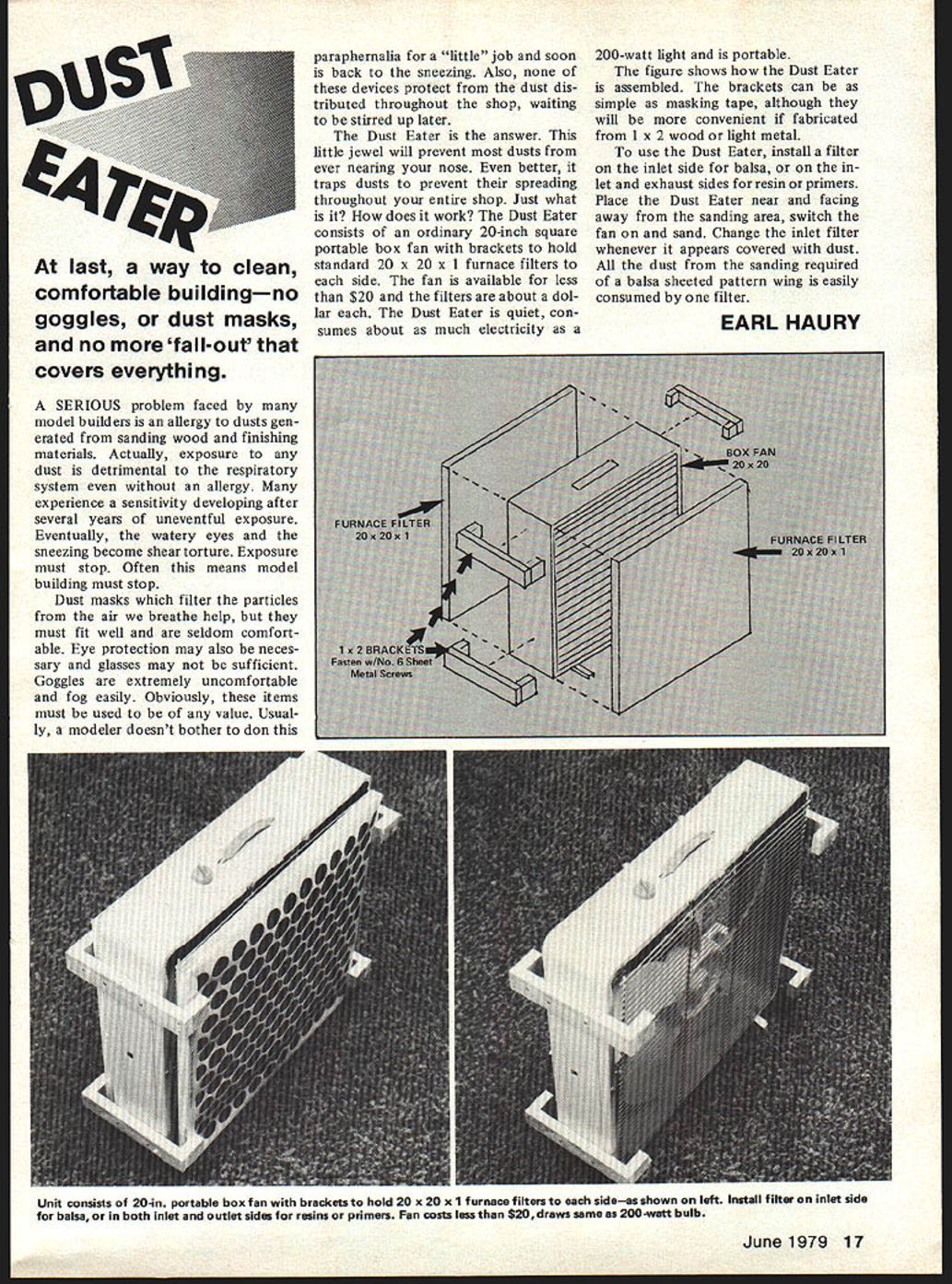 goggles dust masks no fall-out covers everything SERIOUS problem faced model builders allergy dusts gen erated sanding wood finishing materials Actually exposure dust detrimental respiratory system allergy experience sensitivity developing after several years uneventful exposure Eventually watery eyes sneezing become shear torture Exposure must stop Often means model building must stop Dust masks filter particles air breathe help must fit well seldom comfort able Eye protection may also neces sary glasses may sufficient Goggles extremely uncomfortable fog easily Obviously items must used value Usual ly modeler doesnt bother don paraphernalia little job soon back sneezing Also devices protect dust dis tributed throughout shop waiting stirred up later Dust Eater answer little jewel will prevent dusts ever nearing nose better traps dusts prevent spreading throughout entire shop Just what does work Dust Eater consists ordinary 20-inch square portable box fan brackets hold standard 20 x 20 x 1 furnace filters side fan available less $20 filters about dol lar Dust Eater quiet con sumes about much electricity 200-watt light portable figure shows Dust Eater assembled brackets can simple masking tape although will convenient fabricated 1 x 2 wood light metal use Dust Eater install filter inlet side balsa let exhaust sides resin primers Place Dust Eater near facing away sanding area switch fan sand Change inlet filter whenever appears covered dust dust sanding required balsa sheeted pattern wing easily consumed filter EARL HAURY Unit consists 20-in portable box fan brackets hold 20 x 20 x 1 furnace filters sideas shown left Install filter inlet side balsa both inlet outlet sides resins primers Fan costs less $20 draws same 200-watt bulb June1979 17 last way clean comfortable buildingno