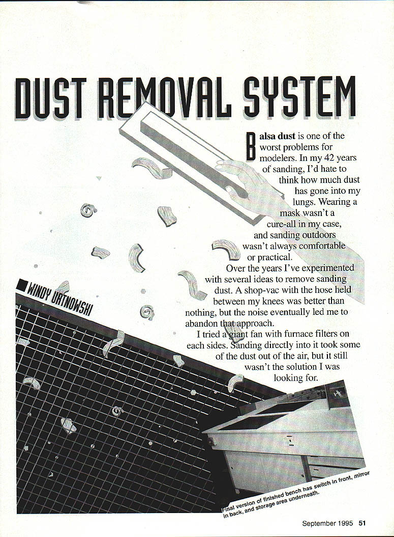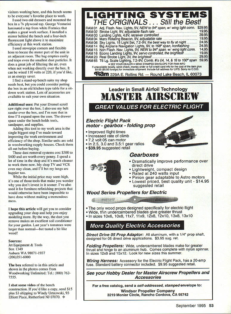 DUSTR VAL SYSTEM B mask wasnt cure-all case sanding outdoors wasnt always comfortable practical Over years Ive experimented several ideas remove sanding dust shop-vac hose held between knees better nothing noise eventually led abandon tJatipproach tried t fan fumace filters sides nding directly took some dust out air still wasnt solution looking alsa dust worst problems modelers 42 years sanding Id hate think much dust has gone lungs Wearing September 1995 51 aa Jeff Steifel showed up shop night box hooked shop-vac top box Masonite pegboard did quite job removing dust impressed wanted less noise convenience box tended clumsy lap unstable workbench big step forward knew could improved month later Jim Damarell brought over some literature looked like just what neededa giant air-moving system relatively quiet could located outside work area less sound checked out several models finally purchased Model DC-650 Dust Removal System also obtained optional box mount workbench box fits bench just like sink has multiple suction outlets grating rubber mounted flush table convenience large sanding jobs quickly found uses machine Carving blocks snap working over box Nothing ends up floor Sanding now neat operation painting facilitated fumes get removed shop too Another neat accessory comes box option router pad hold parts placeN sanding Ive used before its useful combined system hold modeling classes shop Monday night normally have 10-15 people sanding carving painting machine makes possible environment everyone works efficiently Im currently working Giant Scale Tsunami G-45 Zenoah Master craftsman George Venturini proud owner model generously donated time make workbench see photos two us can sand fuselage directly over box intake almost dust gets carried away wife Karyn says house stays much free dust since system installed Efficient air filtration makes healthy shop environment Move equipment directly over inlet maximum efficiency Note Bench large enough two persons work same time sawdust disappearing box 52 Model Aviation nd grate removed shows suction inlets l Formica tabletop visitors working bench seems everyones favorite place work used two old dressers mounted box 3/4 plywood top George Venturini laminated top white Formica makes great work surface installed mirror behind bench four-inch fluorescent light above maximize efficiency work station used stovepipe corners flexible hose locate motor part unit adjacent room bag empties easily traps smallest dust particles does great job filtering air working directly over box can wired 110 volts 220 youd like energy saver find stand-up bench suits shop needs best could consider putting box old kitchen type table sitdown work station Lots accessories available suit own situation Additional uses Put Dremel scroll saw right over box also use belt sander over box Im sure time Ill expand upon uses drawer space under bench holds tools sandpaper supplies Adding tool work area single biggest step Ive made toward improving work environment efficiency shop Similar units sold woodworking supply houses Check out before buying dust removal systems cost $300 $400 worth penny spend lot time shop its much cleaner work now shop TV VCR stay clean Ill bet lungs happier too initial price may seem high its tools make wonder dont invest sooner Ive also used furniture refinishing projects would otherwise have impossible have done making tremendous mess hope article will get consider upgrading shop help enjoy modeling way dust remove makes excellent soil conditioner garden Last years tomatoes larger normalbut tasted bit like wood Sources Jet Equipment & Tools Box 1349 Auburn WA 9807 1-1937 206351-6000 box referred article shown photos comes WoodworkingUnlimited Tel 800 7627555 shot some video bench construction youd like copy send $15 plus $3 shipping Windy Urtnowski 93 Elliott Place Rutherford NJ 07070 er Small Airfoil Technology MASTE Al RSC REW Electric Flight Pack motor gearbox folding prop Improved flight times Increased rate climb 72 volt 05 can motor 25 30 351 gear ratios $3995 suggested retail Gearboxes Dramatically improve performance over direct drive Lightweight compact design Rated 240 watts input Pinion gear adaptable Astro motors Lowest priced best quality unit $1495 suggested retail Wood Series Propellers Electric wood props designed specifically electric flight Wide thin undercambered blades give greater thrust sizes 10x6 10x8 11x7 11x9 12x8 12x10 13x8 13x10 tR WIUNIII vai i IELU rieuaim Direct Drive 05 Prop Adaptor aluminum 1/4 prop shaft designed 05 direct drive applications $395 sug ret Folding Propellers Wide undercambered blades make greater thrust hinge aluminum hub Comes complete nylon spinner sizes 12x8 15x12 Look new sizes summer Wiring Harness Accessory Electric Flight Pack has 20-amp fuse Standard battery connector included $995 suggested retail See Hobby Dealer for Master Airscrew Propellers Accessories free catalog send self-addressed stamped envelope Windsor Propeller Company 3219 Monier Circle Rancho Cordova CA 95742 September 1995 53 LIGHTING SYSTEMS THE ORIGINALS. Still Best RAM 01 Adj Flash Nay Lights 9V NEW 94 span w/ wing light conn $2995 RAM 02Strobe Light 9V adjustable flash rate1995 RAM 03Landing Li9hts 48V receiver controlled3995 RAM 04Mars Rotating Beacon 9V adjustable rate1995 RAM 06Sky Lights 18 Li9ht Set 72-9V best way fly night2495 RAM 14Big Airplane Navigation Lights 9V 168 span nonflashing2495 RAM 15Non Flash Nay Lights 9V NEW 94 span w/ wing light conn1495 RAM 16Econo Landing Lights 9V servo controlled brightest1995 RAM 23Real Strobe Li9ht 3V brightest2995 RAM 65 T6 Lg Scale Lighting 72-9V Comb #s 04 14 & i6to 100 span 5995 0 SEE YOUR DEALER S SEND STAMPED ENVELOPE FOR RAM INFO unavailable locally send check money order full credit card info cosf item Pius $400 l$50O foreign immediate shipment Include full address UPS Sorry no OD 229A E Rollins Rd d Lake Beach IL 60073