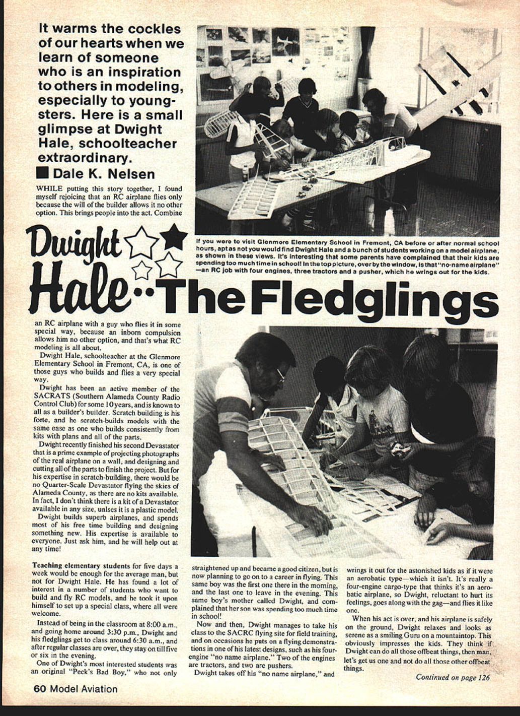 It warms cockles hearts learn someone inspiration others modeling especially young sters small glimpse Dwight Hale schoolteacher extraordinary U Dale K Nelsen WHILE putting story together found myself rejoicing RC airplane flies because will builder allows no other option brings people act Combine HOfrThe Fledglings RC airplane guy flies some special way because inborn compulsion allows him no other option thats what RC modeling about Dwight Hale schoolteacher Glenmore Elementary School Fremont CA guys builds flies very special way Dwight has active member SACRATS Southern Alameda County Radio Control Club some 10 years known builders builder Scratch building forte scratch-builds models same ease builds consistently kits plans parts Dwight recently finished second Devastator prime example projecting photographs real airplane wall designing cutting parts finish project expertise scratch-building would no Quarter-Scale Devastator flying skies Alameda County no kits available fact dont think kit Devastator available size unlses plastic model Dwight builds superb airplanes spends free time building designing something new expertise available everyone Just ask him will help out time Teaching elementary students five days week would enough average man Dwight Hale has found lot interest number students want build fly RC models took upon himself set up special class welcome Instead being classroom 800 am going home around 330 pm Dwight fledglings get class around 630 am after regular classes over stay till five six evening Dwights interested students original Pecks Bad Boy straightened up became good citizen now planning go career flying same boy first morning last leave evening same boys mother called Dwight com plained son spending too much time school Now Dwight manages take class SACRC flying site field training occasions puts flying demonstra tions latest designs such fourengine no name airplane Two engines tractors two pushers Dwight takes off no name airplane wrings out astonished kids aerobatic typewhich isnt Its really four-engine cargo-type thinks its aero batic airplane Dwight reluctant hurt its feelings goes along gagand flies like act over airplane safely ground Dwight relaxes looks serene smiling Guru mountaintop obviously impresses kids think Dwight can ofibeat things man lets get us other offbeat things Continued page 126 60 Model Aviation visit uienmore Iementary School Fremont CA before after normal school hours apt would find Dwight Hale bunch students working model airplane shown views Its interesting some parents have complained kids spending too much time school top picture over bythe window isthat no-name airplane RC job four engines three tractors pusher wrings Out kids Introducing . Walt Schoonards Fabulous Pitch Guage RIC Helicopters Precise Static Pitch Setting Symetrical Semi-Symetrical Flat Bottom Right Left Rotation Inverted Set-up Unique Blade Attachment Insures Precise Alignment Available from$1995 plus shipping Dealer Inquiries Invited 2594 North Orange Blossom Trail ndo Flonda 32804 305-422-1531 305-647-1335 orto replace heavy metal hubs Quite variety 0-rings available neighborhood hardware store reailistic appearance wheel hub caps can added cover axle ends Caps can made wood vacu-formed plastic thin aluminum like used offset printing soft drink cans note caution working Moto Tool power tool matter some form eye protection should worn Moto Tool turns 20 30000 rpm theres always chance tools material abrasives being thrown about Adequate protection can form face shield plastic goggles Dwight Hale/Nelsen Continued page 60 safety glasses hope idea helps Scale models much has Now can just figure out save another /4 .. know exactly what youre doing time promotes safe flying assures happy successful flights hats off Dwight Hale Dwight teaches students Its just matterdevotion modeling time spends knowing airplane inside-out Never ask itthe younger generation surely will make better anything beyond limits its designmen product ew realistic sport biplane styled like full-size Beercat once raced Rena model spans 47 weighs 51/2 lbs uses 4-channel RC 35 49 engines referred Live Wire Beercat deference its designer Hal deBolt OMECO Hal deBolts old company pioneered RO kits during early 50s produced famous Live Wire trainer 6-ft Live Wire Hal flew bipes National competitionlike Beercat cabane struts positive staggerand Hal associ ated days Midwest So state ments easy quick-building biplane capable maneuvers smooth handling can accepted face value Exclusive saddle jigs assist fuselage assembly Molded cowl ABS plasticas wheel pants Landing gear preformedmotor mount included like bipes put off usual strut complication wish something new distinctive aircraft cabin job ala Beechcraft its negative stagger will look mighty nice flashing around steep corneror riding power approach Extensive instruc tion manual full-size plans ideal 40s sport flier might check out stalls Negative stagger has design plusthe forward wing should arranged stall firstprovides canard-type stability probably other advantages re lating gaplots hereand wing interaction Remember Beechcraft bipes noted speed efficiency 126 Model Aviation Flying Near Airports careful Free Flight Radio control Flying near airports situation might involve possibility models being vicinity full-scale aircraft operations must avoidedOr conducted eliminate dangerous situations Models should flown prosimity full-scale aircraft operations unless flyer has someone else him sole purpose watching full-scale aircraft supervising flying prevent accident possibilities PROTECT YOUR RIGHT TO FLY eercat wipe west Pro ducts Co Inc 400 S Indiana St Hobart IN 46342 acnooiseacner uwsgns nale member anne Rum cnarserea AUHA aiso excellent model builder flier witness Giant Scale Devastator has 90-in span powered OS Max 90 Hale developed construction plans big model projecting photographs wall Author Dale Nelsen also took pictures says Devastator flies l