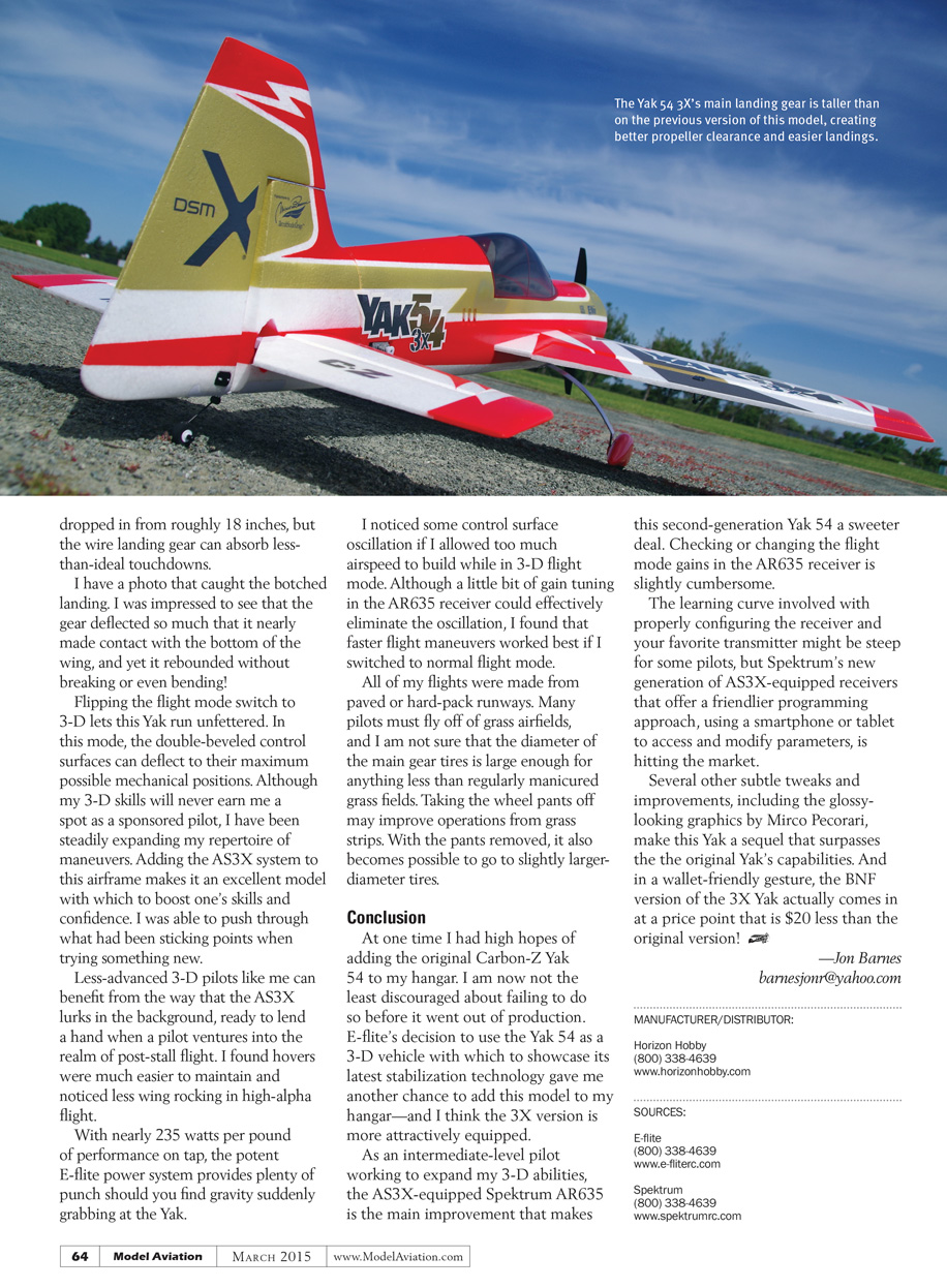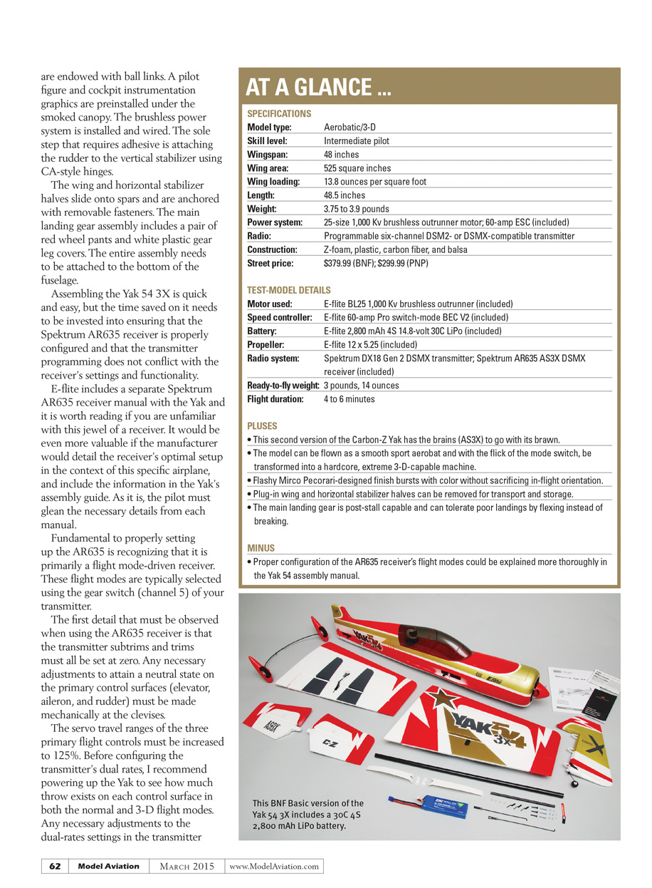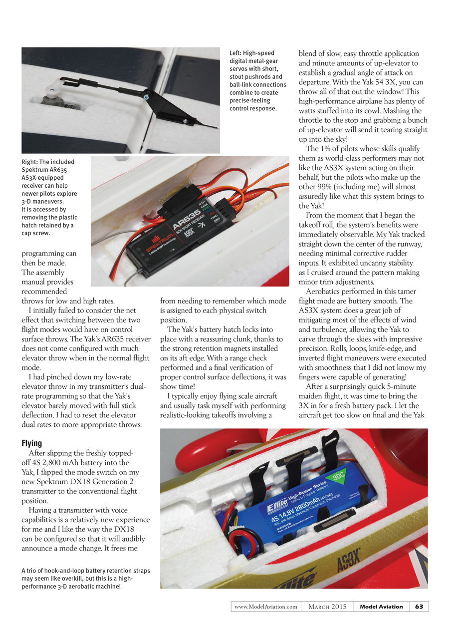 As an intermediate-level pilot working to expand my 3-D abilities, the AS3X-equipped Spektrum AR635 is the main improvement that makes this second-generation Yak 54 a sweeter deal. Checking or changing the flight mode gains in the AR635 receiver is slightly cumbersome.