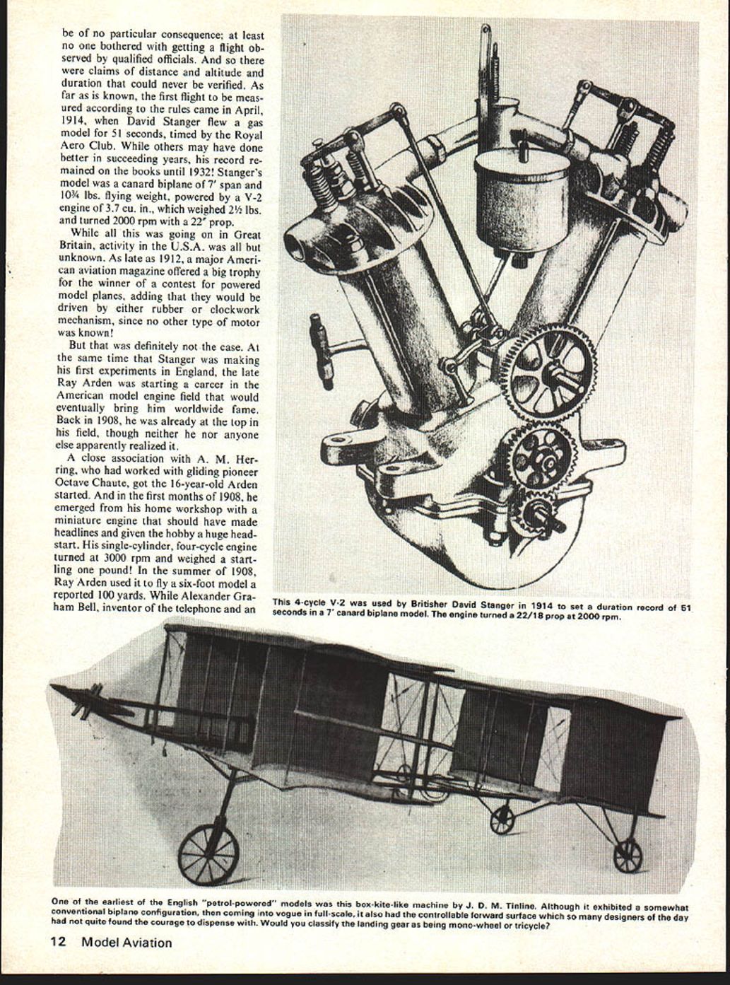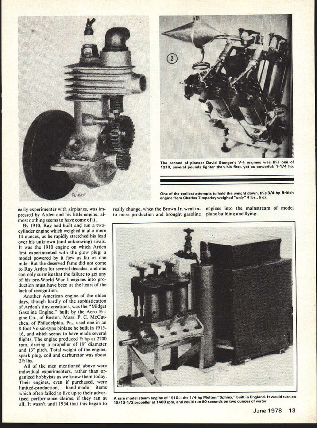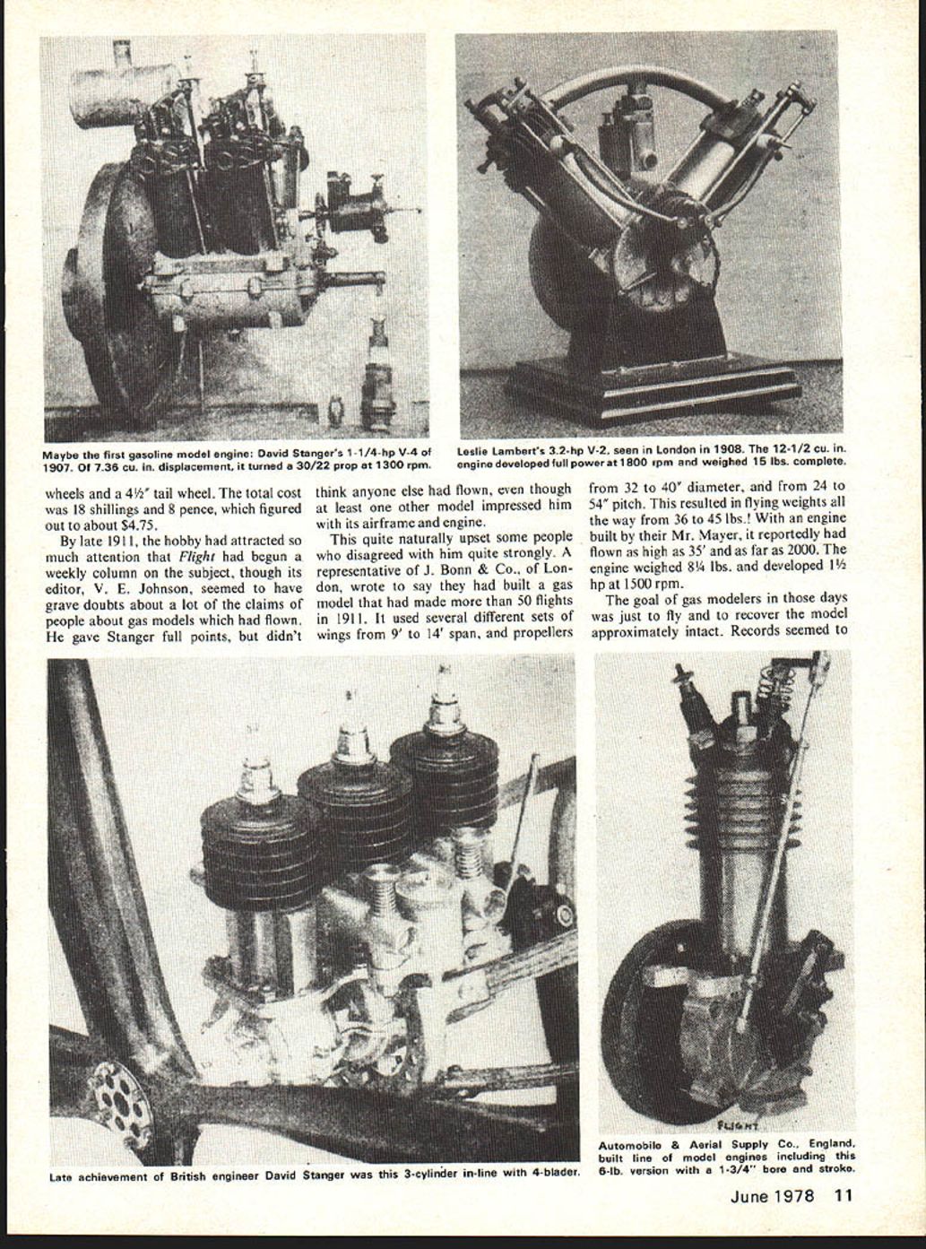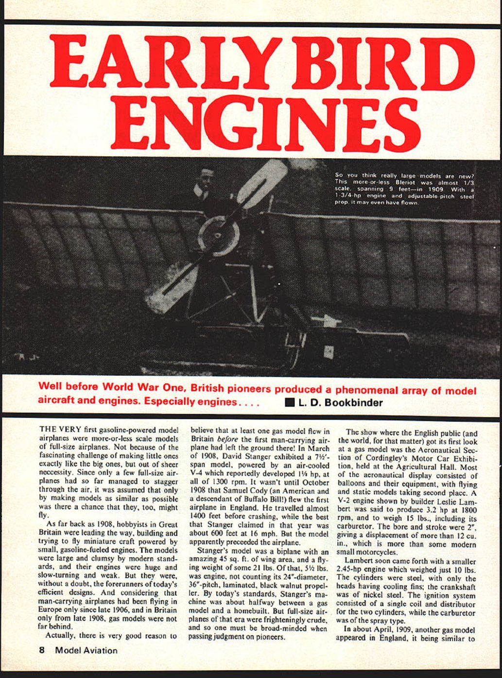 EARLY BIRD Well before World War British pioneers produced phenomenal array model aircraft engines Especially engines EL D Bookbinder THE VERY first gasoline-powered model airplanes more-or-less scale models full-size airplanes because fascinating challenge making little ones exactly like big ones out sheer neccessity Since few full-size air planes far managed stagger through air assumed making models similar possible chance too might fly As far back 1908 hobbyists Great Britain leading way building trying fly miniature craft powered small gasoline-fueled engines models large clumsy modern stand ards engines huge slow-turning weak doubt forerunners todays efficient designs considering man-carrying airplanes flying Europe since late 1906 Britain late 1908 gas models far behind Actually very good reason believe least gas model flew Britain before first man-carrying air plane left ground March 1908 David Stanger exhibited 7span model powered air-cooled V-4 reportedly developed /s hp 1300 rpm wasnt until October 1908 Samuel Cody American descendant Buffalo Bill flew first airplane England travelled almost 1400 feet before crashing best Stanger claimed year about 600 feet 16 mph model apparently preceeded airplane Stangers model biplane amazing 45 sq ft wing area fly ing weight some 21 lbs 5 lbs engine counting its 24w-diameter 36-pitch laminated black walnut propel ler todays standards Stangers ma chine about halfway between gas model homebuilt full-size air planes era frighteningly crude must broad-minded passing judgment pioneers show English public world matter got its first look gas model Aeronautical Sec tion Cordingleys Motor Car Exhibi tion held Agricultural Hall Most aeronautical display consisted balloons equipment flying static models taking second place V-2 engine shown builder Leslie Lambert said produce 32 hp 1800 rpm weigh 15 lbs including its carburetor bore stroke 2 giving displacement 12 cu some modern small motorcycles Lambert soon came forth smaller 245-hp engine weighed just 10 lbs cylinders steel heads having cooling fins crankshaft nickel steel ignition system consisted single coil distributor two cylinders carburetor spray type about April 1909 another gas model appeared England being similar 8 Model Aviation Voisin biplanes leading way among European airplanes Builder J D M Tinline used some kind two-cylinder engine known model ever flew Late 1909 C Burkitt backed history books encountering prob lem first time have learned about first-hand years later built gas model could find no place fly case London County Council refused him per mission fly Hampstead Heath 9 more-or-less Bleriot monoplane powered 1-hp Kingdom engine whatever turned ad justable-pitch steel propeller last re port still looking flying field somebody must have solved problem hobby growing January 1910 issue Aeronautics magazine ad petrol motors ranging size ay up full hp cheapest said selling equivalent $250 time single copy Flight cost 2 now its up 50 November 1910 enough activity miniature gas engine hobby warrant British magazine doing roundup different types commer cially available engines least five firms building selling gaso line engines selling steam en gine model planes hap pening England mind because USA no seemed realize such devices existed Perhaps best known model engines came Automobile Aero Sup ply Co three different powerplants stock smallest developing hp one-cylinder design bore stroke 1 weight out flywheel 4 lbs larger single-cyl inder engine 1 bore stroke weighel 6 lbs put out /2- hp twocylinder engine supposedly devel oped 1 hp bores 1 strokes 2 weight 8-9 lbs again flywheel others intake valve opened closed automatically exhaust valve operated pushrod rocker arm similar line engines marketed Cochrane Co -hp -hp sin gles 3-hp twin smallest bore stroke 1 said weigh 4 lbs engines known high quality machining outside well inside something too common 1910 addition Cochrane engines phosphorbronze bearings supporting crankshaft cast aluminum crankcase Davies two-cylinder in-line engine smallest multi-cylinder de signs being 7 tall weighing just 4 lbs bore 1 5/16 stroke l/8 displacement almost 4 cu yet developed yl inders cast individually iron two-piece crankcase aluminum popular engines designed run no 2000 rpm thus needed heavy bulky fly wheels least showed some advanced thinking C B Timperly built one-cyl inder engine weighed just over 4 lbs developed 200 rpm keep weight down used aluminum cyl inder thin steel liner extensive series engines produced H W Porter ranged one-cylinder models producing win-cylinder ones putting out 1 hp Just two different cylinder assemblies used both 2 stroke having bore 1 other 2 All-up weight including flywheel ranged 11 15 lbs floattype carburetors twins hightension distributors used single igni tion coil So primitive piston engines least steam engine approximately equal performance Melton Aeroplane Co built Sphinx steam engine eighed 4 lbs 2 oz including fuel water said capable turning 18-diameter June 1978 9 series Cochrane model engines 3/4hp version said capable 2500 rprfI weighed 8-3/4 lbs aluminum propeller Davies 2-cylinder in-line engine 1910 weighed 9 lbs per horsepower full 7 high center front cylinder has removed right dismantled carburetor Like engines its day produced very limited quantities home 31-pitch propeller 1400 rpm Its little charcoal-fired boiler could produce 250 lbs/sq steam pressure could run 1 minutes its two fluid ounces water engine proper re sembled gasoline type three cylin ders line mechanically operated valves head wasnt long before enough interest among gas model hobbyists justify standard design models first modeler inventor en gineer skilled machin ist early 1911 first set plans building instructions published model near-scale Bleriot mono plane much like airplane Louis Bleriot gaimed immortality flying across English Channel 1909 model real air plane wingspan 7 length 6 41/2 weighed 14 lbs equipped -hp enginewhich a