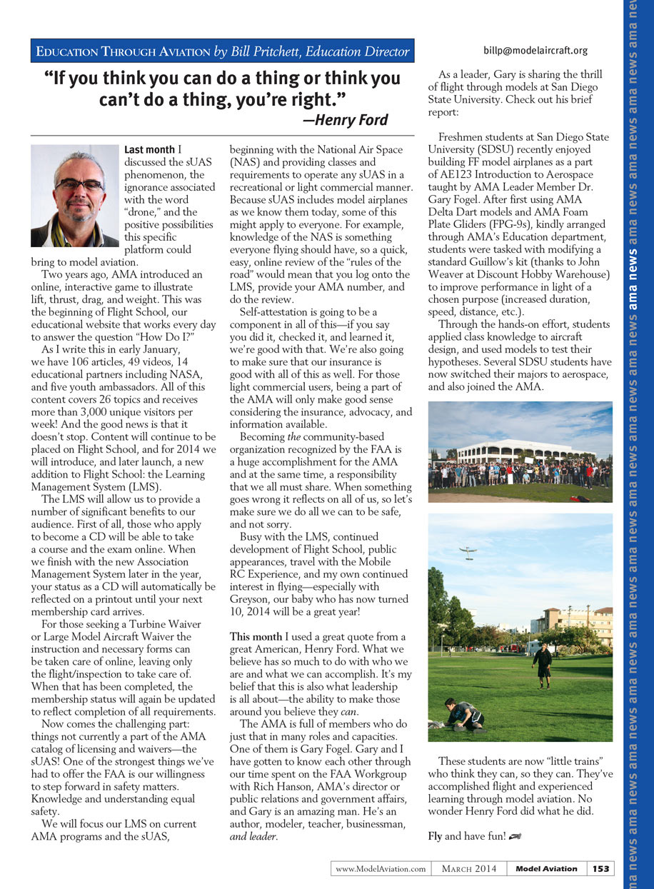 As a leader, Gary is sharing the thrill of flight through models at San Diego State University. Check his brief report: