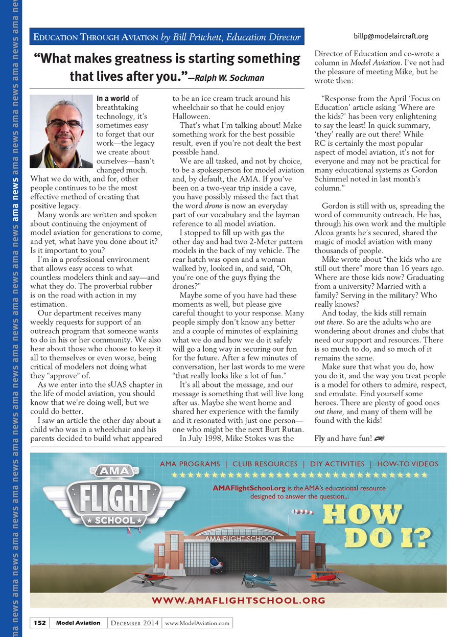 In July 1998, Mike Stokes was the Director of Education and co-wrote a column in Model Aviation. I’ve not had the pleasure of meeting Mike, but he wrote then: