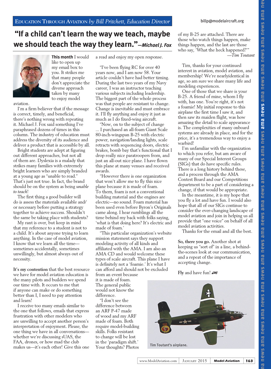 “I don’t see the difference between an ARF P-47 made of wood and my ARF made of foam. Both require model-building skills. Folks resistant to change will be lost in the ‘Paradigm Shift.’ Your thoughts? Photos of my B-25 attached. There are those who watch things happen, make things happen, and the last are those who say, ‘What the heck happened?’”
