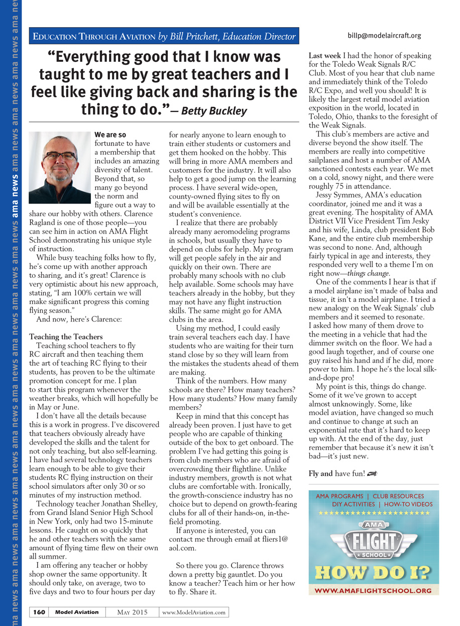 We are so fortunate to have a membership that includes an amazing diversity of talent. Beyond that, so many go beyond the norm and figure out a way to share our hobby with others. Clarence Ragland is one of those guys—you can see him in action on AMA Flight School demonstrating his unique style of instruction. While busy teaching folks to fly, he’s come up with another approach to sharing, and it’s great! Clarence is very optimistic about his new approach, stating, “I am 100% certain we will make significant progress this coming flying season.”