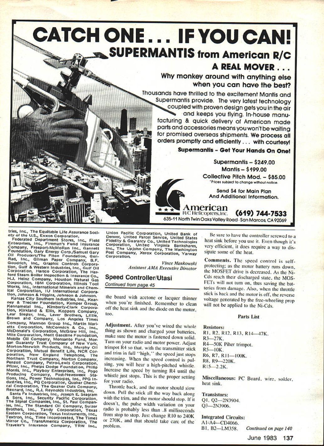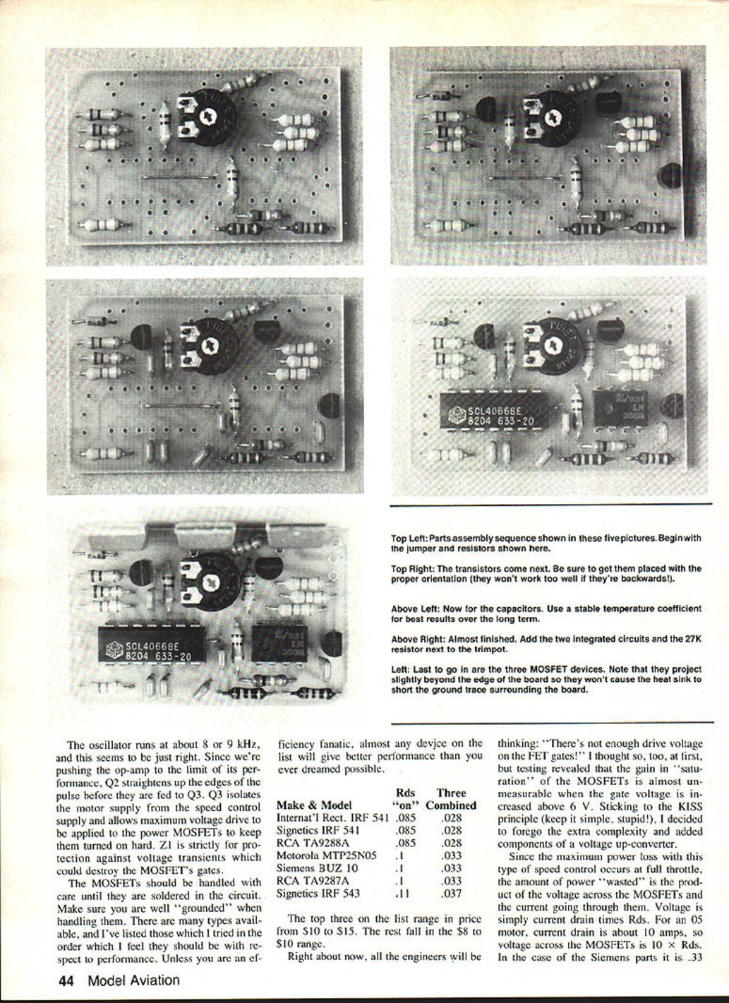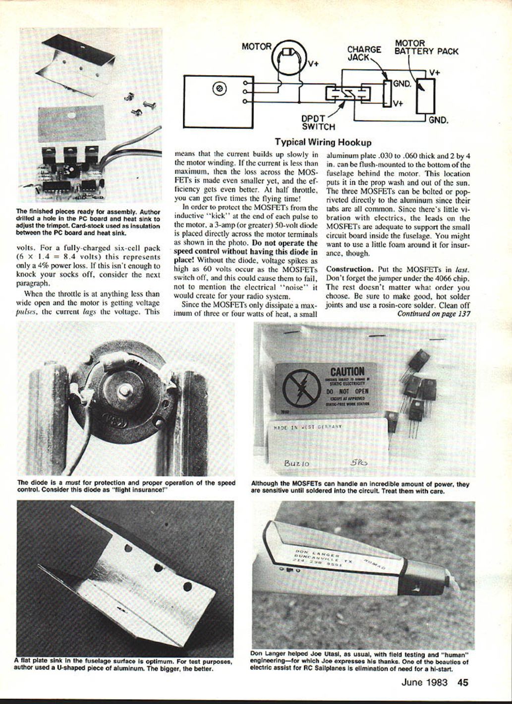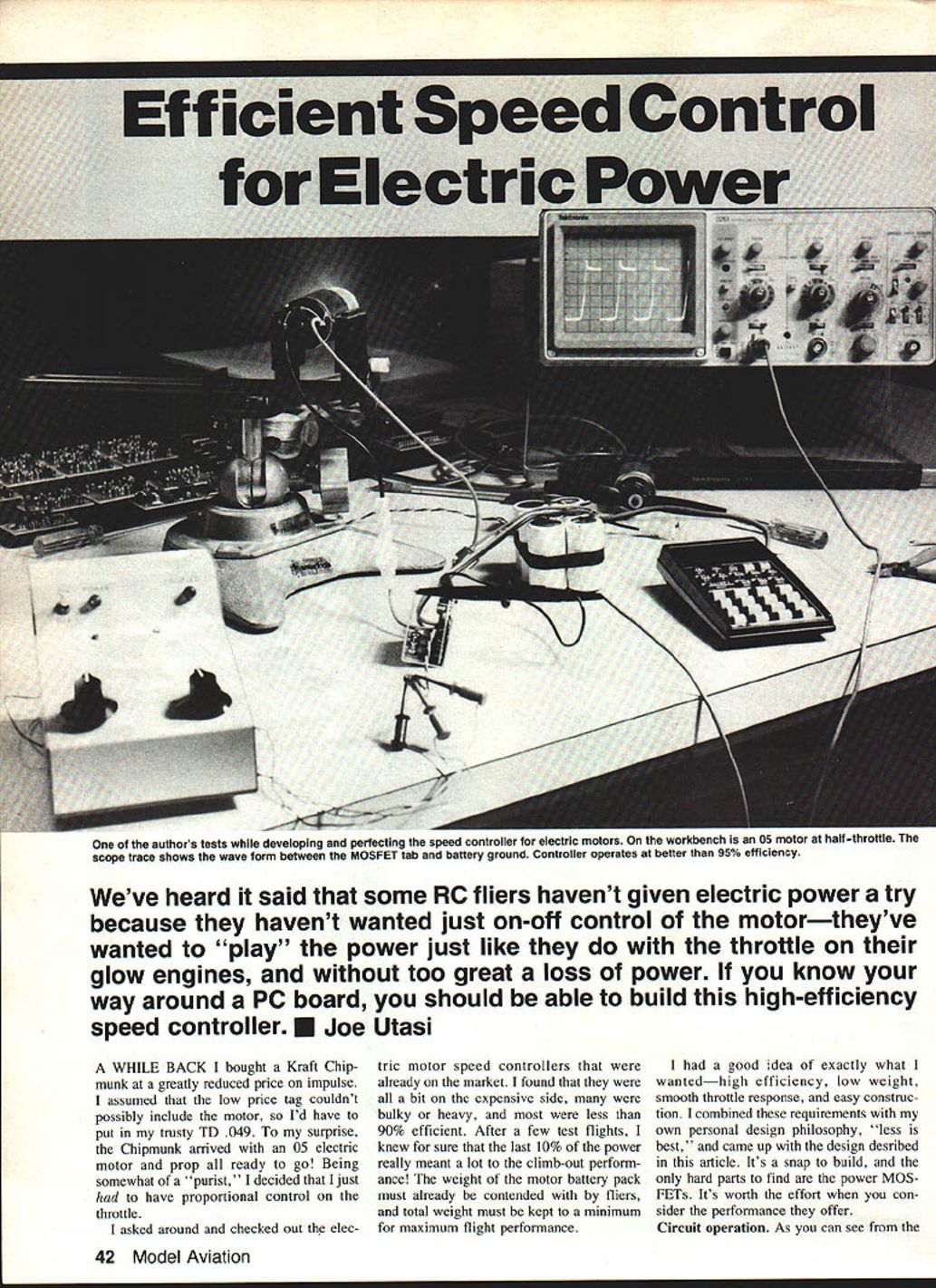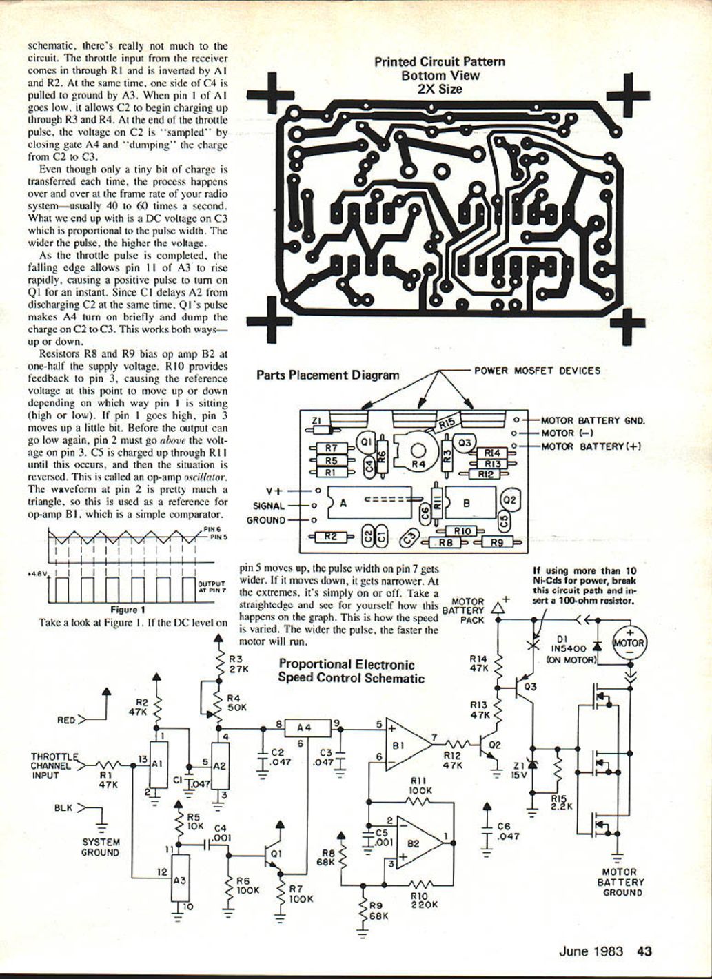 One authors tests developing perfecting speed controller electric motors workbench 05 motor half-throttle scope trace shows wave form between MOSFET tab battery ground Controller operates better 95% efficiency Weve heard said some RC fliers havent given electric power try because havent wanted just on-off control motortheyve wanted play power just like throttle glow engines too great loss power know way around PC board should able build high-efficiency speed controller U Joe Utasi WHILE BACK bought Kraft Chip munk greatly reduced price impulse assumed low price tag couldnt possibly include motor Id have put trusty TD 049 surprise Chipmunk arrived 05 electric motor prop ready go Being somewhat purist decided just have proportional control throttle asked around checked out elec tric motor speed controllers already market found bit expensive side bulky heavy less 90% efficient After few test flights knew sure last 10% power really meant lot climb-out perform ance weight motor battery pack must already contended fliers total weight must kept minimum maximum flight performance good idea exactly what wantedhigh efficiency low weight smooth throttle response easy construc tion combined requirements own personal design philosophy less best came up design desribed article Its snap build hard parts find power MOS FETs Its worth effort con sider performance offer Circuit operation As can see 42 Model Aviation schematic theres really much circuit throttle input receiver comes through RI inverted Al R2 same time side C4 pulled ground A3 pin Al goes low allows C2 begin charging up through R3 R4 end throttle pulse voltage C2 sampled closing gate A4 dumping charge C2 C3 though tiny bit charge transferred time process happens over over frame rate radio systemusually 40 60 times second What end up DC voltage C3 proportional pulse width wider pulse higher voltage As throttle pulse completed falling edge allows pin II A3 rise rapidly causing positive pulse turn QI instant Since Cl delays A2 discharging C2 same time QI s pulse makes A4 turn briefly dump charge C2 C3 works both ways up down Resistors R8 R9 bias op amp B2 one-half supply voltage RIO provides feedback pin 3 causing reference voltage point move up down depending way pin sitting high low pin 1 goes high pin 3 moves up little bit Before output can go low again pin 2 must go above volt age pin 3 C5 charged up through RI 1 until occurs situation reversed called op-amp oscillator waveform pin 2 pretty much triangle used reference op-amp B simple comparator AT PINT Figure 1 Take look Figure 1 DC level RED Printed Circuit Pattern Bottom View 2X Size 1Parts Placement DiagramPOWER MOSFET DEVICES SIGNAL GROUND pin 5 moves up pulse width pin 7 gets wider moves down gets narrower extremes its simply off Take straightedge see yourself MOTOR BATTERY happens graph speed PACK varied wider pulse faster motor will run MOTOR MOTOR MOTOR BATTERY GND ERY g 10 Ni-cds power break circuit path sert 100-ohm resistor DloJ rtional Electronic1N5400 ON MOTOR Speed Control Schematic 03 13 AlA210470471 47K_Cl1047 RiS 22K BLK _C6 1001 B2047 SYSTEM GROUND MOTOR BATTERY GROUND June 1983 43 cFThG1fl14 R703 R413 RLJ e2 o02 o o m ZZI luAu Left Parts assembly sequence shown five pictures Begin jumper resistors shown Top Right transistors come next sure get placed proper orientation wont work too well theyre backwards Above Left Now capacitors Use stable temperature coefficient best results over long term Above Right Almost finished Add two integrated circuits 27K resistor next trimpot Left Last go three MOSFET devices Note project slightly beyond edge board wont cause heat sink short ground trace surrounding board oscillator runs about 8 9 kHz seems just right Since pushing op-amp limit its per formance Q2 straightens up edges pulse before fed Q3 Q3 isolates motor supply speed control supply allows maximum voltage drive applied power MOSFETs keep turned hard Zl strictly pro tection against voltage transients could destroy MOSFETs gates MOSFETs should handled care until soldered circuit Make sure well grounded handling types avail able Ive listed tried order feel should re spect performance Unless ef ficiency fanatic almost device list will give better performance ever dreamed possible Make & Model Internatl Rect IRF 541 Signetics IRF 541 RCA TA9288A Motorola MTP25NO5 Siemens BUZ 10 RCA TA9287A Signetics IRF 543 RdsThree Combined 085028 085028 085028 1 033 1 033 1 033 11 037 top three list range price $10 $15 rest fall $8 $10 range Right about now engineers will thinking Theres enough drive voltage FET gates thought too first testing revealed gain satu ration' MOSFETs almost un measurable gate voltage creased above 6 V Sticking KISS principle keep simple stupid decided forego extra complexity added components voltage up-converter Since maximum power loss type speed control occurs full throttle amount power wasted prod uct voltage across MOSFETs current going through Voltage simply current drain times Rds 05 motor current drain about 10 amps voltage across MOSFETs 10 X Rds case Siemens parts 33 44 Model Aviation MOTOR MOTOR CHARGE BATTERY PACK volts fully-charged six-cell pack 6 x 14 olts represents 4% power loss isnt enough knock socks off consider next paragraph throttle anything less wide open motor getting voltage pulses current lags voltage LI zzUL DPDTGND SWITCH Typical Wiring Hookup means current builds up slowly motor winding current less maximum loss across MOS FETs made smaller yet ef ficiency gets better half throttle can get five times flying time order protect MOSFETs inductive kick end pulse motor 3-amp greater 50-volt diode placed directly across motor terminals shown photo operate speed control having diode place Without diode voltage spikes high 60 volts occur MOSFETs switch off could cause fail mention electrical noise would create radio system Since MOSFETs dissipate max imum three four watts heat small aluminum plate 030 060 thick 2 4 can flush-mounted bottom fusel