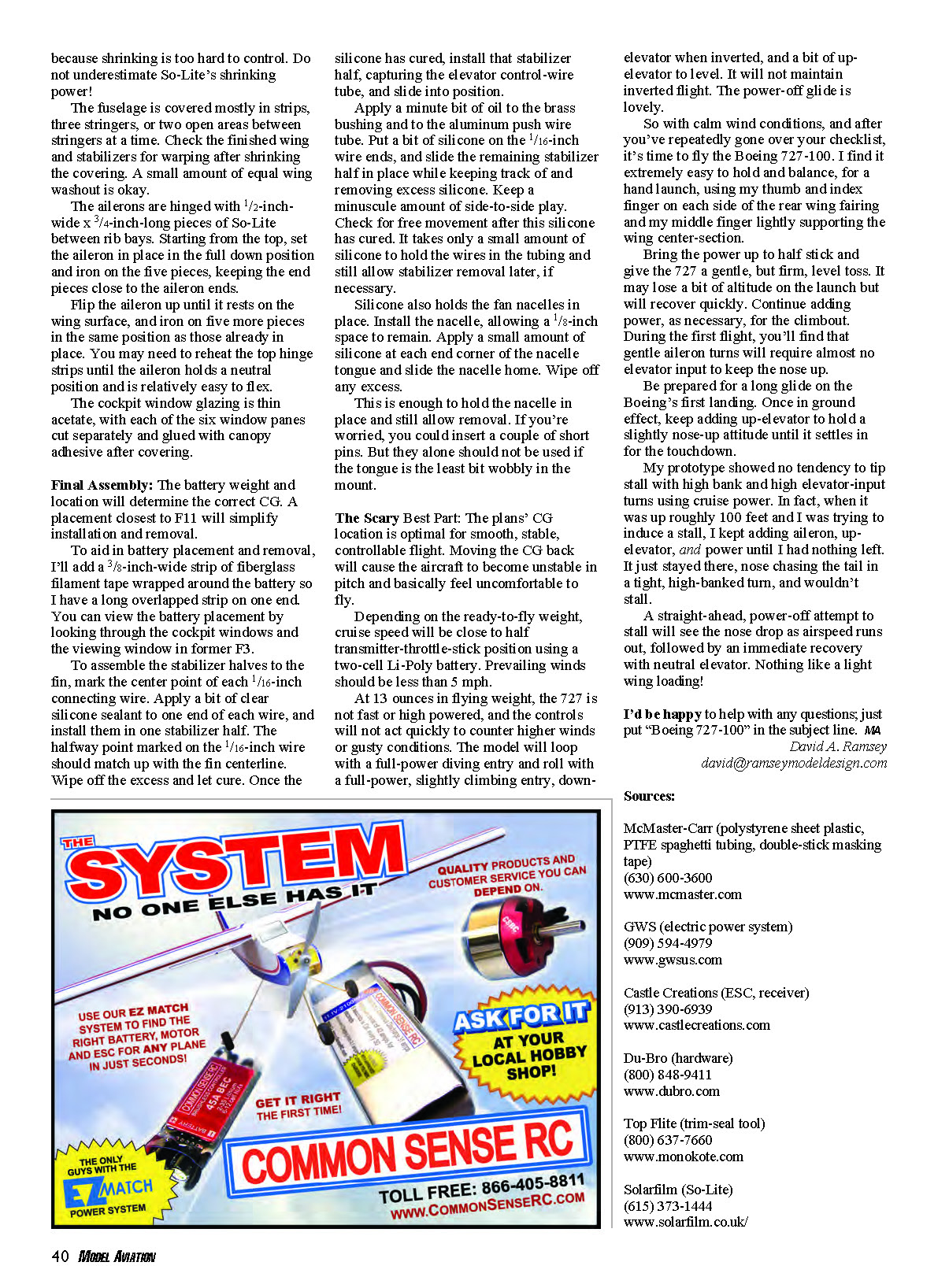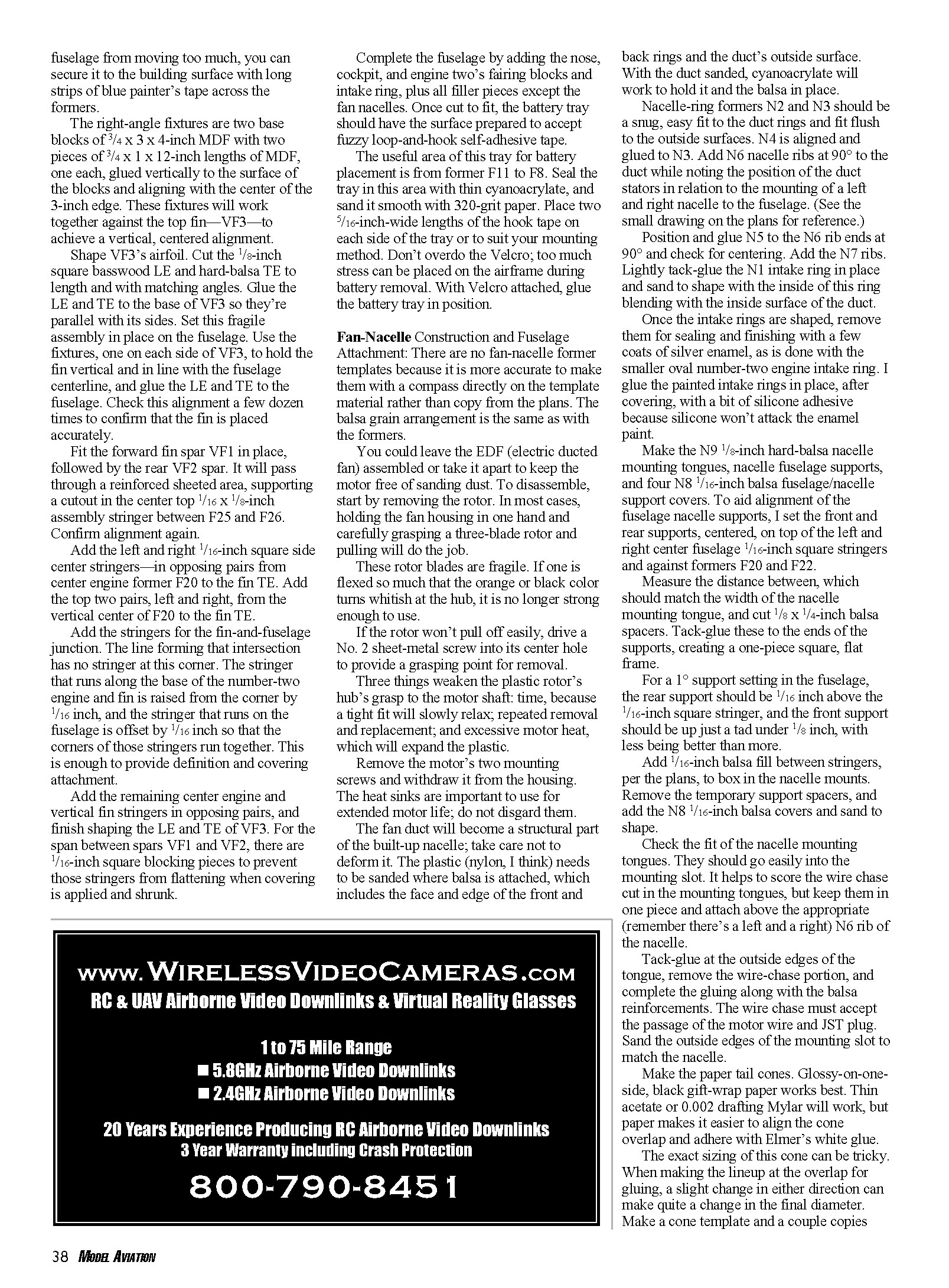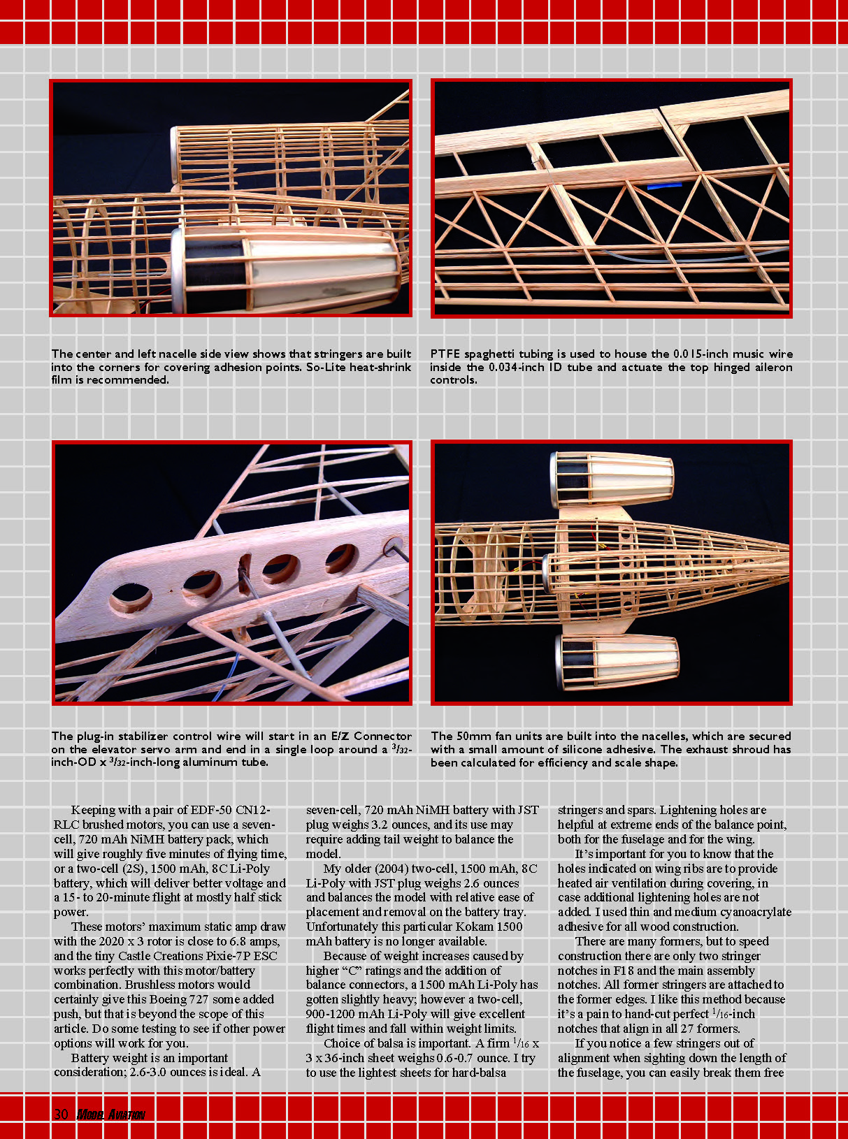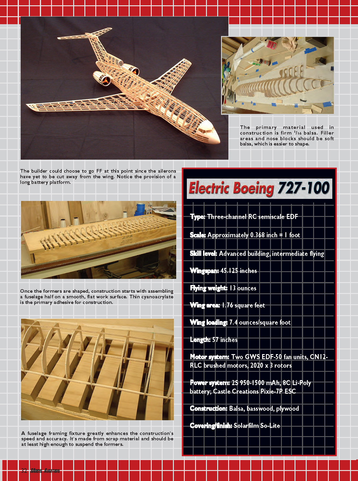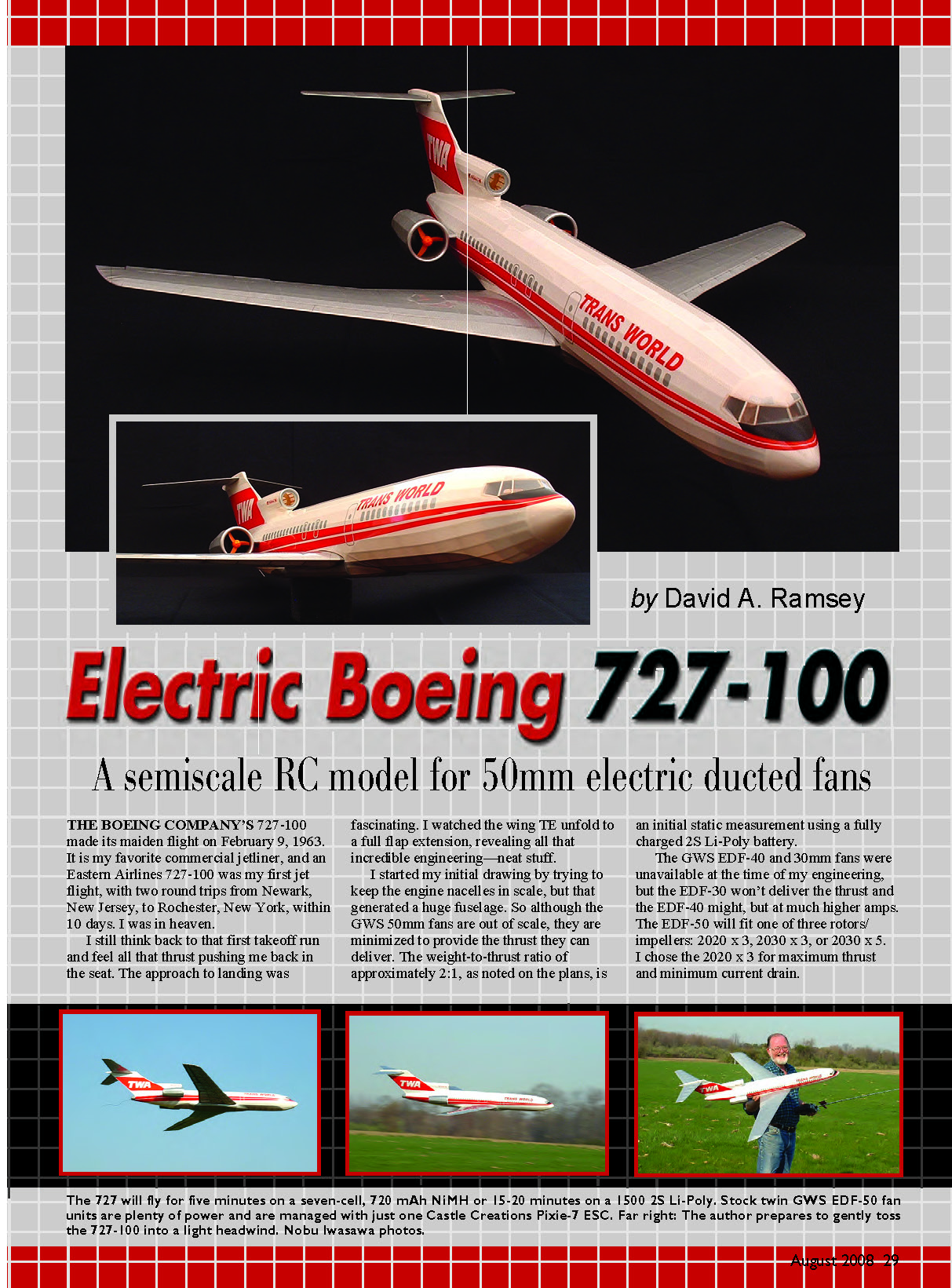 The 727 will fly for five minutes on a seven-cell, 720 mAh NiMH or 15-20 minutes on a 1500 2S Li-Poly. Stock twin GWS EDF-50 fan
