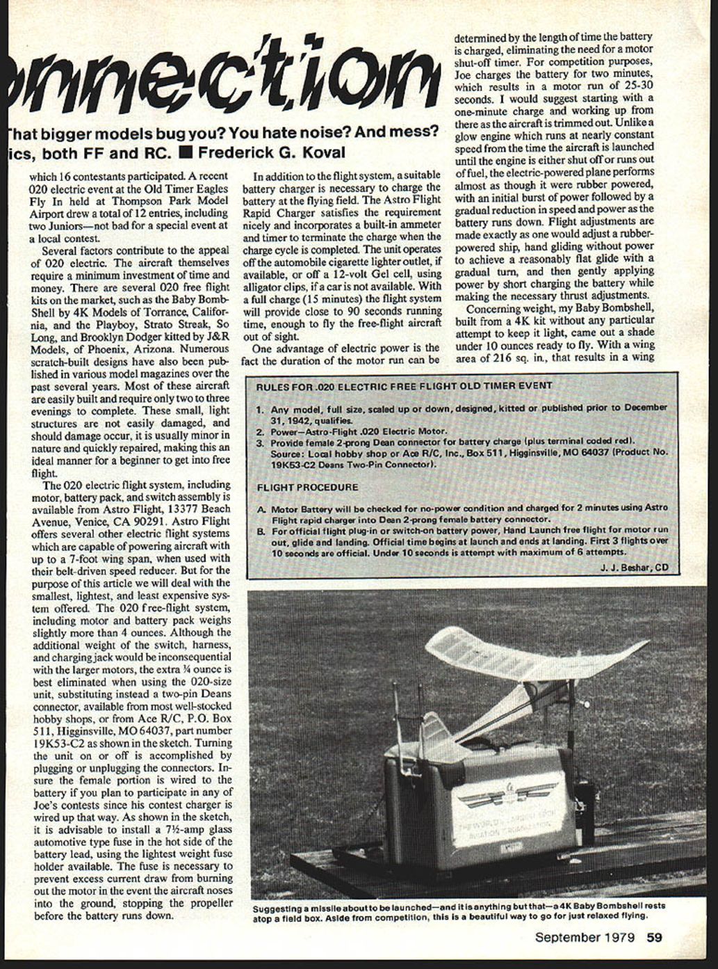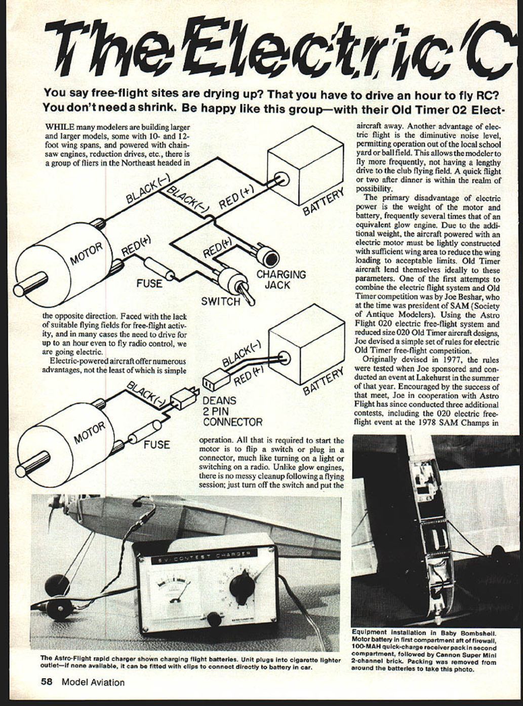 The EZeetrie C say free-flight sites drying up have drive hour fly RC dont need shrink happy like groupwith Old Timer 02 ElectWHILE modelers building larger larger models some 10- 12foot wing spans powered chainsaw engines reduction drives etc group fliers Northeast headed # c&A FUSEJACK opposite direction Faced lack suitable flying fields free-flight activ ity cases need drive up hour fly radio control going electric Electric-powered aircraft offer numerous advantages least simple DEANS 2 PIN CONNECTOR FUSE operation required start motor flip switch plug connector much like turning light switching radio Unlike glow engines no messy cleanup following flying session just turn off switch put aircraft away Another advantage elec tric flight diminutive noise level permitting operation out local school yard ball field allows modeler fly frequently having lengthy drive club flying field quick flight two after dinner within realm possibility primary disadvantage electric power weight motor battery frequently several times equivalent giow engine Due addi tional weight aircraft powered electric motor must lightly constructed sufficient wing area reduce wing loading acceptable limits Old Timer aircraft lend themselves ideally parameters first attempts combine electric flight system Old Timer competition Joe Beshar time president SAM Society Antique Modelers Using Astro Flight 020 electric free-flight system reduced size 020 Old Timer aircraft designs Joe devised simple set rules electric Old Timer free-flight competition Originally devised 1977 rules tested Joe sponsored con ducted event Lakehurst summer year Encouraged success meet Joe cooperation Astro Flight has since conducted three additional contests including 020 electric freeflight event 1978 SAM Champs 58 Model Aviation Astro-Flight rapid charger shown charging flight batteries Unit plugs cigarette lighter outletif available can fitted clips connect directly battery car men installation Baby Bombshell Motor battery first compartment aft firewall 1 O0-MAH quick-charge receiver pack second compartment followed Cannon Super Mini 2-channel brick Packing removed around batteries take photo hat bigger models bug hate noise mess ics both FF RC U Frederick G Koval 16 contestants participated recent 020 electric event Old Timer Eagles Fly held Thompson Park Model Airport drew total 12 entries including two Juniorsnot bad special event local contest Several factors contribute appeal 020 electric aircraft themselves require minimum investment time money several 020 free flight kits market such Baby Bomb Shell 4K Models Torrance Califor nia Playboy Strato Streak So Long Brooklyn Dodger kitted J&R Models Phoenix Arizona Numerous scratch-built designs have also pub lished various model magazines over past several years Most aircraft easily built require two three evenings complete small light structures easily damaged should damage occur usually minor nature quickly repaired making ideal manner beginner get free flight 020 electric flight system including motor battery pack switch assembly available Astro Flight 13377 Beach Avenue Venice CA 90291 Astro Flight offers several other electric flight systems capable powering aircraft up 7-foot wing span used belt-driven speed reducer purpose article will deal smallest lightest least expensive sys tem offered 020 free-flight system including motor battery pack weighs slightly 4 ounces Although additional weight switch harness chargingiack would inconsequential larger motors extra 3/4 ounce best eliminated using 020-size unit substituting instead two-pin Deans connector available well-stocked hobby shops Ace RIG PO Box 511 Higginsville MO 64037 part number 1 9K5 3-C2 shown sketch Turning unit off accomplished plugging unplugging connectors sure female portion wired battery plan participate Joes contests since contest charger wired up way As shown sketch advisable install 7-amp glass automotive type fuse hot side battery lead using lightest weight fuse holder available fuse necessary prevent excess current draw burning out motor event aircraft noses ground stopping propeller before battery runs down addition flight system suitable battery charger necessary charge battery flying field Astro Flight Rapid Charger satisfies requirement nicely incorporates built-in ammeter timer terminate charge charge cycle completed unit operates off automobile cigarette lighter outlet available off 12-volt Gel cell using alligator clips car available full charge 15 minutes flight system will provide close 90 seconds running time enough fly free-flight aircraft out sight advantage electric power fact duration motor run can determined length time battery charged eliminating need motor shut-off timer competition purposes Joe charges battery two minutes results motor run 25-30 seconds would suggest starting one-minute charge working up aircraft trimmed out Unlike glow engine runs nearly constant speed time aircraft launched until engine either shut off runs out fuel electric-powered plane performs almost though rubber powered initial burst power followed gradual reduction speed power battery runs down Flight adjustments made exactly would adjust rubberpowered ship hand gliding power achieve reasonably flat glide gradual turn gently applying power short charging battery making necessary thrust adjustments Concerning weight Baby Bombshell built 4K kit particular attempt keep light came out shade under 10 ounces ready fly wing area 216 sq results wing September 1979 59 suggesTing missiie socuito launchedand anything butthata 4K Baby Bombshell rests atop field box Aside competition beautiful way go just relaxed flying loading around 6 ounces per sq ft makes type plane competitive indeed satisfied 020 electric free flight Joe has added another dimension020 electric RC Old Timer adding two channels radio control relatively small 36 aircraft flying around quietly under radio control must seen appreci ated choice RC gear rather limited due 