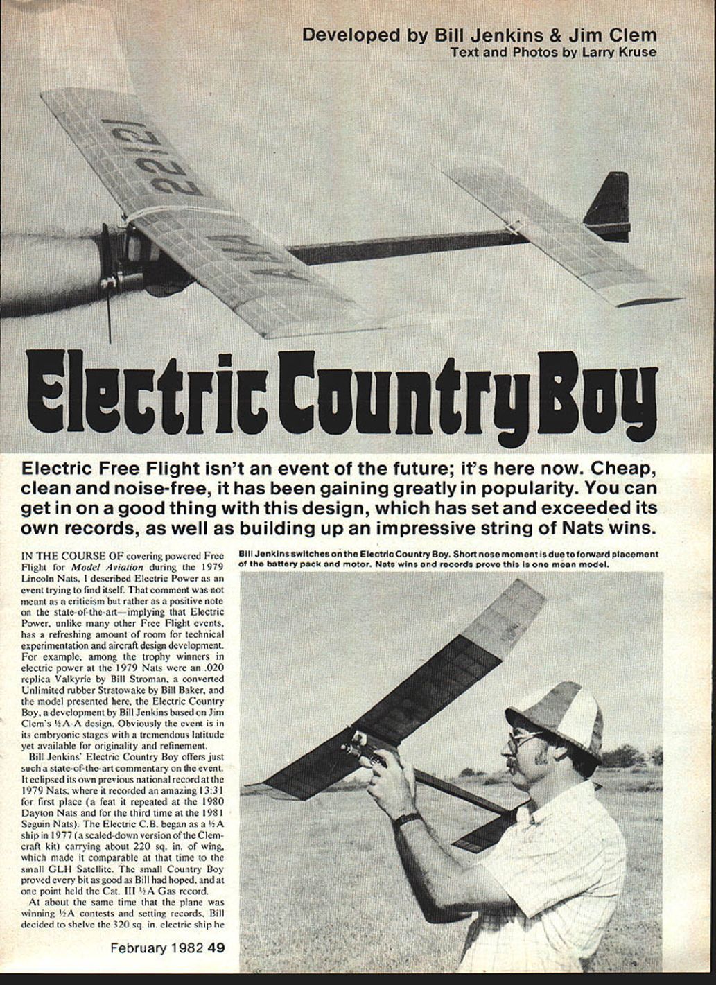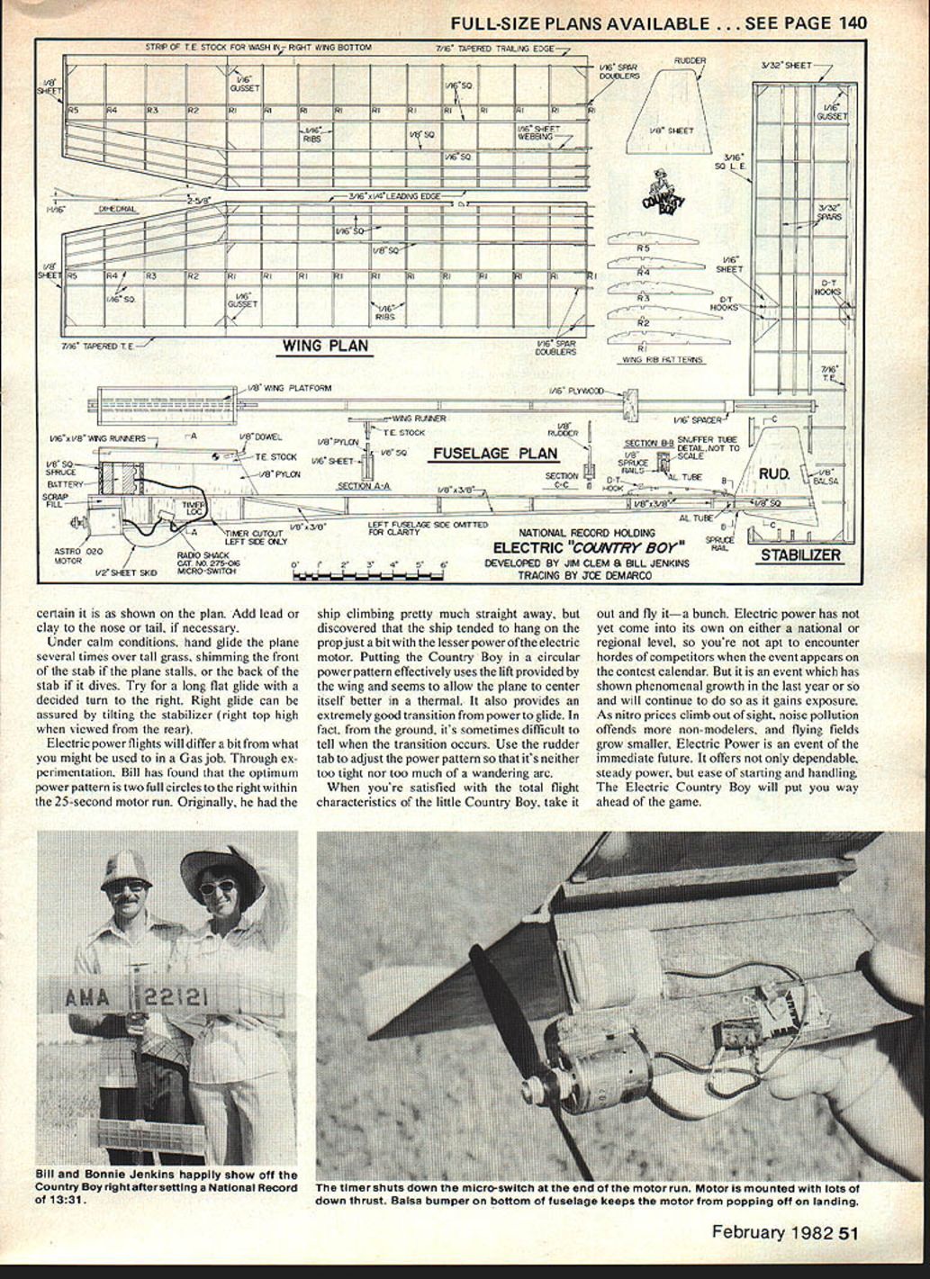 Electric Free Flight isnt event future its now Cheap clean noise-free has gaining greatly popularity can get good thing design has set exceeded its own records well building up impressive string Nats wins IN THE COURSE OF covering powered Free Flight Model Aviation during 1979 Lincoln Nats described Electric Power event trying find itself comment meant criticism rather positive note state-of-the-art implying Electric Power unlike other Free Flight events has refreshing amount room technical experimentation aircraft design development example among trophy winners electric power 1979 Nats 020 replica Valkyrie Bill Stroman converted Unlimited rubber Stratowake Bill Baker model presented Electric Country Boy development Bill Jenkins based Jim Clems A-A design Obviously event its embryonic stages tremendous latitude yet available originality refinement Bill Jenkins Electric Country Boy offers just such state-of-the-art commentary event eclipsed its own previous national record 1979 Nats recorded amazing 1331 first place feat repeated 1980 Dayton Nats third time 1981 Seguin Nats Electric CB began ship 1977 scaled-down version Clem craft kit carrying about 220 sq wing made comparable time small GLH Satellite small Country Boy proved bit good Bill hoped point held Cat III 2A Gas record about same time plane winning /2A contests setting records Bill decided shelve 320 sq electric ship February 1 982 49 Bill Jenkins switches Electric Country Boy Short nose moment due forward placement E Ia knflon minrk arid matnr kine wino anti rotnrlo inrnuc kia moan mneIaI flying build another fuselage small Country Boyone would accommo date 02 Astro Flight motor battery pack Building another fuselage meant trim adjustments could made fuselage touching existing wing stab Bills thinking proved right money pro ceeded prove worth new little ship setting national record April 1978 stood until August of79 shattered over 5 mm Lincoln Nats record still standing written Construction Wood selection important building model building com petition Free Flight Use good light A-grain fuselage sides C-grain wing stab ribs Spars stringers should light A-grain good resiliency Avoid overly heavy hard brittle pieces Particularly avoid wood appears excessively soft mushy fuselage employs basic framework built directly over plan fuselage sides time pylon rudder 8 x s longerons vertical members 8 sq strips rudder area assembledflat over plan cant emphasize theflat aspect too much Its way assure accuracy power pattern After fuselage framework dry use pattern cut out both right left fuselage sides Glue sheet sides both sides frame using Titebond similar glue weight assembly down until dries Again word flat comes fore will note no nose block firewall employed motor simply epoxied fuselage angles shown plan Scrap fill pieces can added either side motor give additional gluing surface on-board pattery pack fitted epoxied over hole cut pylon after basic assembly spruce front back pack additional spruce pieces used necessary wedge pack firmly place Radio Shack microswitch has two small mounting holes can held place toothpick pieces Hot Stuffed fuselage switch must mounted timer arm comes down switch lever cuts off current Keeping fingers entanglement can best handled gathering up slack wires securing fuselage sides small U-shaped pins dethermalizer system Bill has using number years Gas models As plans photos show snuffer tube bottom fuselage Notched spruce rails keep rubberbands gether away fuselage fuse doesnt go out before burning through bands limit line 6-lb monofilament tied base rudder top fuselage fastened stab rubberband stretched between back stab hooks wing stab built similar fashion flat building board Frame wing LE. TE ribs omitting spars dihedral break ribs until after dihedral polyhedral angles installed process makes important no twist built wing top bottom spars added can best ensured pinning down panel spars installed sup porting other panels blocking up avoid over-stressing previously formed joints Construction stabilizer differs wing pinning down bottom spar along leading trailing edges ribs top spars sheeted portions stab complete basic construction sequence Bill covered entire ship fuselage included Japanese tissue careful no warps pulled structure dope applied Since theres no fuel residue contend minimal amount dope can used wellthinned ample drying time between coats Nitrate dope would excellent way go ship Flying Tips surfaces should flat warp-free Any warps may have crept during finishing process course construction must steamed out prior flight testing right wing needs have 2 piece TE stock glued its bottom just inboard tip dihedral see plan location order right wing stay up during power pattern Check balance point make 50 Model Aviation stabilizer DT mode shows limit wire attaches through tube rudder Stab power/glide mode right note notches fuselage hold rubberbands near DT fuse Jenkins adjusts DT rubberband Country Boy Note fuse placement bottom fuselage FULL-SIZE PLANSAVAILABLE .SEE PAGE 140 STRIP OF T E STOCK FOR WASH IN RIGHT WING BOTTOM 7/16 TAPERED TRAILING EDGEP /a SHEET N K 1/16 GJSSET /16 SO T lIe SRER DOJBLERS R362R RI9191 N N 2-5/8 II/I6DIHEDRAL / I/B SHEEl Ikr/I6L RIBS IL/ SO I/B SO{ 1A6 SO 65R4 63 62NINI91NINI RIRINII 1/16 50 16 1/16 RIBS 7/16 TAPERED T E WING PLAN 1/16 SHE IT WEBBIN "7 Li 3/16 SO L E RS R4 LI6 SHEET R3 D-T HOOKS R2 1/16 SPAR DOUBLERS WINO RIB PATTERNS 3/32 SHEET 1/16 GUSSET I/B WING PLATFORM1/16 PLYWODO~I______ 1/16 SPAGERIC I/I6 I/B WING RUNNERSAI/B DOWEL ASTRO 020ELECTRIC COL4V7RY BOY RAIL STABILIZER CAT NO 275-OWoI23456DEVELOPED BY JIM CLEM B BILL JENKINS 1/2 SHEET SKID MICRO-SWITCH I TRACING BY JOE DEMARCO certain shown plan Add lead clay nose tail necessary Under calm conditions hand glide plane several times over tall grass shimming front stab plane stalls back stab dives Try long flat glide decided turn right Right glide can assured tilting stabilizer right top high viewed rea