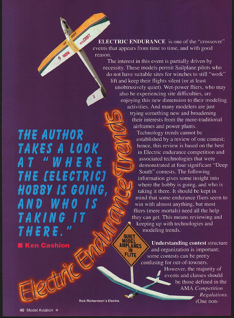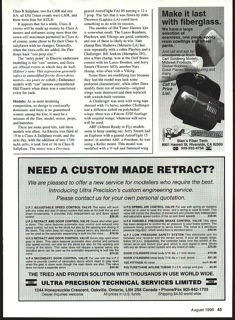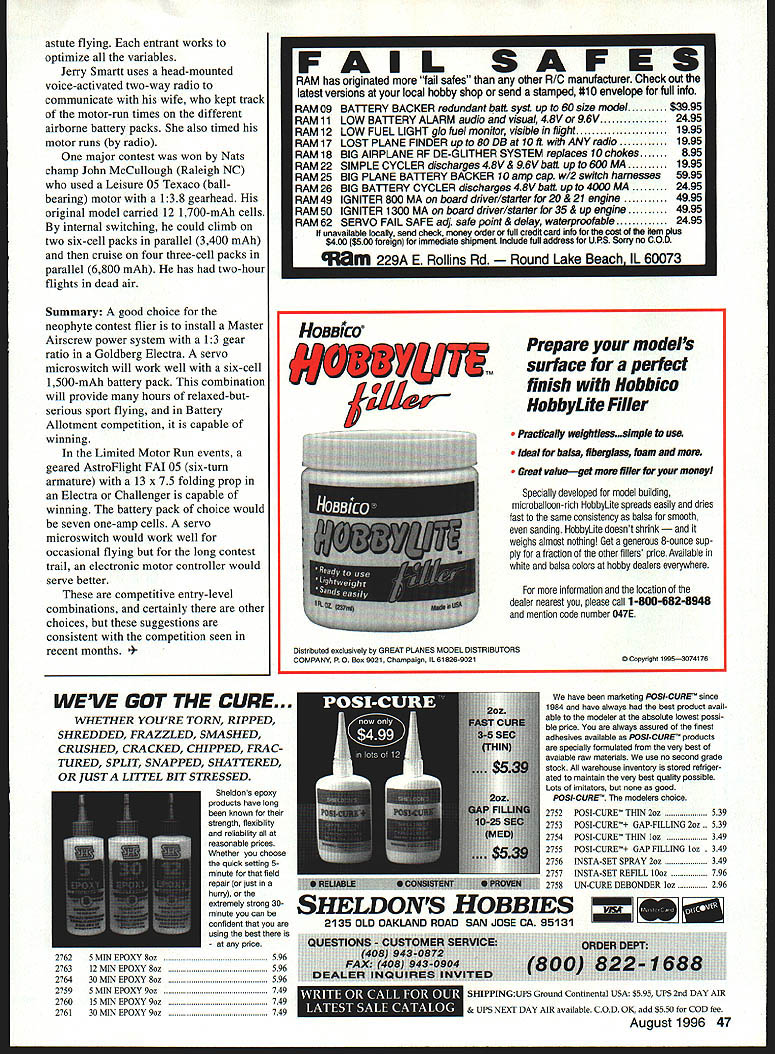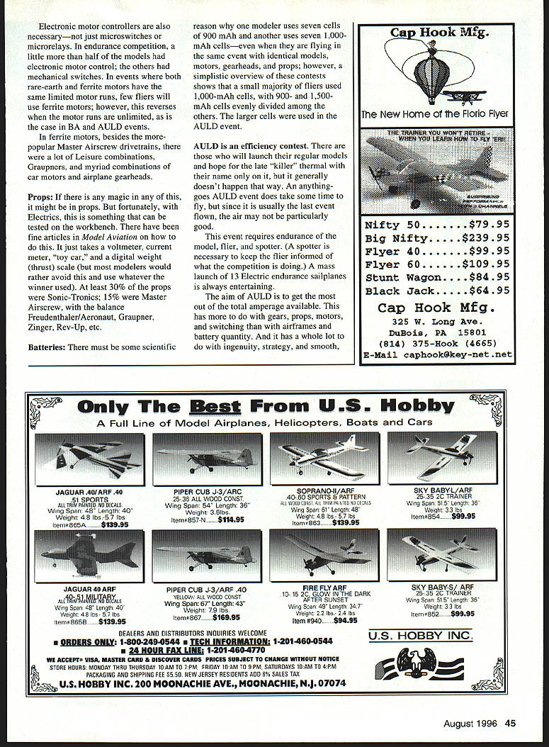 NO OCR TEXT NO OCR TEXT Class B Sailplane two LMR BA Old Timer events LMR four AULD appears Class B events will made up mainly Class motors airframes using seven-cell maximum permitted Class course some chose fly Class sailplanes no changes Generally extra cells added flier drops back prop size entry point Electric endurance modeling can motors official events well Editors note expression generally refers unmodified ferrite direct-drive motorsno gears cobalt Endurance models can motors outnumbered Old Timers sanctioned event Models As modeling competition no design continually dominant no guaranteed winner among kits must mixture flier model motor props batteries some good kits models win often An Electra third 19 Class Sailplane event next day addition two 1700mAh cells took first 16 Class B Sailplane motor five-turn geared AstroFlight FAI 05 turning 12 x 7 prop fact flown John Thornton Laplace LA could have something its success number Old Timer Electric kits somewhat small Lanzo Bombers Playboys Vikings good certainly likely win Nats champ Ben Mathews Metairie LA has won repeatedly cabin Playboy Challenger Bill Jenkins Memphis TN also Nats champ won Gulf States contest Lanzo Bomber Jerry Smartt Warsaw MO another Nats champ wins often Viking Some fliers modifying kits because feel model may lack some preferred characteristic other fliers modify out necessityoriginal wings destroyed replaced scratch-built versions Challenger seen wing tops sheeted A2 balsa another Challenger different airfoil polyhedral wings Falcon 525E fuselage original wings whatever will serve will used ARF Almost Ready Fly models seem keep coming out Jerry Smartt Explorer geared AstroFlight 15 motor another ARF Freedom using Keller motor model modified V-tail flattened wing August 1996 43 center section both models servos mounted well aft servo tops protruding above fuselage Scratch-built models flown occasionally Old Timer events reasons given above few modelers want fly something different scratchbuilt 72-inch Cumulus Old Timer entered contests though large Class did win contest lot plans Old Timers scratch-built models will seen few originals flying development motor/battery technology such super airframe probably long way off Meanwhile designers busy trying different ideas will still have outfly fine easy-to-buildand-trim kits such Electras Challengers First second places major contest event went originals worthy comment Class first place winner George Parks Austin TX 39-ounce 80-inch-span #4 powered five-turn nongeared AstroFlight FAI 05 turning 7 x 6 prop Second place went Gary Warner Richardson TX Ohm-Mega model has interesting 82-inch hybrid wing wing leading edge high point vacuum-bagged obechi over white foam high point trailing edge traditional balsa construction complement 650 square inches light just 35 ounces non-geared AstroFlight FAI 05 motor modified New Creations R/C turned 8 x 6 prop Motors choices increasingeven rare-earth magnet motorsbut AstroFlight samarium cobalt motors still popular serious endurance flying New Creations R/C modifying AstroFlight motors increases options Besides having full-service capability New Creations R/C can mill two ounces 05 motor frame gearhead can also install lighter gears shafts save another ounce five-turn armature parallel braids brushes timed maximum power becomes really potent motor Limited Motor Run events least six motors flying major contests Currents 05 cobalt motors rapidly moved 35 50 amps 60 amps now some fliers drawing 70 amps higher currents require some serious removal metal around motor increase cooling 44 Model Aviation Rich Uravitch P-47 Razorback Vacuum Forned Canopy & Cowl ine & Die Cut Parts Wing Span 40 Length 29 Engine 15 25 Radio Standard Servos Introductory Price$5499 Mini Sukhoi Nick Ziroli Wing Span 34 Wing Area 245 Sq Length 24 Engine 049 099 2 4ChMiniRadoReqs ed Price$32 99 HOBBY HANGAR 1862 Pete shu g Rd Hebron KY 41048 1 800 611 3860 rs Only 606-334-4330 omer Service 606-334-4333 Add $6 tor Shipping & Handling Prices Suhiect Change Any Time juckheedT-33 80 scale trainer w- inm comnosite twn Top Gun scale winner ect jet trainer Speed record hokfer240 mph SPEND SIX BUCKS SAVE BUNDLE Thinking jets Think about modelers choosing BVM jets start because theyre far away best engineered complete highest performing Just attend jet fly see yourself So often after modelers built flown BVM jet tell us gosh wish Id bought BVM jet first Buy cheap buy twice never rang truer youre interested turbines youve come right place leading way JPX turbine sales turbine kit production Order catalog choose right jet first project VM Bob Violelt Models Inc 170 SR 419 Winter Springs FL 32708 PH 407-327-6333 FAX 407-327-5020 Electronic motor controllers also necessarynot just microswitches microrelays endurance competition little half models electronic motor control others mechanical switches events both rare-earth ferrite motors have same limited motor runs few fliers will use ferrite motors however reverses motor runs unlimited case BA AULD events ferrite motors besides morepopular Master Airscrew drivetrains lot Leisure combinations Graupners myriad combinations car motors airplane gearheads Props If magic might props fortunately Electrics something can tested workbench have fine articles Model Aviation just takes voltmeter current meter toy car digital weight thrust scale modelers would rather avoid use whatever winner used least 30% props Sonic-Tronics 15% Master Airscrew balance Freudenthaler/Aeronaut Graupner Zinger Rev-Up etc Batteries There must some scientific reason modeler uses seven cells 900 mAh another uses seven 1000mAh cellseven flying same event identical models motors gearheads props however simplistic overview contests shows small majority fliers used 1000-mAh cells 900- 1500mAh cells evenly divided among others larger cells used AULD event AULD efficiency contest will launch regular models hope late killer thermal name it generally doesnt hap