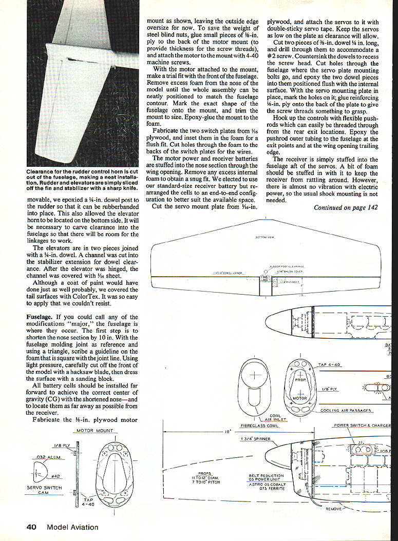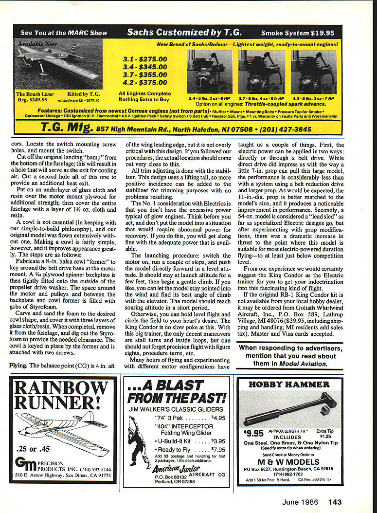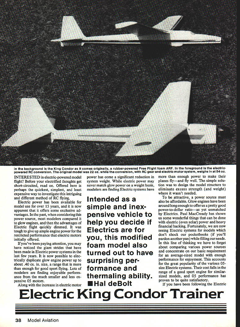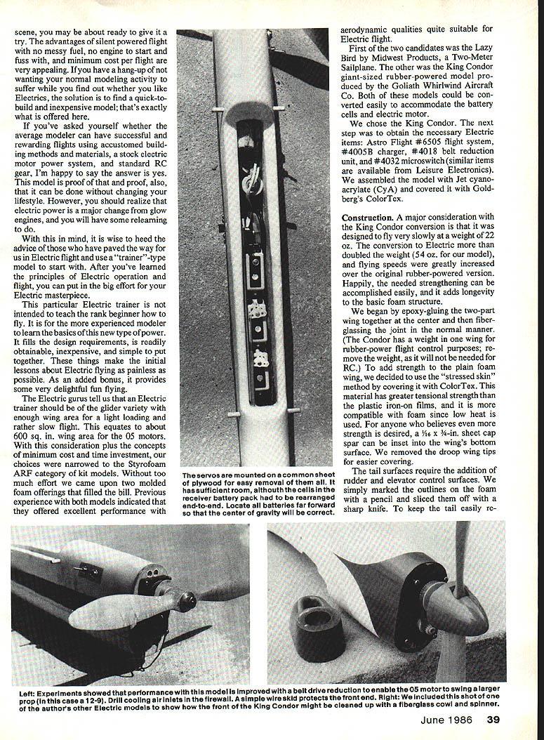 In background King Condor comes originally rubber-powered Free Flight foam ARF foregrouna electric powered RC conversion original model 22 oz conversion RC gear electric motor system weighs 54 oz INTERESTED electric-powered model flight Before electrified thoughts get short-circuited read Offered perhaps quickest simplest least expensive way investigate intriguing different method RC flying Electric power has available model use over 15 years now apparent offers some exclusive ad vantages past considering power source modelers compared glow engines advantages Electric flight quickly dimmed tough give up ample engine power restricted performance electric motors initially offered youve paying attention may have noticed giant strides have made Electric power systems last few years now possible elec trically duplicate glow engine power up about 40 cu size range enough good sport flying Lots modelers finding enjoyable perform ance much smaller less ex pensive 05 motors Along increase electric motor power has come significant reduction system weight electric power may never match glow power weight basis modelers finding Electric systems have Intended simple inex pensive vehicle help decide Electrics modified foam model also turned out have surprising per formance thermaling ability EHal deBolt enough power make planes flyand fly well simple solu tion design model structure eliminate excess strength weight wasnt needed attractive power source must also affordable Glow engines have around long enough offer us pretty good power-to-dollar ratioas yet unmatched Electrics Paul MacCready has shown us some wonderful things can done electric solar power heavy financial backing Fortunately now seeing Electric systems models dont shock pocketbooks youll pardon another pun filling needs line thinking have forget about comparing various power sources concentrate basic requirement average-sized model enough performance enjoyment accounts great popularity various 05size Electric systems cost falls range good sport engine similarsized models 05 performance has proven quite satisfactory have following Electric Electric King Condor Trainer 38 Model Aviation scene may about ready give try advantages silent powered flight no messy fuel no engine start fuss minimum cost per flight very appealing have hang-up wanting normal modeling activity suffer find out whether like Electrics solution find quick-tobuild inexpensive model thats exactly what offered youve asked yourself whether average modeler can have successful rewarding flights using accustomed build ing methods materials stock electric motor power system standard RC gear Im happy say answer yes model proof proof also can done changing lifestyle However should realize electric power major change glow engines will have some relearning mind wise heed advice have paved way us Electric flight use trainer-type model start After youve learned principles Electric operation flight can put big effort Electric masterpiece particular Electric trainer intended teach rank beginner fly experienced modeler learn basics ofthis new type power fills design requirements readily obtainable inexpensive simple put together things make initial lessons about Electric flying painless possible As added bonus provides some very delightful fun flying Electric gurus tell us Electric trainer should glider variety enough wing area light loading rather slow flight equates about 600 sq wing area 05 motors consideration plus concepts minimum cost time investment choices narrowed Styrofoam ARF category kit models Without too much effort came upon two molded foam offerings filled bill Previous experience both models indicated offered excellent performance aerodynamic qualities quite suitable Electric flight First two candidates Lazy Bird Midwest Products Two-Meter Sailplane other King Condor giant-sized rubber-powered model pro duced Goliath Whirlwind Aircraft Co Both models could con verted easily accommodate battery cells electric motor chose King Condor next step obtain necessary Electric items Astro Flight #6505 flight system #4005B charger #4018 belt reduction unit #4032 microswitch similar items available Leisure Electronics assembled model Jet cyano acrylate CyA covered Gold bergs ColorTex Construction major consideration King Condor conversion designed fly very slowly weight 22 oz conversion Electric doubled weight 54 oz model flying speeds greatly increased over original rubber-powered version Happily needed strengthening can accomplished easily adds longevity basic foam structure began epoxy-gluing two-part wing together center fiber glassing joint normal manner Condor has weight wing rubber-power flight control purposes re move weight will needed RC add strength plain foam wing decided use stressed skin method covering ColorTex material has greater tensional strength plastic iron-on films compatible foam since low heat used anyone believes strength desired 1/16 x -in sheet cap spar can inset wings bottom surface removed droop wing tips easier covering tail surfaces require addition rudder elevator control surfaces simply marked outlines foam pencil sliced off sharp knife keep tail easily re Left Experiments showed performance model improved beit drive reduction enabiethe 05 motorto swing larger prop case 1 2g Drill cooling air inlets firewall simple wire skid protects front end Right Included shot authors other Electric models show front King Condor might cleaned up fiberglass cowl spinner June 1986 39 servos mounted common sheet plywood easy removal has sufficIent room aithouth cells receiver battery pack rearranged end-to-end Locate batteries far forward center gravity will correct movable epoxied -in dowel post rudder can rubberbanded place also allowed elevator horn located bottom side will necessary carve clearance fuselage wilt room linkages work elevators two pieces joined -in dowel channel cut stabilizer extension dowel clear ance After elevator hinged channel covered 6 sheet 