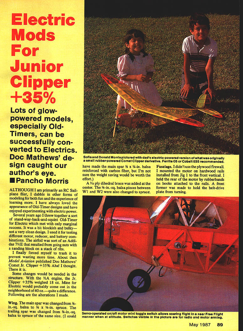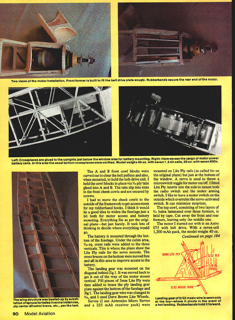 Electric Mods Junior Clipper 35% Lots glowpowered models especially OldTimers can successfully con verted Electrics Doc Mathews de sign caught authors eye U Pancho Morris ALTHOUGH am primarily RC Sail plane ifier dabble other forms modeling both fun experience learning have always loved appearance Old-Timer designs have enjoyed experimenting electric power Several years ago threw together sort stand-way-back-and-squint Old-Timer Electric met marginal success bit blockish bulky vexy clean design used testing different motor reducer battery com binations airfoil sort Addi das ThE resulted going nuts sanding block stack ribs finally forced myself trash prevent wasting time About Model Aviation published Doc Mathews Comet Jr Clipper 35% Aba thought Some changes would needed structure engine Jr Clipper 35% weighed 18 oz Mine Electric would probably come out neighborhood 40 ozquite difference Following alterations made Whig main spar changed in-sq balsa n spruce trailing spar changed -in-sq balsa spruce same size could have made main spar in balsa Fuselage didnt use plywood firewall reinforced carbon fiber Im mounted motor hardwood rails sure weight saving would worth installed Jig 1 front vertical effort held rear motor rubberbands Y32 ply dihedral brace added hooks attached rails front center -in-sq balsa pieces between former made hold belt-drive Wi W2 also changed spruce plate turning May1987 89 Sofia Donald Morris pictured dads electric-powered version what originally small rubberpowered Comet Ciipperderivatlve Ferrite 05 Cobalt 035 recommended vuupuruIuu UII/I mujur mini ruggi uwijan aimuw coaring yiigni near tres manner aitbiude Switches visible picture radio motor arming Two views motor InstallatIon Front former built nt tne Delt drive plate snugly Rubberbands secure rear end motor B front cowl blocks carved out clear belt pulleys also mounted hold belt-drive unit held cowl blocks place via 142 ply tabs glued B tabsslip slots front cheek cowls secured screws move cheek cowls outside framework get access room rubberband hooks think would good idea widen fuselage just bit both motor access battery mounting Everything fits per origi nal plansbut just barely took lots thinking decide everything would go battery mounted through bot tom fuselage Under cabin area 346-sq cross rails added three verticals plans show Lite Ply rails servo mounts cross braces bottom moved fore aft area improve access battery landing gear mounted diagonal behind Jig 1 moved back get out way motor mount vertical Fill pieces 3mm Ute Ply added brace ply landing gear plate against bottom fuselage Jig 1 landing gear wire changed /32 used Dave Brown Lite Wheels Servos use Airtronics Micro Servos 225 mAh receiver pack mounted Lite Ply rails called original plans just bottom window servo used throw microswitch toggle motor on/off fitted Lite Ply inserts side mount both radio switch motor arming switch like have motor switch outside overrules servo-activated switch can minimize surprises top cowl consisting two layers Yn balsa laminated over three formers held tape Cut away front rear formers leaving middle motor started out Astro 075 belt drive seven-cell 1200 mAb pack the model weighs 40 oz Continued page 184 3MM UTE PLY c 3/32 PLY 18l KOWE 3/32 MUSIC WIRE Landing gearof 3/32 muslcwlrelssewfloflly topwhere pivots event shot landing Rubberbands hold forward 90 Model Aviation Left Crosapieces glued uprights just below window area battery mounting IlIgni nero see cargo motor power battery calls area usual bottom croaspieces omitted Model weighs 40 oz seven 12 Ah cells 35 oz seven 8005 NEW 4 CYCLE - SERIES 100 THP DESIGN TAILORED HELICAL PITCH DEVELOPED TO GIVE MAXIMUM THRUST AT 4 CYCLE ENGINE RPM ALL THE LATEST TECHNIQUES USED ON OUR PRO SERIES 3 SEE BELOW DIAPITCH THP 1266778 13677/8 146778 1567 16678 PRICE 299 3-79 479 689 989 NEW PRO SERIES 3 NEW HIGH TECH AIRFOIL SECTION 10T020% INCREASE IN THRUST MFG OF SELECT HARD MAPLE WOOD WILL NOT FATIGUE LIKE SYNTHETICS FUEL PROOF HIGH LUSTER FINISH DIAPITCHPRICE 534149 634149 72833458179 8334568189 84566/7199 9456677199 1045667209 106W8W209 106EW219 114677778229 115W229 116EW239 1167239 124W279 125W279 1256279 1356349 1456459 1556659 164N989 16678969 RC PYLON RACING SERIES 500 DIA PITCH PRICE 75N 5N279 8I 6778 299 SERIES 400C 886777289 977/z7289 W WIDE BLADE EW EXTRA WIDE N NARROW BENTOM BROWN JR CAMPBELL COMET COVERITE DUBRO EASY BUILT MODELS ENYA FAt FLYLINE FOX- GOLDBERG GOLDEN AGE REPRO IGENE DUBOIS LOW- K&B- K&S L R - OS MAX PACTRA- PECK-POLYMER NC RFECT R N MODELS- SEAGLEN SIG STERLING- SULLIVAN SUPER TIGRE TAFFINDER TELCO TOP FLITE- TREXLER wILLIAMS & OTHERS ESTES MODEL ROCKETS 3 Send SISOO Cash Cheek Stamps Ion oon 44 page tbloid size DISCOUNT Catalog 900 illustrationsoser 700 Kits choose IMAILORDER PHONEORDER IN STORE PEN1 VILLET BONY CENTER 817KainLansdaluFa 19448 Stearman made Williams Brothers Add wheels engine propeller check whether Stearman balances shown plan needs nose weight achieve proper balance add it bit nose-heavy dont worry point Finish off lead-outs thread through holes N strut guide form eyelet ends per drawings AMA rule book Its time find field dust always fly models steel lines fly much better safe Hook up set 30-ft lines fuel tank start engine Stearman spunky flier lot fun havent treated yourself to- Control Line biplane before sure please tone down bit training flights try putting prop backwards use 35-ft lines will help slow down cutting flight performance very much Just think guys club will react tell youve just soloed Stearman thinking about taking up aerobatics crop dusting Have fun keep em flying CO-2 Airfoiler/Lidberg Continued page 81 foiler should climb left usually considered kiss death pylon model sure enough replica Air foiler climbs nicely wide left turn model exhibits tight turning ten dencies under power put shims between motor mount offset thrust line opposite turn As firm up trim settings switch liquid charge charger pointing down expe