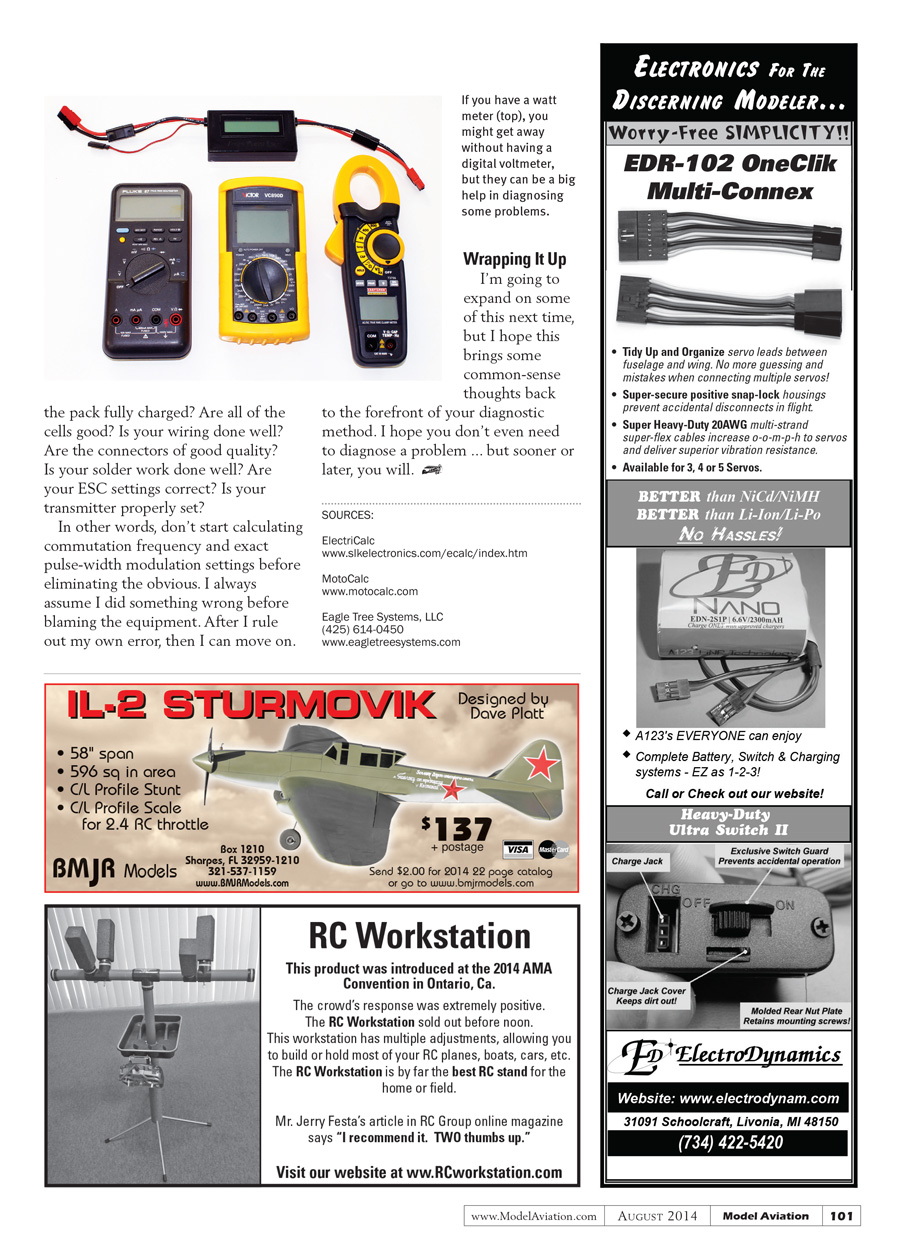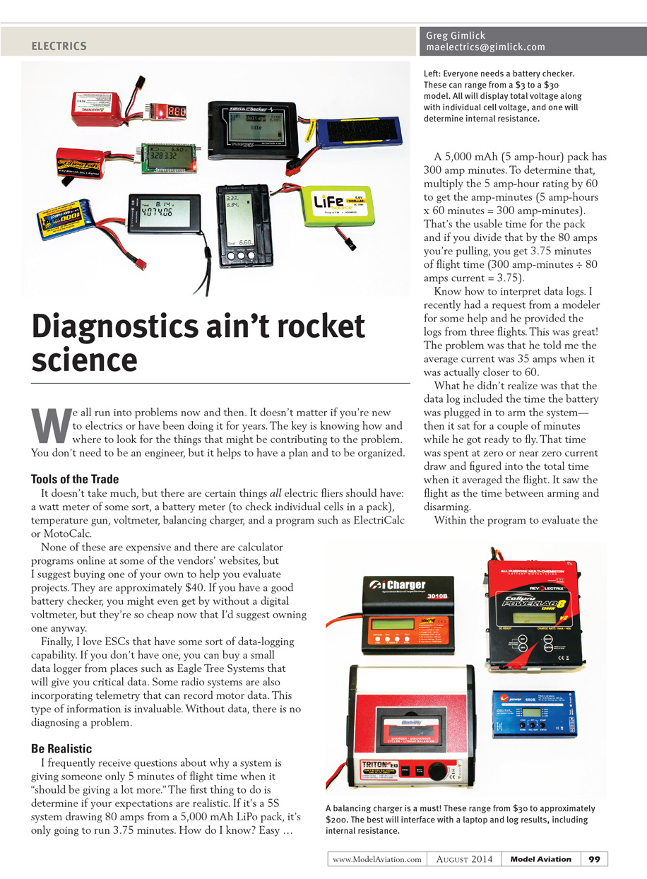 It doesn’t take much, but there are certain things all electric fliers should have: a watt meter of some sort, a battery meter (to check individual cells in a pack), temperature gun, voltmeter, balancing charger, and a program such as ElectriCalc or MotoCalc.