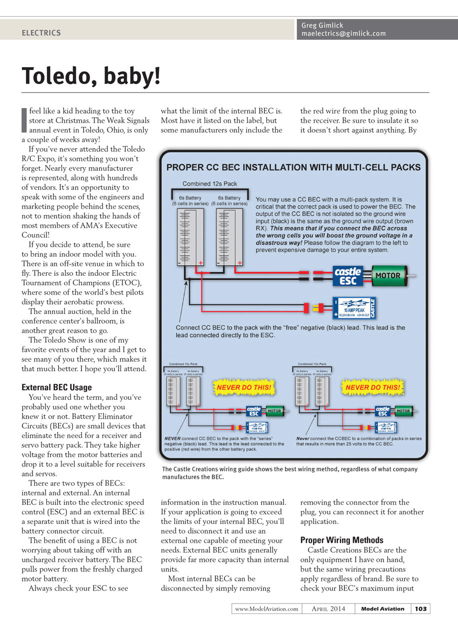 Castle Creations BECs are the only equipment I have on hand, but the same wiring precautions apply regardless of brand. Be sure to check your BEC’s maximum input voltage rating along with the output. The Castle BEC’s output voltage can be programmed to match your requirements.