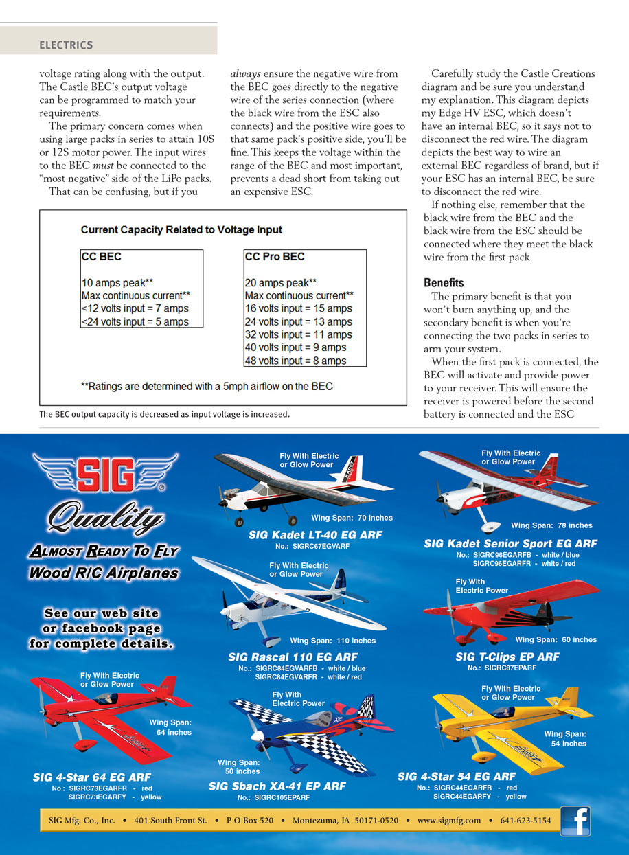 The primary concern comes when using large packs in series to attain 10S or 12S motor power. The input wires to the BEC must be connected to “the most negative” side of the LiPo packs.