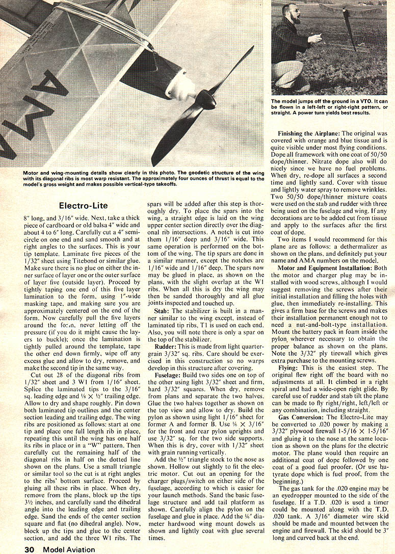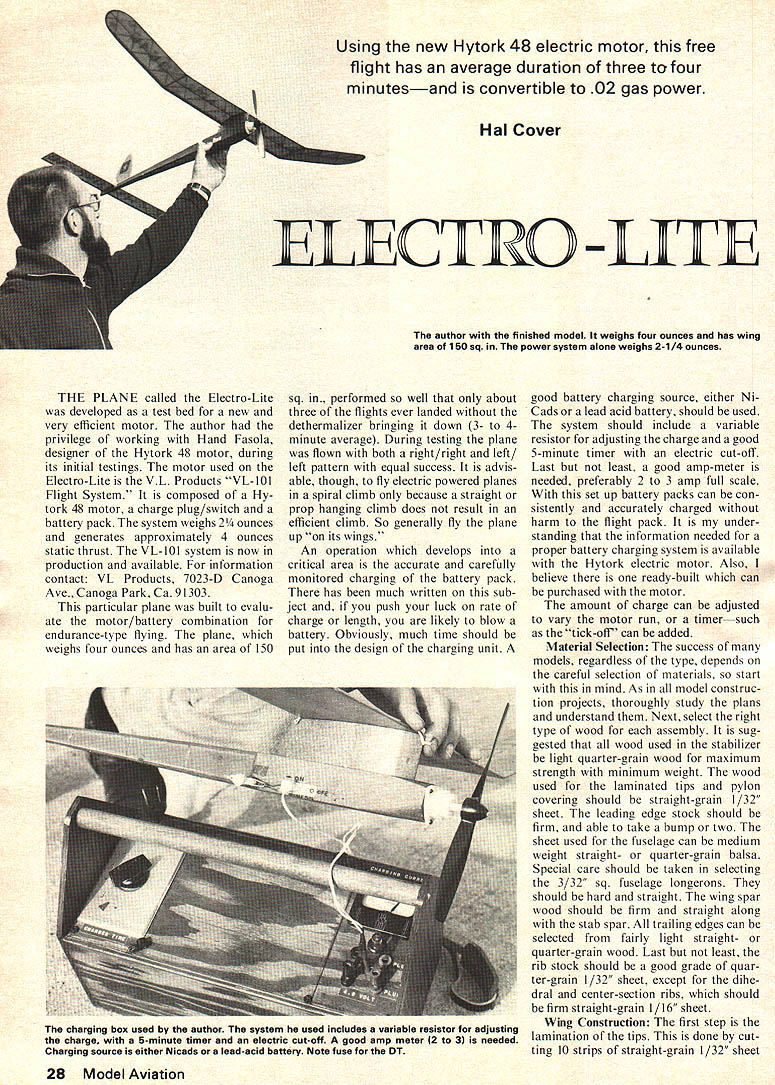 Using new Hytork 48 electric motor free flight has average duration three tofour minutesand convertible 02 gas power Hal Cover ELECTIIIIO -LUTE author finished model weighs four ounces has wing area 150 sq power system alone weighs 2-1/4 ounces THE PLANE called Electro-Lite developed test bed new very efficient motor author privilege working Hand Fasola designer Hytork 48 motor during its initial testings motor used Electro-Lite VL Products VL-I0I Flight System composed Ky tork 48 motor charge plug/switch battery pack system weighs 21/4 ounces generates approximately 4 ounces static thrust VL-l0l system now production available information contact VL Products 7023-D Canoga Ave Canoga Park Ca 91303 particular plane built evalu ate motor/battery combination endurance-type flying plane weighs four ounces has area 150 sq performed well about three flights ever landed dethermalizer bringing down 3- 4minute average During testing plane flown both right/right left/ left pattern equal success advis able though fly electric powered planes spiral climb because straight prop hanging climb does result efficient climb So generally fly plane up its wings An operation develops critical area accurate carefully monitored charging battery pack has much written sub ject push luck rate charge length likely blow battery Obviously much time should put design charging unit good battery charging source either NiCads lead acid battery should used system should include variable resistor adjusting charge good 5-minute timer electric cut-off Last least good amp-meter needed preferably 2 3 amp full scale set up battery packs can con sistently accurately charged harm flight pack under standing information needed proper battery charging system available Hytork electric motor Also believe ready-built can purchased motor amount charge can adjusted vary motor run timersuch tick-off can added Material Selection success models regardless type depends careful selection materials start mind As model construc tion projects thoroughly study plans understand Next select right type wood assembly sug gested wood used stabilizer light quarter-grain wood maximum strength minimum weight wood used laminated tips pylon covering should straight-grain 1/32 sheet leading edge stock should firm able take bump two sheet used fuselage can medium weight straight- quarter-grain balsa Special care should taken selecting 3/32 sq fuselage longerons should hard straight wing spar wood should firm straight along stab spar trailing edes can selected fairly light straight- quarter-grain wood Last least rib stock should good grade quar ter-grain 1/32 sheet except dihe dral center-section ribs should firm straight-grain 1/16 sheet Wing Construction first step lamination tips done cut ting 10 strips straight-grain 1/32 sheet 28 Model Aviation charging box used author system used includes variable resistor adjusting charge 5-minute timer electric cut-off good amp meter 2 3 needed Charging source either Nicads lead-acid battery Note fuse DT Electro-Lite 8 long 3/16 wide Next take thick piece cardboard old balsa 4 wide about 4 6 long Carefully cut 4 semi circle end sand smooth right angles surfaces tip template Laminate five pieces 1/32 sheet using Titebond similar glue Make sure no glue either ner surface layer outer surface layer five outside layer Proceed tightly taping end five layer lamination form using l-wide masking tape making sure approximately centered end form Now carefully pull five layers around fon never letting off pressure might cause lay ers buckle once lamination tightly pulled around template tape other end down firmly wipe off excess glue allow dry remove make second tip same way Cut out 28 diagonal ribs 1/32 sheet 3 WI 1/16 sheet Splice laminated tips 3/16 sq leading edge 1/8 X ling edge Allow dry shape roughly Pin down both laminated tip outlines center section leading trailing edge wing ribs positioned follows start tip place full length rib place repeating until wing has half its ribs place W pattern carefully cut remaining half diagonal ribs half dotted line shown plans Use small triangle similar tool cut right angles ribs bottom surface Proceed gluing ribs place dry remove plans block up tips 3 inches carefully sand dihedral angle leading edge trailing edge Sand ends center section square flat no dihedral angle Now block up tips glue center section add three WI ribs spars will added after step thor oughly dry place spars wing straight edge laid wing upper center section directly over diag onal rib intersections notch cut 1/16 deep 3/16 wide same operation performed bot tom wing tip spars done similar manner except notches 1/16 wide 1/16 deep spars now may glued place shown plans slight overlap Wl ribs dry wing may sanded thoroughly glue joints inspected touched up Stab stabilizer built man ner similar wing except instead laminated tip ribs TI used end Also will note spar top stabilizer Rudder made light quartergrain 3/32 sq ribs Care should exer cised construction no warps develop structure after covering Fuselage Build two sides top other using light 3/32 sheet firm hard 3/32 squares dry remove plans separate two halves Glue two halves together shown top view allow dry Build pylon shown using light 1/16 sheet former former B Use 1/6 X 3/16 front rear pylon uprights use 3/32 sq two side supports dry cover 1/32 sheet grain running vertically Add ngle stock nose shown Hollow out slightly fit elec tric motor Cut out opening charger plugs/switch either side fuselage according easier launch methods Sand basic fuse lage structure add tail platform shown Carefully align pylon fuselage glue place Add /6 dia meter hardwood wing mount dowels shown lightly coat glue several times Finishing Airplane original covered orange blue tissue quite visible under flying conditions Dope framework coat 50/50 dope/thinner Nitrate dope also will nicely since have no fuel problems dry re-dope surfaces second time lightly sand Cover tissue lightly water s