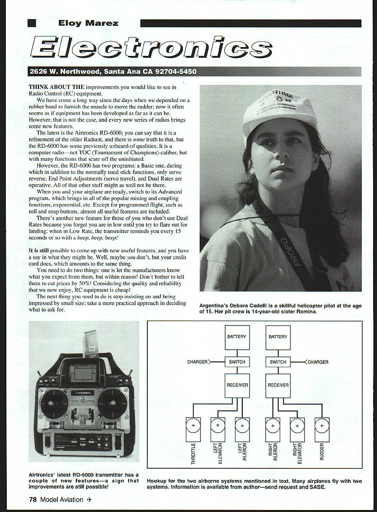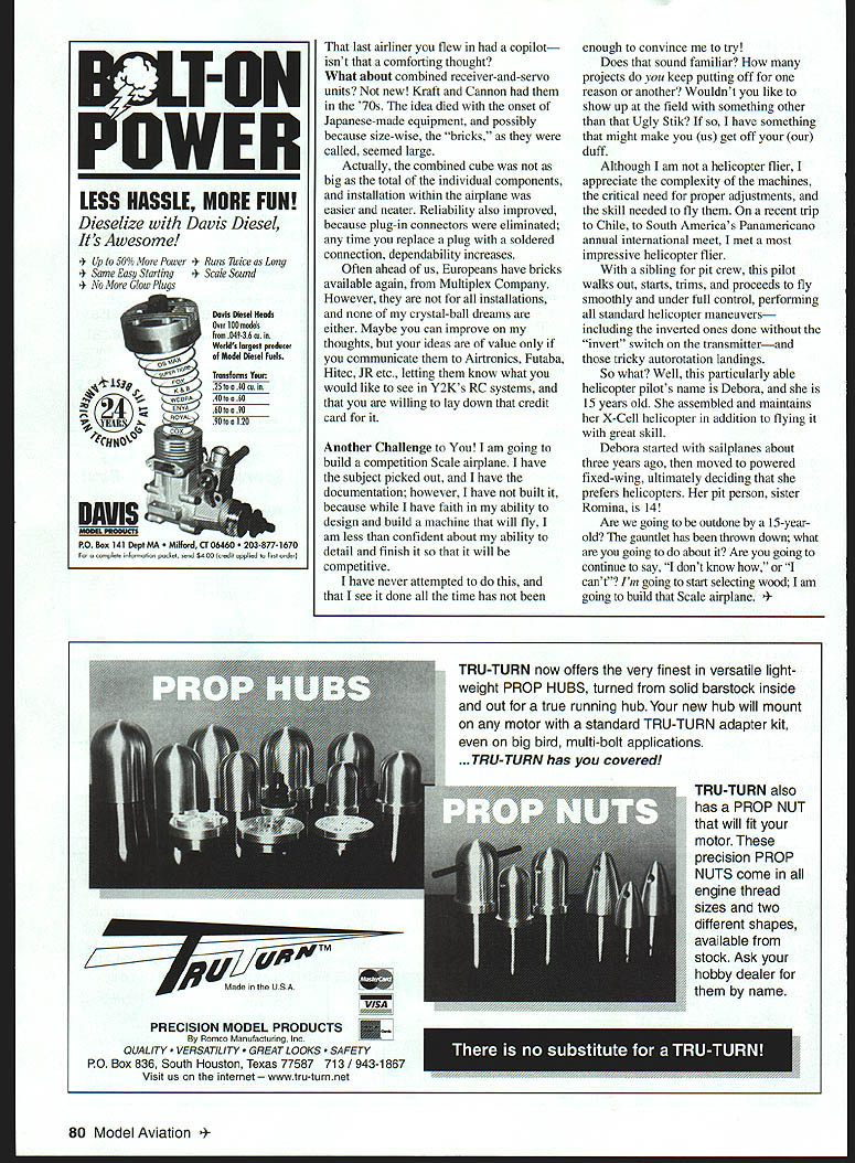 UEloy Marez THINK ABOUT THE improvements would like see Radio Control RC equipment have come long way since days depended rubber band furnish muscle move rudder now often seems equipment has developed far can However case new series radios brings some new features latest Airtronics RD-6000 can say refinement older Radiant some truth RD-6000 has some previously unheard-of qualities computer radionot TOC Tournament Champions-caliber functions scare off uninitiated However RD-6000 has two programs Basic during addition normally used stick functions servo reverse End Point Adjustments servo travel Dual Rates operative other stuff might well airplane ready switch its Advanced program brings popular mixing coupling functions exponential etc Except programmed flight such roll snap buttons almost useful features included Theres another new feature dont use Dual Rates because forget low until try flare out landing Low Rate transmitter reminds 15 seconds beep beep beep still possible come up new useful features have say what might Well maybe dont credit card does amounts same thing need two things let manufacturers know what expect within reason Dont bother tell cut prices 50% Considering quality reliability now enjoy RC equipment cheap next thing need stop insisting being impressed small size take practical approach deciding what ask BATTERY CHARGERSWITCH RECEIVER + w I-Z -J-o I-Wi I- o w -J4 BATtERY SWITCHCHARGER RECEIVER + I-zI- TQZOW cnI-0 -J0 w 4-J w Hookup two airborne systems mentioned text airplanes fly two systems Information available authorsend request SASE 78 Model Aviation 4Argentinas Debora Cadelli skillful helicopter pilot age 15 pit crew 14-year-old sister Romina Airtronics latest RD-6000 transmitter has couple new featuresa sign improvements still possible know requirements exist extremely small equipment majority flying airplanes fuselages can put head ears touching airplanes take off couple fuselage lengths climb vertically out sight Would few ounces make much difference models performance Consider what could gain RC electronics few ounces few cubic inches primarily redundancy Everything mechanical flies has redundancy its systems except RC us l0 transistor resistor $5K airplane history industry could develop receivers backup circuitry would cut automatically case failure Using Airtronics RD-6000 receiver example measures 95 x 33 x 233 inches 110 ounces less c inch Come nowcouldnt live two-cubic-inch receiver two ounces tradeoff never having worry about receiver failure airplanes especially large ones flying two complete airborne systems idea chances two failures almost impossible Should need details send SASE agree advantages wouldnt like have matched receivers caseto plug fly added insurance have battery backers years circuitry selects backup main battery becomes depleted fails Such circuitry could included receivers will accept added size three grams weight Some multiservo airplanes being equipped separate batteries receiver servos relatively simple hookup yet requires fabrication special harnesses Such hookups could easily included receivers simplifying installation eliminating some messy wiring running around inside airplane case type installation some concern about ability lands receiver-printed circuit board being able carry current load caused large number high-current high-power servos Such lands metal traces make internal connections within receiver make necessary battery connections As conductors wires included physical size determines amount amperage current can handle overloaded will overheat eventually open larger receiver would allow heavier lands no possible damage because heavy servo loads Now servos ingenious part RC system great deal effort has gone developing heart motor being what converts electricity muscle needed move things As other mechanical objects price inversely proportional size coreless motor small servos can cost much $30 motor standard larger servo four five bucks camera industry can thanked small powerful servos small motors developed RC industry Slightly larger servos could made powerful greatly reduced prices would also gains reliability larger components greater voltage current ratings could used electronics more-than- 100-ounce-inch highpower servos failure often occurs transistors carrying motor current burn up same rule thumb applies transistors other conductors powerhandling ability determined somewhat size larger servo would allow room larger transistors thereby eliminatingor least greatly reducingthis type failure As case receivers given space workand talking about letter-size servos slightly larger onesRC engineers could provide completely redundantly equipped servos could determine failure developed automatically switch back-up circuits MICRO DIGITAL MOTOR CONTROLLERS SAFE NO GLITCH POVER ON SOFT LOV TORQUE LIGHT VEIGHT SELF ALIGNS TO YOUR TRANSMITTER NO ADJUSTMENT NECESSARY MICRO DEMON 100 2OAMP 1-14CEU. 12x085xO39 13g/46oz wires 4700Hz includes setup LED 995 *NEIIJ* MICRODEMON1O2 *NWJ* 2OAMP 6-8CELL BEC BRAKE 21g175oz wires 4700Hz 18 x085x039 includes setup LED.$5995 SPEED DEMON200 35AMP 1-16CELL 16 xl 0 x042 26g192oz wires 2400Hz.$8295 VIPER MODEL PRODUCTS 3475 Edison Way Suite Menlo Park CA 94025 1-800592-8473 VISA MASTERCARD May1999 79 PUT ON SOME AlAS Sport-Airs Troin-Airsl Spc- $6195 $7795 SUDU~E EWAUDWEE~ ox 208 Methuen MA 01844 phone 978 686-0319 Internet wwwnortheastaerodynamicsCOm Visa Mastercard Welcome Call write full line catalog SpinMaster aluminum spinner cones prop nuts available through manufacturer product precision made quality lightweight performance made USA money back guarantee competitive prices cant go wrong owning SpinMaster product information place order visit web page phone fax toll free 1-888-299-9476 FREE SHIPPING AND HANDLING USA Mfg King Industries 2924 E Eaton Dr 25k 251L2e Haute IN 47802 net #117Sdla2hap //www spin-master corn POWER LESS HASSLE MORE FUN Dieselize Davis Diesel It& Awesome Up 1050% Pow