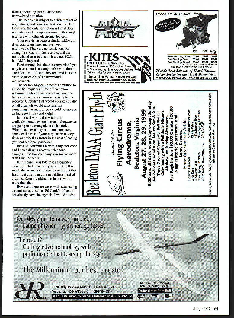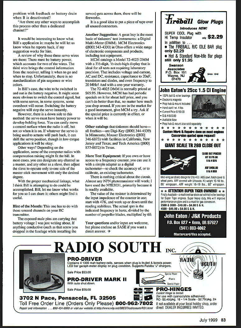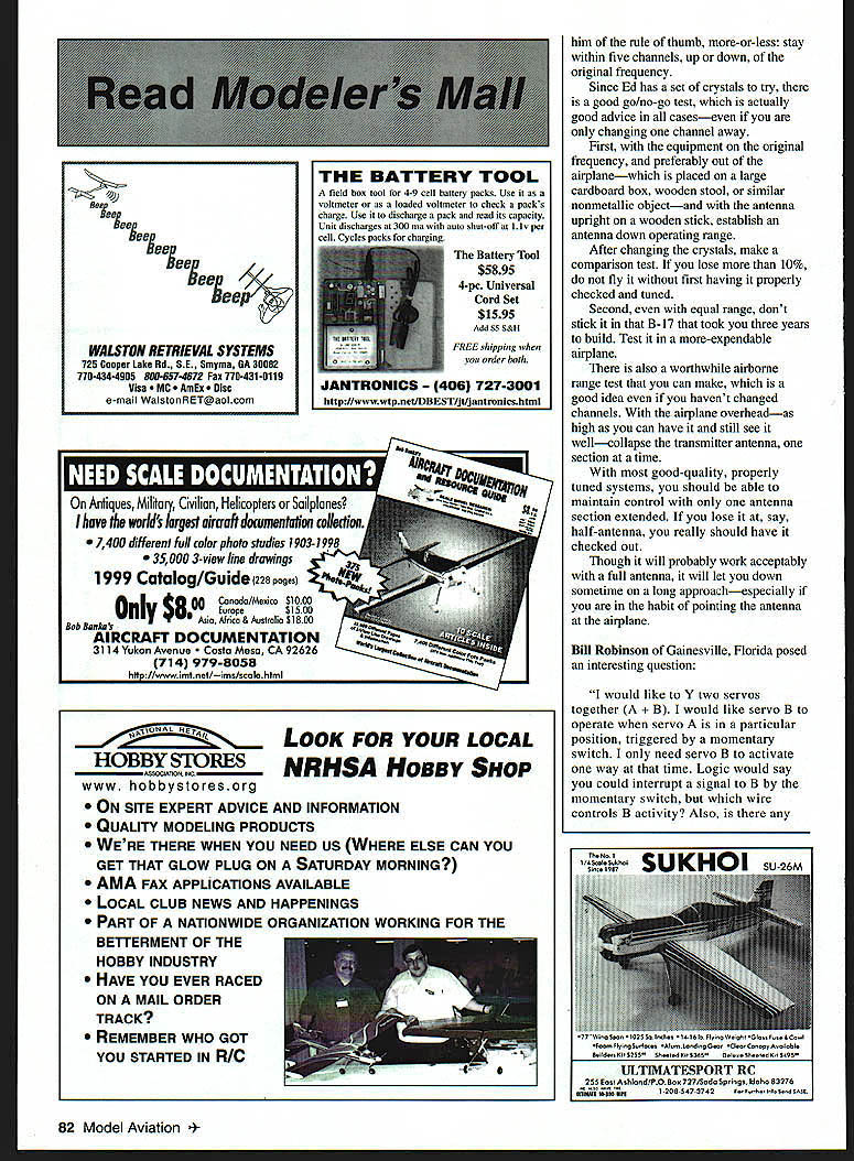 UEloy Marez WI VI U'in THE MAIL HAS started come thanks wrote welcoming Model Aviation offering best wishes Other mailjust welcomearrived questions such Edward 0 Clark III Columbia SC have two transmitters Futaba EP T4NBF 1 channel 50 damaged beyond repair 2 channel 36 operable Can take crystal #50 use operable transmitter #36 safely have done bench seems work OK have varying advice issue have heard question often dont remember ever seeing answered instruction manual very good reason Federal Communications Commission FCC regulations specifically prohibit changing crystals Radio Control RC transmitters crystals easily accessible transmitters plugged socket rather soldered guess same transmitters being made sale countries such restrictions some countries have no regulations RC equipment reasoning proper testing tuning required transmitter can operate such manner will cause interference other intended frequency RC companies handle situation different ways some make crystals readily availahle others provide qualified service centers subject FCC regulations Type Approval label back transmitter indicates meets pertinent FCC restrictions specifications after testing certified independent laboratories Type Approval granted equipment installed frequency furnished antenna hut another matter Said specifications include Wire Sequence Popular RC Servos 123 Airtronics Standard B ODD B Futaba C ODD Li C Airtronics HiTec Tower 1 Black Signal 2 Black Negative 3 BlackStriped Positive Left White Signal Center Red Positive Right Black Negative Left White Signal Center Red Positive Right Black Negative Left Orange Signal Center Red Positive Right Brown Negative 80 Model Aviation Electronics great Digital Multi-Meter non-laboratory troubleshooting testingoften available reduced cost No Connection Frequency Counter R See Text Photo Transistor simple circuit will allow read propeller speed frequency counter useful engine testing and/or check calibration field tachometer CJR things including all-important narrowband emission receiver subject different set regulations comes its own sticker However restriction does radiate radio frequency energy might interfere other electronic devices television bears similar sticker does telephone microwave no restrictions changing crystals receiver narrowband restrictions FCC- AMA-imposed Furthermore double conversion may hear about anyones restriction specificationits circuitry required some cases meet AMAs narrowband requirements reason equipment pretuned specific frequency efficiency maximum radio frequency output transmitter maximum sensitivity receiver Circuitry would operate equally channels would also result something would accept an increase size weight real world crystals availableand aresystem frequencies going changed safely comes radio maintenance consider cost airplane money time both factor cost having radio properly serviced Because Airtronics within area code can call no extra telephone charges use company source use others case told frequency change including new crystals $35 worth to have sweat out first flight after plugging different set crystals oldest airplane worth However cases extenuating circumstances such Ed Clarks did already have crystals would advise IKITES - FREE COLOR CATALOG Choose over 200 exc t ng k tes S unusual & Innovative des gns Call write catalog todayl Into Wind 541-0314 1408-MA Pearl St Boulder Co 80302 mm Sm mw U 0 0 -U U Q% Iog ouco C o R z C 0 July 1999 81 u/c RIC UCS R/C Plain Bearing Glow 500055006000 Ball Bearing Glow 650070007500 Ball Bearing Diesel 650070007500 engines include silencer Add $500 P&H per Order Visa & M/C OK esid ed Sdaa e eead Sa9e4 Calson Engine lmporls 814 E Marconi Ave Phoenix AZ USA 85022- Ph/Fax 602-863-1684 a a. a I. C -5 C C T11 1 i i [] ntiques Military Civilian Helicopters Sailpianes hove worlds largest aircraft documentation colledion 7400 different full color photo studies 1903-1998 35000 3-view line drawings t 1999 Catalog/Guide 228 pages LCanada Mex $1000 eOoo Euope$1500 US As Bob BankasAt ca & Aus a $1800 AIRCRAFT DOCUMENTATION 3114 Yukon Avenue a Mesa CA 92626 714 979-8058 4IRca ONAeA7~ HOBBY STORES ASSOCSATtOB INC www hobbystoresorg ON SITE EXPERT ADVICE AND INFORMATION QUALITY MODELING PRODUCTS WERE THERE WHEN YOU NEED US WHERE ELSE CAN YOU GET THAT GLOW PLUG ON SATURDAY MORNING AMA FAX APPLICATIONS AVAILABLE LOCAL CLUB NEWS AND HAPPENINGS PART OF NATIONWIDE ORGANIZATION WORKING FOR THE BETTERMENT OF THE HOBBY INDUSTRY HAVE YOU EVER RACED ON MAIL ORDER TRACK REMEMBER WHO GOT YOU STARTED IN R/C him rule thumb more-or-less stay within five channels up down original frequency Since Ed has set crystals try good go/no-go test actually good advice caseseven changing channel away First equipment original frequency preferably out airplanewhich placed large cardboard box wooden stool similar nonmetallic objectand antenna upright wooden stick establish antenna down operating range After changing crystals make comparison test lose 10% fly first having properly checked tuned Second equal range dont stick B- 17 took three years build Test more-expendable airplane also worthwhile airborne range test can make good idea havent changed channels airplane overheadas high can have still see wellcollapse transmitter antenna section time good-quality properly tuned systems should able maintain control antenna section extended lose say half-antenna really should have checked out Though will probably work acceptably full antenna will let down sometime long approachespecially habit pointing antenna airplane Bill Robinson Gainesville Florida posed interesting question would like Y two servos together uld like servo B operate servo particular position triggered momentary switch need servo B activate way time Logic would say could interrupt signal B momentary switch wire controls B activity Also 82 Model Aviation Bee ee ee2 Bee THE BATTERY TOOL field box tool 4 9 cell battery packs Use voltmeter loaded voltmeter check packs