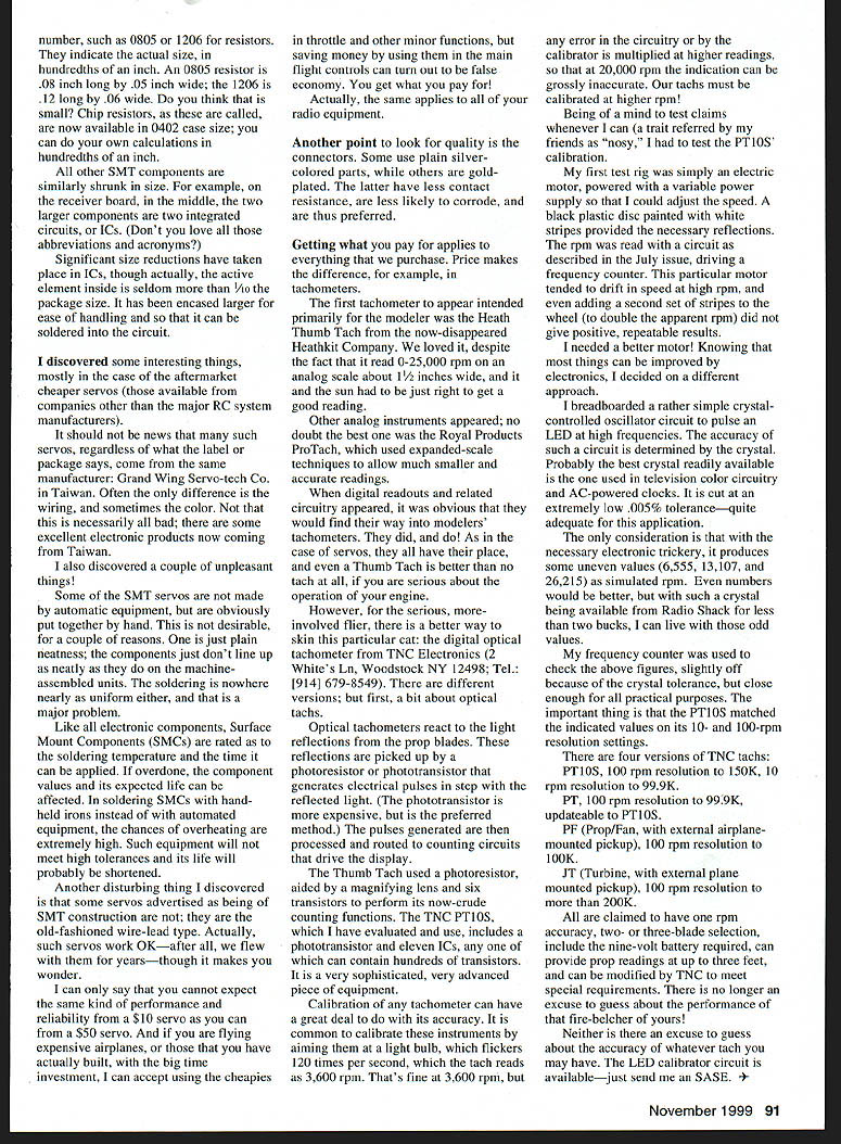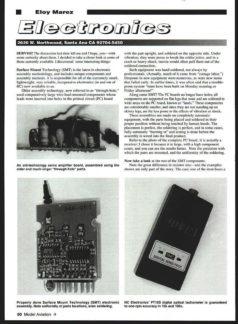 Eloy Marez SERVOS discussion last time left hope youwith some curiosity about decided take closer look some currently available discovered some interesting things Surface Mount Technology SMT latest electronic assembly methodology includes unique components assembly methods responsible extremely small lightweight very reliable inexpensive electronics out RC now available us Older assembly technology now referred through-hole used comparatively large wire-lead-mounted components leads inserted holes printed circuit PC board part upright soldered opposite side Under vibration prone break solder joints crash heavy shock inertia would often pull out soldered connection Such equipment hand-soldered always professionals Actually much came cottage labor Dropouts new equipment numerous new items failed early earlier times often said troubleprone system must have built Monday morning Friday afternoon Along came SMT PC boards no longer have holes components supported flat legs mate soldered wide areas PC board known lands components considerably smaller since standing up skinny legs far less prone effects vibration shock assemblies made completely automatic equipment parts being placed soldered proper position being touched human hands placement perfect soldering perfect some cases fully automatic burning testing done before assembly wired final product Refer photo complete PC board actually receiver chose because large high component count can see results better Note precision parts mounted uniformity soldering Now take look rest SMT components Note great difference resistor sizeand examples shown part story case size item bears 90 Model Aviation old-technology servo amplifier board assembled using older much-larger through-hole pans Properly done Surface Mount Technology SMT electronic NC Electronics PT1OS digital optical tachometer guaranteed assembly Note uniformity parts locations soldering one-rpm accuracy lOs lOOs number such 0805 1206 resistors indicate actual size hundredths inch An 0805 resistor 08 inch long 05 inch wide 1206 12 long 06 wide think small Chip resistors called now available 0402 case size can own calculations hundredths inch other SMT components similarly shrunk size example receiver board middle two larger components two integrated circuits ICs Dont love abbreviations acronyms Significant size reductions have taken place ICs though actually active element inside seldom 1Ao package size has encased larger ease handling can soldered circuit discovered some interesting things mostly case aftermarket cheaper servos available companies other major RC system manufacturers should news such servos regardless what label package says come same manufacturer Grand Wing Servo-tech Co Taiwan Often difference wiring sometimes color necessarily bad some excellent electronic products now coming Taiwan also discovered couple unpleasant things Some SMT servos made automatic equipment obviously put together hand desirable couple reasons just plain neatness components just dont line up neatly machineassembled units soldering nowhere nearly uniform either major problem Like electronic components Surface Mount Components SMCs rated soldering temperature time can applied overdone component values its expected life can affected soldering SMCs handheld irons instead automated equipment chances overheating extremely high Such equipment will meet high tolerances its life will probably shortened Another disturbing thing discovered some servos advertised being SMT construction old-fashioned wire-lead type Actually such servos work OKafter flew yearsthough makes wonder can say cannot expect same kind performance reliability $10 servo can $50 servo flying expensive airplanes have actually built big time investment can accept using cheapies throttle other minor functions saving money using main flight controls can turn out false economy get what pay Actually same applies radio equipment Another point look quality connectors Some use plain silvercolored parts others goldplated latter have less contact resistance less likely corrode thus preferred Getting what pay applies everything purchase Price makes difference example tachometers first tachometer appear intended primarily modeler Heath Thumb Tach now-disappeared Heathkit Company loved despite fact read 0-25000 rpm analog scale about 1 inches wide sun just right get good reading Other analog instruments appeared no doubt best Royal Products ProTach used expanded-scale techniques allow much smaller accurate readings digital readouts related circuitry appeared obvious would find way modelers tachometers did As case servos have place Thumb Tach better no tach serious about operation engine However serious moreinvolved flier better way skin particular cat digital optical tachometer TNC Electronics 2 Whites Ln Woodstock NY 12498 Tel [914] 679-8549 different versions first bit about optical tachs Optical tachometers react light reflections prop blades reflections picked up photoresistor phototransistor generates electrical pulses step reflected light phototransistor expensive preferred method pulses generated processed routed counting circuits drive display Thumb Tach used photoresistor aided magnifying lens six transistors perform its now-crude counting functions TNC PT1OS have evaluated use includes phototransistor eleven ICs can contain hundreds transistors very sophisticated very advanced piece equipment Calibration tachometer can have great deal its accuracy common calibrate instruments aiming light bulb flickers 120 times per second tach reads 3600 rpm Thats fine 3600 rpm error circuitry calibrator multiplied higher readings 20000 rpm indication can grossly inaccurate tachs must calibrated higher rpm Being mind test claims whenever can trait referred friends nosy test PT1OS calibration first test rig simply electric motor powered variable power supply could adjust speed black plastic disc painted white stripes provided necessary reflections rpm read cir