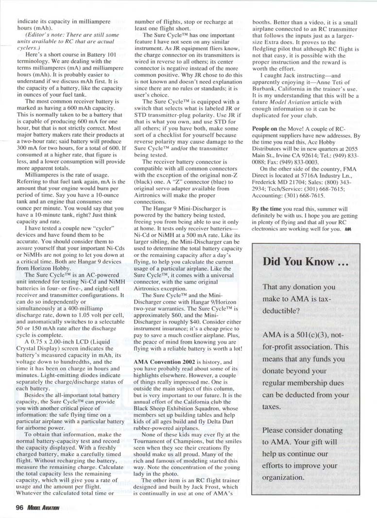 THE MAY 2002 column, in which I discuss what we may see—or should ask our suppliers for—in the next generation of Radio Control (RC) equipment has brought interesting input. David Kasdan of Cleveland, Ohio has strong thoughts about single-stick radios. He writes: "1 read your May 2002 Model Aviation column and yes, I have a suggestion for manufacturers and the RC community: Bring back single-stick, three-axis transmitters. None has been on the market for ten years or so, and 1 think we are all missing something. "The more common systems of having ailerons lateral on one stick and rudder on the other makes flight coordination difficult to learn and to execute. It turns this aspect of flying into the equivalent of piano or drum playing—one is forced to learn to disconnect limb functions. My own understanding of this as a modeler began when I took up full-scale flying later and had to learn pedal usage. "Single stick systems couple rudder and aileron in a much more natural way. They permit the flier's dominant hand to coordinate all flight controls. They are probably the best way to do this other than a rudder pedal system, which won't go over well with most modelers (too bad)! It would make switching between models and full-scale easier. "Single sticks provide a manually and visually obvious way of providing both coordinated turns and slipping maneuvers: Twist and move laterally the same direction for coordinated turns; the opposite direction of uncoordinated slips. This is much easier than SURE CYCLE CMAMIRATI The Hangar 9 Sure Cycle™, a full-featured Ni-Cd and NiMH battery cycler, is recommended as insurance that your important batteries are in good health. learning to move thumbs together or apart at different rates for the various maneuvers. "I will guess that the three-axis joystick is more expensive to manufacture than two double-axis ones and that they are not available as a commodity OEM [Original Equipment Manufacturer] part for the transmitter manufacturers. That may be what did them in commercially. "Let me know what you think." In my opinion, the prognosis is negative! But more important than my opinions are those of the manufacturers, At AMA Convention 2002, Jaqueline Walker builds, and will fly, a rubber-powered Delta Dart under the tutelage of California's Black Sheep Exhibition Squadron. The Mini-Discharger—a receiver-only battery-capacity tester—furnishes the same information as more-complex units. which at least some of the time are governed by those of the consumers. Even in the pioneer days of proportional RC, when every manufacturer offered a single-stick system, the sales were minimal. They were offered mostly as a courtesy because the companies were owned and operated by active modelers: the Bob Dunhams of Orbit Electronics, the Phil Krafts of Kraft Systems, etc. Those were my Orbit days; during a good single-stick year, our sales accounted for 1 or 2%. That is not enough to interest the big-business manufacturer RC-maker of today— companies operated by executives far removed from and with no personal experience in RC flying and looking only at the bottom (profit!) line. Except for the fact that the machines resemble each other, I see little similarity between RC and full-scale flight. The differences are so great that I don't see a need to go into them here. However, I appreciate David's reference to "full-scale" instead of the oft-used phrase "real airplanes." I don't own or fly any of those multi-thousand-dollar airplanes, but I roll my own; I have handled and am familiar with every piece that goes into them, and they may not carry people when they are done, but they are "real"! Another historical fact about singlestick transmitters is that even when they were readily available, in serious competition, the rich and famous almost all used two-stick radios. I can only think of one person—Joe Bridi— who made any sort of name for himself in competition with a single-stick transmitter. I think Chip Hyde flew the mode in his early days, but he has not done bad since switching to a two-sticker! I do agree with David about the difference between uncoordinated and coordinated turns, but uncoordinated turns arc common for RC flight, during which most of the turns are made with ailerons only. It is only when one flies a large high-winger that he can see well as it skids through the air that he learns about the need for rudder input—which he probably couples into the aileron stick anyway! It all has to do with many— probably most—fliers' inability to use their left hand. Since I am being disagreeable, I'll do so with the analogy about piano and drum playing. I am not really qualified to discuss such things as "limb functions," but I do know that most people who want to can learn to play pianos, drums, guitars, to "keyboard" as they now call typing in computer classes, and most tasks for which two hands are required. It being softball season, I am seeing a lot of left-handed action now. As a bit of community service, I do photography for a local high-school girls' softball team. No matter how much the coach jumps up and down and yells "two hands," they all catch with one—in most cases, the left one. Don't tell me a teen-age girl can learn to do something difficult left-handed and an adult male cannot. Last, I doubt if the cost of the three-axis gimbals has any bearing on the lack of such transmitters. They are available as OEM components for other than RC uses, but in most cases they are intended for commercial applications and cost more than we pay for an entire sport-class RC system. Our manufacturers use proprietary stick assemblies to which only the top knob would need to be added, though an entirely different case would have to be developed and expensive molds made. Mode One fliers such as Hanno Prettner, Quiquc Somcnzini, Dave Shadel, and myself won't even agree that Mode Two is a sensible way to fly, much less single-stick. We believe that if y