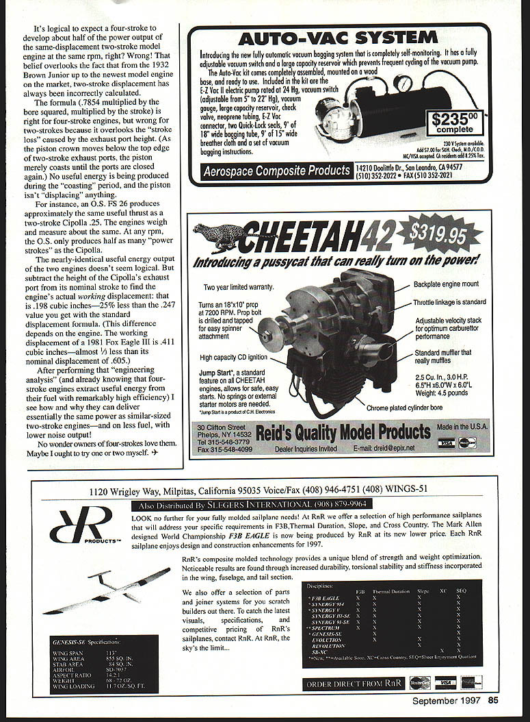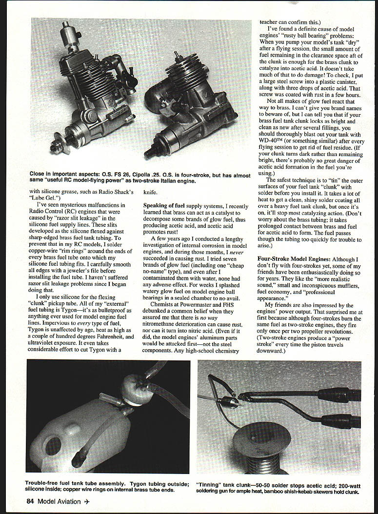 U Joe Wagner WZ7xL1X 4/7ip MY FIRST MODEL AVIATION column isnt out yet no reader response has come have ample engine topics second column anyway Some model engine columns feature detailed analysis performance tests new power plants troubleshooting older power plants dont plan use much either Ive seldom met model flier cared greatly about technical trivia such whether engines piston made sintered iron Meehanite although performance tests right own way engines same production batch can vary widely behavior output Troubleshooting Major malfunctions wear-outs crash damage should taken care professionals US model engine manufacturers know well-equipped repair products least decade two old official importers foreignmade engines Dr Diesel Indy Sales Sig Tower Hobbies etc generally provide same level careful economical service engines import US makers offer own merchandise independent model engine restorers Despite 60 years experience working playing model engines often turn encounter serious troubles such pistoncylinder assembly bad compression George Aldrich 12822 Tarrytown San Antonio TX 78233 has competently solved several tricky engine rebuilding problems Ive extremely happy Don Blackburns Box 15143 Amarillo TX 79118 work neither George nor Don can fix engine dont believe can repaired engine-running difficulties have simple causes problems within average modeler s ability find overcome Bad glow plugs clogged fuel orifices spraybars can happen anyone can corrected anyone major cause model engine malfunctions leaks air seeps its wanted compression leaks out Leakage can occur anyplace two engine components meet example whenever Cox engine becomes hard start runs erratically check its glow head tightness Glow heads often loosen vibration heat cycling quick fix Cox glow head unscrews repeatedly running flatten its threads two places Vise-GripTM pliersjust enough make head force fit its cylinder Sometimes leaks cause insidious toughto-detect problems throttle diesels almost drove mad trying find made rpm go up farther closed past midrange culprit air leaking around carburetors retaining setscrews Gasketed joints another place leakage usual cause loosened assembly screws Heres good place expel another erroneous belief its best snug down screws newly-run-in engine its hot opposite true ensure maximum clamping power put engine freezer wait hour two tighten its screws Practically model engine cases heads made aluminum alloy screws steel heated aluminum expands about twice much steel youll get better sealing engines gasketed joints tighten screws everythings ice cold hotter aluminum parts get after harder screws will clamp together Another myth warns never reuse old gasket its intact will still seal well ever properly reinstalled gasket will seal better dip castor oil before reassembly paper-type gasket becomes damaged has replaced cant obtain new hobby dealer can make own much trouble material use reply cards magazines cutting replacement gasket carefully #11 X-Acto modified drafting compass Pesky air leaks can occur around needle valve spraybars Control Line Stunt contest saw balky Fox 35 tamed quickly owner loosened retaining nut spraybar wound couple turns oil-soaked string around either side venturi retightened nut Fox looked odd half-inch loose string hanging ends its needle valve assembly ran perfectly wouldnt think enough air could creep through tiny crevice upset engines operation happens often modelers realize Did know engines intake prefers about 170 1 pull air instead fuel can keep happening around needle itself coating well Thanks Don Blackburn OS 25formerly worn out crash- D-l-Y gasket making doesnt require much sharpened music wire damagedis good-looking potent reliable performer again compasses circle-cutting stamp pad reply cards September 1997 83 silicone grease such Radio Shacks Lube Gel Ive seen mysterious malfunctions Radio Control RC engines caused razor slit leakage silicone fuel supply lines slits developed silicone flexed against sharp-edged brass fuel tank tubing prevent RC models solder copper-wire rim rings around ends brass fuel tube onto silicone fuel tubing fits carefully smooth edges ajewelers file before installing fuel tube havent suffered razor slit leakage problems since began doing use silicone flexing clunk pickup tube external fuel tubing Tygonits bulletproof anything ever used model engine fuel lines Impervious type fuel Tygon unaffected age heat high couple hundred degrees Fahrenheit ultraviolet exposure takes considerable effort cut Tygon knife Speaking fuel supply systems recently learned brass can act catalyst decompose some brands glow fuel thus producing acetic acid acetic acid promotes rust few years ago conducted lengthy investigation internal corrosion model engines during months never succeeded causing rust tried seven brands glow fuel including cheap no-name type after contaminated water adverse effect weeks splashed watery glow fuel model engine ball bearings sealed chamber no avail Chemists Powermaster FHS debunked common belief assured no way nitromethane deterioration can cause rust nor can turn nitric acid did model engines aluminum parts would attacked firstnot steel components Any high-school chemistry teacher can confirm Ive found definite cause model engines rusty ball bearing problems pump models tank dry after flying session small amount fuel remaining clearance space aft clunk enough brass clunk catalyze acetic acid doesnt take much damage check put large steel screw plastic canister along three drops acetic acid screw coated rust few hours makes glow fuel react way brass cant give brand names beware can tell brass fuel tank clunk looks bright clean new after several fillings should thoroughly blast out tank WD4OTM something similar after flying session get rid fuel residue clunk turns dark rather remaining bright theres probably no great danger acetic acid formation fuel youre using safest technique tin outer surfaces fuel tank clunk sold
