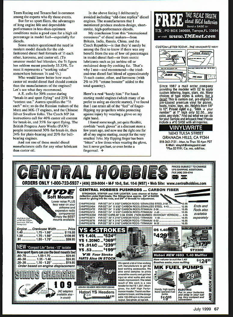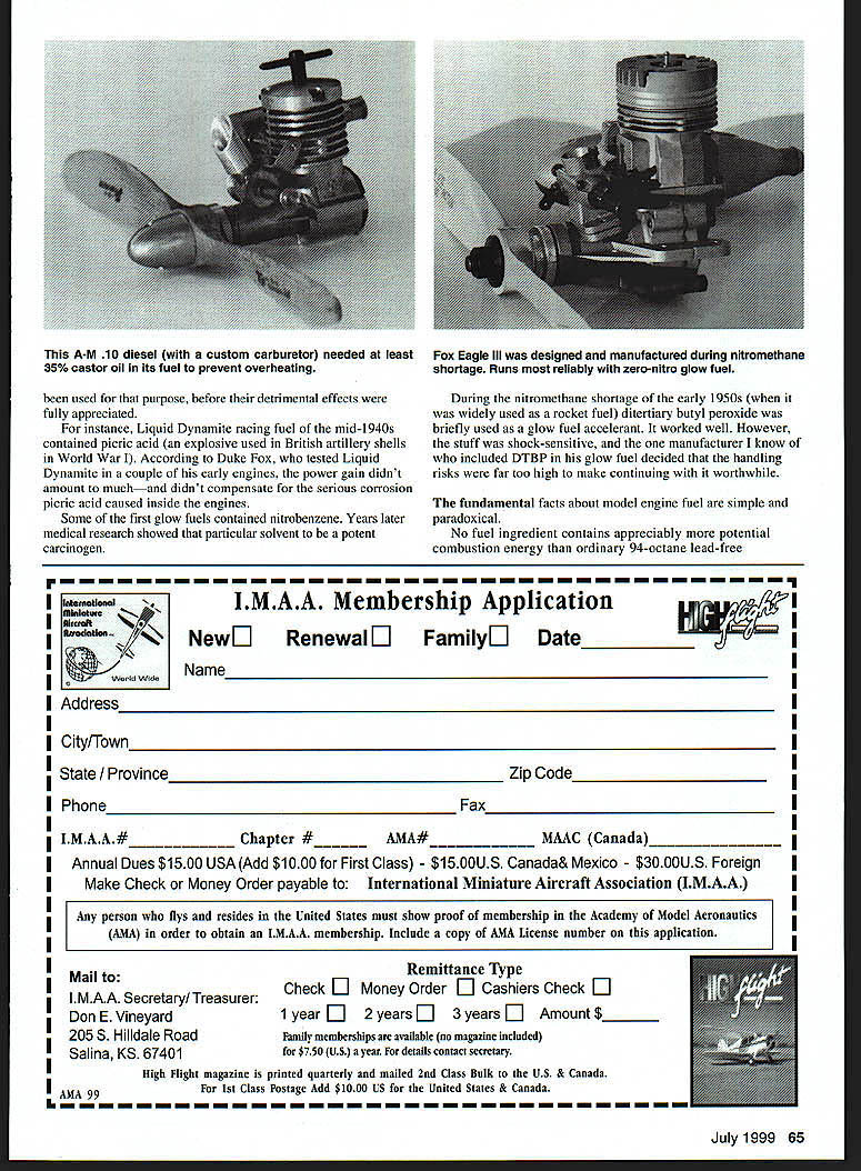 U Joe Wagner ffZ7x~ 0 ODEL AIRPLANE ENGINES have use almost seven decades discussions about throughout time topic recurs fuel Despite technical advances made since 1930s still seems just much misunderstanding ever about model engine fuel Raymond Yatess 1942 book Model Gasoline Engines filled two pages warning readers against practice souping up model fuel adding benzol acetone other secret ingredients Since model magazine articles have repeatedly issued similar cautions Yet theres never end burning ambition among modelers discover some new amazingly potent fuel mixture engines About year ago model flier Michigan began promoting new miracle model fuel ingredient made reclaimed deepfryer oil mail last month came suggestion reader column turpentine might excellent additive model fuel still recall racing fuel recipe developed fellow model club members circa 1947 After considerable experimentation came up ultimate brew consisting 25% castor oil wood alcohol shellac thinner methanol Nobody could convince fellow last three ingredients identical goal course power belief some modelers hold somewhere somehow theres magic chemicalmaybe quite common such turpentine acetonethat will unleash incredible extra power model engines Another belief miracle ingredient something companies manufacture model fuel have too unimaginative have tried fact model fuel makers imaginative anyone practically everything way inflammable substance has least considered model fuel ingredient Some have July1999 63 Argentinian DH 45 true ABC engine twin ball bearings performs best fuel 5% nitromethane lubricant old-time spark-ignition gasoline-burners SAE 70 oil easily potent Irvine 40 designed no-nitro FAI fuel starts readily throttles nicely found airports gas stations delivers dependable performance weather used purpose before detrimental effects ng nitromethane shortage early 1 950s fully appreciatedwas widely used rocket fuel ditertiary butyl peroxide instance Liquid Dynamite racing fuel mid-1940sbriefly used glow fuel accelerant worked well However contained picric acid explosive used British artillery shellsthe stuff shock-sensitive manufacturer know World War According Duke Fox tested Liquidwho included DTBP glow fuel decided handling Dynamite couple early engines power gain didntrisks far too high make continuing worthwhile amount muchand didnt compensate serious corrosion picric acid caused inside enginesThe fundamental facts about model engine fuel simple Some first glow fuels contained nitrobenzene Years laterparadoxical medical research showed particular solvent potent uel ingredient contains appreciably potential carcinogencombustion energy ordinary 94-octane lead-free El IMAA Membership Application ~ IZ Renewal LI FamiIyIIZ Date_________ IName I AddressI II City/TownI State/ Province_________________ Zip Code__________I II Phone__________________________________________ Fax___________________________________ I Chapter #_ AMA#___ MAAC CanadaI Annual Dues $1500 USA Add $1000 First Class $1500US Canada& Mexico $30OOUS Foreign IMake Check Money Order payable International Miniature Aircraft Association IMAAI I Any person flys resides United States must show proof membership Academy Model Aeronautics AMA order obtain IMAA membership Include copy AMA License number application Mail to Remittance Type IMAA Secretary/Treasurer Check D Money Order D Cashiers Check D Don E Vineyard1 year D 2 years D 3 years D Amount$______ 205 S HilIdale Road Family memberships available no magazine included Salina KS 67401 for $750 US year details contact secretary High Flight magazine printed quarterly mailed 2nd Class Bulk US & Canada AMA 99For 1st Class Postage Add $10 00 US United States & Canada July1999 65 A-M 10 diesel custom carburetor needed least Fox Eagle Ill designed manufactured during nitromethane 35% castor oil its fuel prevent overheating shortage Runs reliably zero-nitro glow fuel automotive gasoline Yet theres no practicable way harnessing fraction potential energy content engine fueleven methanol low scorer far heat energy content per pound comparisons According Van Nostrands Scientific Encyclopedia during complete combustion gasoline produces net energy output approximately 20000 BTU per pound Kerosenes about same Methanols rated 9000 BTU/pound ethyl alcohol does much better 12000 BTU methanol most-common ingredient model engine fuel has less half energy content gasoline Part answer amount air required complete combustion put term quotation marks because its engineering impossibility achievable laboratory Petroleum-based fuels such gasoline kerosene need 15 16 grams air complete oxidization gram fuel Ethyl alcohol needs nine grams airbut methanol requires mere 61/2 grams gram air standard atmospheric conditions roughly 50 cubic inches Remember though figures just given complete combustion doesnt occur engines very far ideal conditions model power plants operate demonstrated paradoxical fact maximum power output alcohol-fueled model engines require much larger air intakes gasoline- kerosene-burners Its still imperfectly understood exactly what goes combustion chambers model engines However few basic points well-established does no good release energy combustion chamber faster piston movement can accept Doing can cause damage such blown head gaskets burst glow plug seals broken pistons Thats high-nitro fuel provides little benefit engines run modest rpm advantage nitromethane engine fuel its exceedingly rapid combustion rate Thats vital 20000 rpm maximum available combustion period less millisecond sport-type model flying RC engines spend running time part-throttle dependable performance calls relatively mild slow-burning fuel Another much-misunderstood aspect model engine fuel its oil content points mentioned previous column deserves further explanation function oil coolant Canadian reader Ian McQueen objected heat produced during combustion goes out exhaust power stroke complete can oil fuel possibly carry away excess