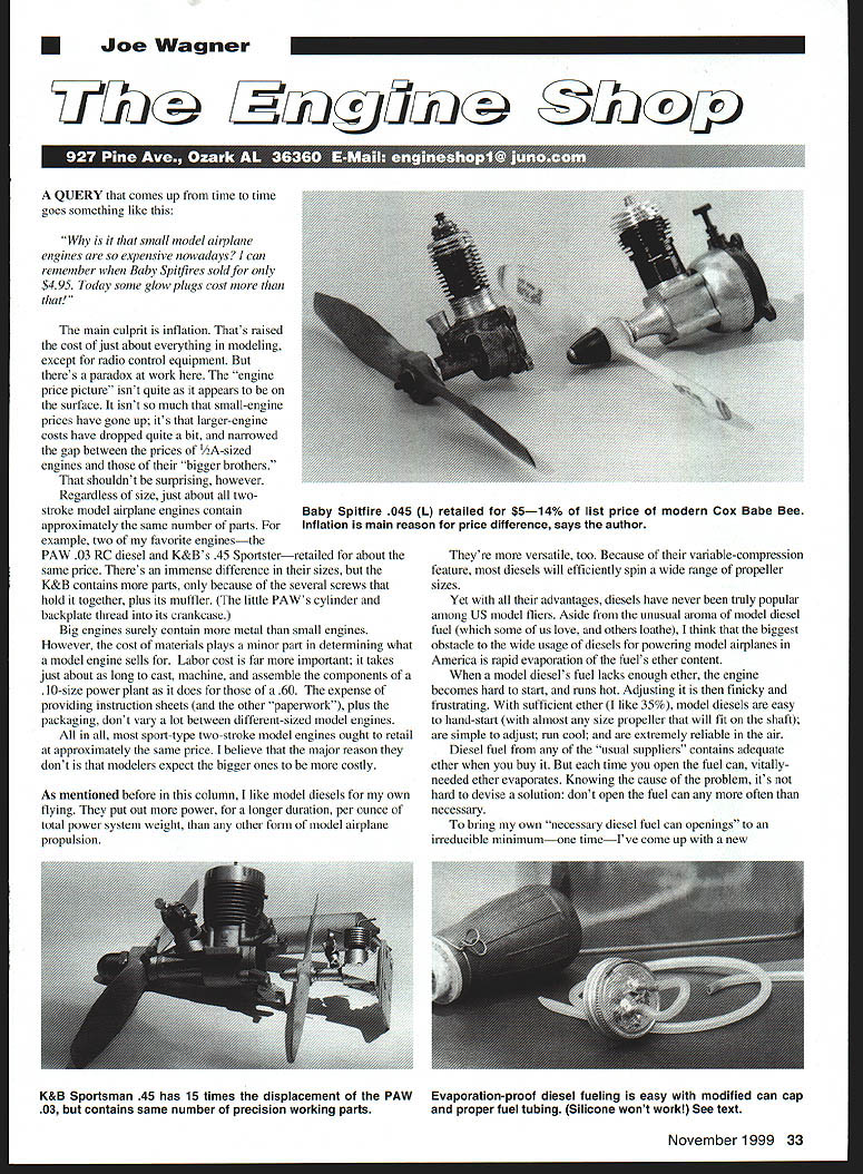 U Joe Wagner 77*7ii LIJJ7L1X fxp Vfl JIrUr- S J14 '1 1 I6 1 I 1Kk1 T1 b QUERY comes up time time goes something like small model airplane engines expensive nowadays can remember Baby Spitfires sold $495 Today some glow plugs cost main culprit inflation Thats raised cost just about everything modeling except radio control equipment theres paradox work engine price picture isnt quite appears surface isnt much small-engine prices have gone up its larger-engine costs have dropped quite bit narrowed gap between prices /2A-sized engines bigger brothers shouldnt surprising however Regardless size just about twostroke model airplane engines contain approximately same number parts example two favorite enginesthe PAW 03 RC diesel K&Bs 45 Sportsterretailed about same price Theres immense difference sizes K&B contains pans because several screws hold together plus its muffler little PAWs cylinder backplate thread its crankcase Big engines surely contain metal small engines However cost materials plays minor part determining what model engine sells Labor cost far important takes just about long cast machine assemble components 10-size power plant does 60 expense providing instruction sheets other paperwork plus packaging dont vary lot between different-sized model engines sport-type two-stroke model engines ought retail approximately same price believe major reason dont modelers expect bigger ones costly As mentioned before column like model diesels own flying put out power longer duration per ounce total power system weight other form model airplane propulsion Theyre versatile too Because variable-compression feature diesels will efficiently spin wide range propeller sizes Yet advantages diesels have never truly popular among US model fliers Aside unusual aroma model diesel fuel some us love others loathe think biggest obstacle wide usage diesels powering model airplanes America rapid evaporation fuels ether content model diesels fuel lacks enough ether engine becomes hard start runs hot Adjusting finicky frustrating sufficient ether like 35% model diesels easy hand-start almost size propeller will fit shaft simple adjust run cool extremely reliable air Diesel fuel usual suppliers contains adequate ether buy time open fuel can vitallyneeded ether evaporates Knowing cause problem its hard devise solution dont open fuel can often necessary bring own necessary diesel fuel can openings irreducible minimumone timeIve come up new November1999 33 Baby Spitfire 045 1 retailed $514% list price modern Cox Babe Bee Inflation main reason price difference says author K&B Sportsman 45 has 15 times displacement PAW Evaporation-proof diesel fueling easy modified can cap 03 contains same number precision working parts proper fuel tubing Silicone wont work See text procedure keeps fuel can sealed up time fueling way ether gets no chance evaporate Heres Remove cap comes can dont disturb metal inner seal pouring spout leave thin gasket inside cap Punch two I32 holes through cap its gasket working alternately top bottom surfaces disturb flatness cap Make holes about 1/2 inch apart center area cap Solder one-inch approximate length I32 K&S brass tubing hole tubes should extend upward unequally can tell glance outflow make sure solder joints will strong enough withstand years handling reinforce drilling out 8-32 brass hex nut #22 drill bit 157 tin everything 60-40 solder solder together nuts top side cap Using large-size /8 ID gasoline-resistant fuel tubing such Du-Bros Tygon Hayes neoprene Prathers Super Gas Line push length long enough reach bottom corner fuel can onto inner end brass tubes Dont use silicone fuel tubing Diesel fuel makes swell up twice its original diameter can replace cap gasket suitable-size automotive 0-ring wrap turn two plumbers Teflon tape around spout threads help close off possible vapor leakage pathway Now remove can spouts inner seal disk install new cap assembly outside cap sealing provided short length fuel tubing form U connection brass tube other Two further items needed another length plastic tubing supply fuel engine tank rubber squeeze bulb Trexier Airwheel inflator fueling pull end U tubing connection off external end pickup tube replace separate fuel-delivery tubing Air pressure applied squeeze bulb open end U tube will force fuel out can models tank models tank full pull bulb free open U tube cans internal pressure will rapidly dissipate U tubing can put back between two brass tubes can top way start Using method just about eliminates ether loss evaporation fly small-sized diesel engine-powered models might worth extra trouble construct two antievaporation systems fit gallon can because model diesel fuel supplied way other pint- quart-sized can such empty paint-thinner container way can refill small can large whenever required removing cap either theres no need lug whole six-pound can diesel fuel along youre going 34 Model Aviation ly removable legs make engine test stand conveniently transportable Construction details text TRU-TURN now fers very finest versatile light weight PROP HUBS turned solid barstock inside out true running hub new hub will moun motor standard TRU-TURN adapter kit big bird multi-bolt applications TRU-TURN has covered U$TM PMade n U 5 TRU-TURN also has PROP NUT will fit motor precision PROP NUTS come engine thread sizes two different shapes available stock Ask hobby dealer name PRECISION MODEL PRODUCTS fl Romco Manufacturing Inc QUALITY VERSATILITY T LOOKS TY PO Box 836 South Houston Texas 77587 713 / 943-1867 Visit us internet tru-turnnet local ballfield fly 06-powered airplane feel its always better break new model engine test stand rather airplane test stand gives easy access everything since new engine out open receives maximum cooling just needs However quite few fliers avoid model engine test stands claiming theyre inconvenient use bolt workbench break engines indoors oil gets over place room fills fumes s way too much racket doing job outside just bad ca