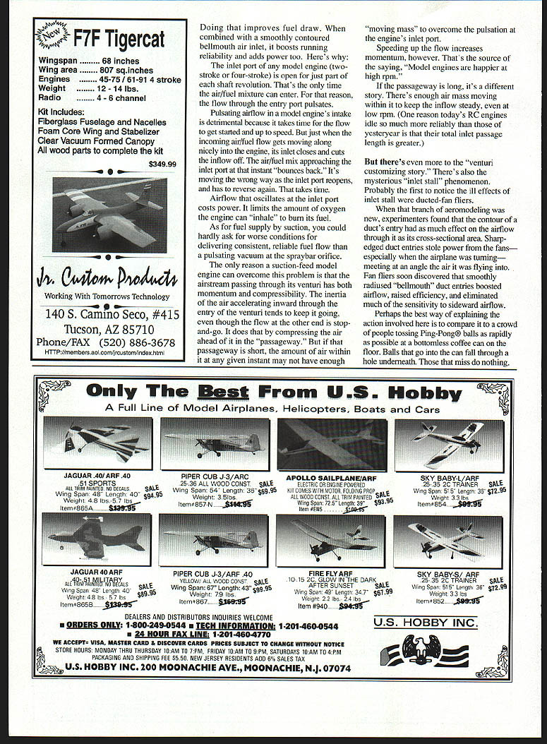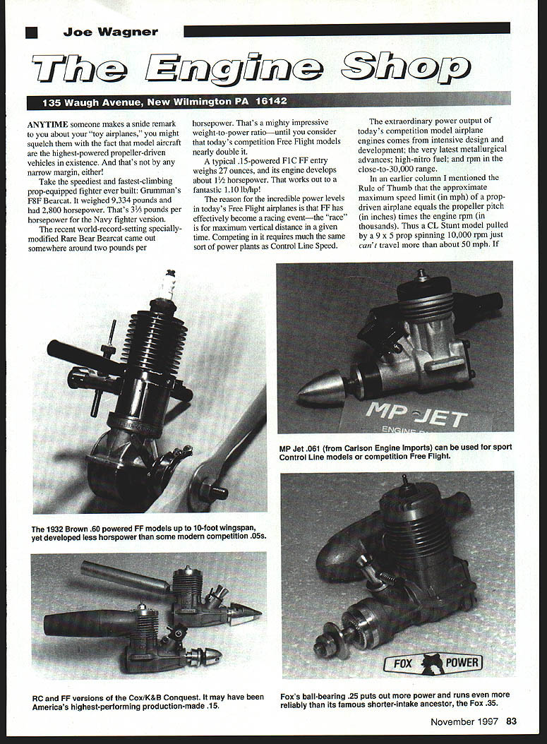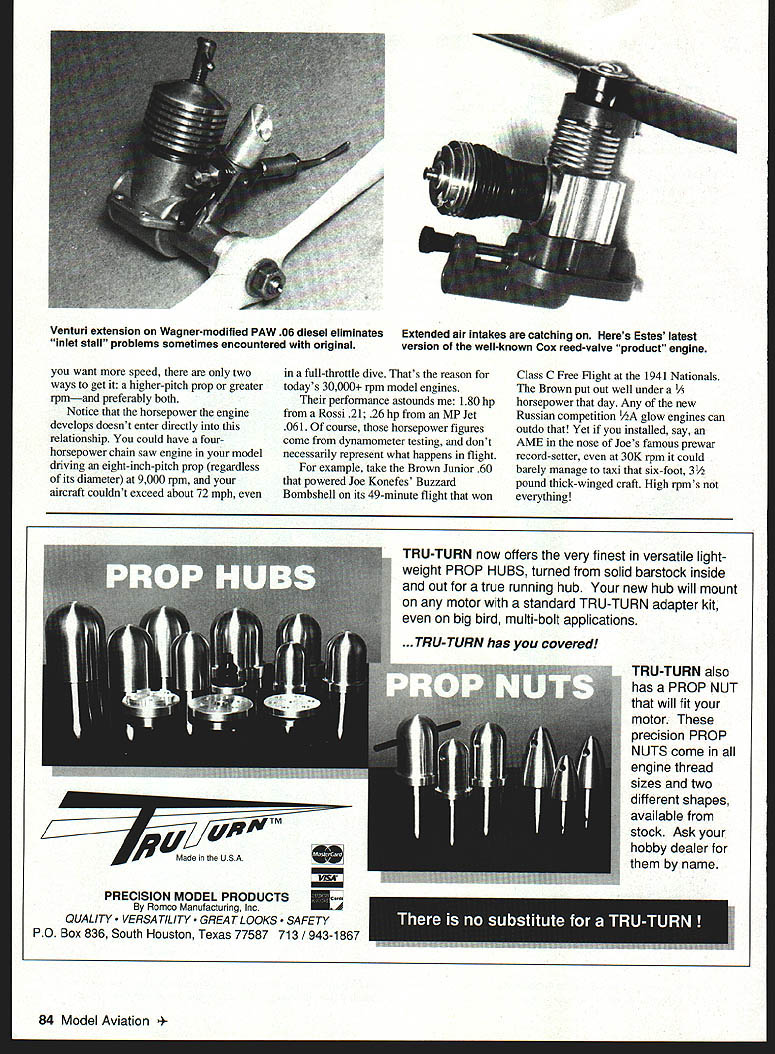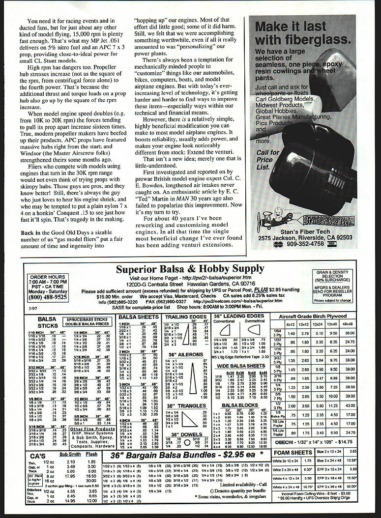 U Joe Wagner ANYTIME someone makes snide remark about toy airplanes might squelch fact model aircraft highest-powered propeller-driven vehicles existence thats narrow margin either Take speediest fastest-climbing prop-equipped fighter ever built Grummans F8F Bearcat weighed 9334 pounds 2800 horsepower Thats 31/3 pounds per horsepower Navy fighter version recent world-record-setting speciallymodified Rare Bear Bearcat came out somewhere around two pounds per horsepower Thats mighty impressive weight-to-power ratiountil consider todays competition Free Flight models nearly double typical 15-powered FlC FF entry weighs 27 ounces its engine develops about 11/2 horsepower works out fantastic 110 lb/hp reason incredible power levels todays Free Flight airplanes FF has effectively become racing eventthe race~ maximum vertical distance given time Competing requires much same sort power plants Control Line Speed extraordinary power output todays competition model airplane engines comes intensive design development very latest metallurgical advances high-nitro fuel rpm close-to-30OOO range earlier column mentioned Rule Thumb approximate maximum speed limit mph propdriven airplane equals propeller pitch inches times engine rpm thousands Thus CL Stunt model pulled 9 x 5 prop spinning 10000 rpm just cant travel about 50mph November 1997 83 MP Jet 061 Carison Engine Imports can used sport Control Line models competition Free Flight 1932 Brown 60 powered FF models up 10-foot wingspan yet developed less horspower some modern competition 05s RC FF versions Cox/K&B Conquest may have Americas highest-performing production-made 15 Foxs ball-bearing 25 puts out power runs reliably its famous shorter-intake ancestor Fox 35 want speed two ways get higher-pitch prop greater rpmand preferably both Notice horsepower engine develops doesnt enter directly relationship could have fourhorsepower chain saw engine model driving eight-inch-pitch prop regardless its diameter 9000 rpm aircraft couldnt exceed about 72 mph full-throttle dive Thats reason todays 30000 rpm model engines performance astounds 180 hp Rossi 21 26 hp MP Jet 061 course horsepower figures come dynamometer testing dont necessarily represent what happens flight example take Brown Junior 60 powered Joe Konefes Buzzard Bombshell its 49-minute flight won Class C Free Flight 1941 Nationals Brown put out well under 1/5 horsepower day Any new Russian competition /IA glow engines can outdo Yet installed say AME nose Joes famous prewar record-setter 30K rpm could barely manage taxi six-foot 31/2 pound thick-winged craft High rpms everything 84 Model Aviation uri extension Wagner-modified PAW 06 diesel eliminates Extended air intakes catching Heres Estes latest inlet stall problems sometimes encountered original version well-known Cox reed-valve product engine TRU-TURN now offers very finest versatile light weight PROP HUBS turned solid barstock inside out true running hub new hub will mount motor standard TRU-TURN adapter kit big bird multi-bolt applications TRU-TURN has covered n U S TRU-TURN also has PROP NUT will fit motor precision PROP NUTS come engine thread sizes two different shapes available stock Ask hobby dealer name z PRECISION MODEL PRODUCTS Romco Manufactu ng ncEli QUALITY VERSATILITY GREAT LOOKS SAFETY PO Box 836 South Houston Texas 77587 713 / 943 1867 need racing events ducted fans just about other kind model flying 15000 rpm plenty fast enough Thats what MP Jet 061 delivers 5% nitro fuel APC 7 x 3 prop providing close-to-ideal power small CL Stunt models High rpm has dangers too Propeller hub stresses increase square rpm centrifugal force alone fourth power Thats because additional thrust torque loads prop hub also go up square rpm increase model engine speed doubles eg 10K 20K rpm forces tending pull its prop apart increase sixteen times True modem propeller makers have beefed up products APC props have featured massive hubs right start Windsor Master Airscrew folks strengthened some months ago Fliers compete models using engines turn 30K rpm range would think trying props skimpy hubs guys pros know better Still theres always guy just loves hear engine shriek may tempted put plain nylon 7 x 4 honkin Conquest 15 see just fast itll spin Thats tragedy making Back Good Old Days sizable number us gas model fliers put fair amount time ingenuity hopping up engines Most effort did little good some did harm Still felt accomplishing something worthwhile really amounted personalizing power plants Theres always temptation mechanically minded people customize things like automobiles bikes computers boats model airplane engines todays everincreasing level technology its getting harder harder find ways improve itemsespecially ways within technical financial means However relatively simple highly beneficial modification can make model airplane engines boosts reliability usually adds power makes engine look noticeably different stock Extend venturi isnt new idea merely little-understood First investigated reported prewar British model engine expert Col C E Bowden lengthened air intakes never caught An enthusiastic article E C Ted Martin MAN 30 years ago also failed popularize improvement Now its turn try about 40 years Ive reworking customizing model engines time single beneficial change Ive ever found has adding venturi extensions Superior Balsa & Hobby SupplyGN & ORDER HOURS it Home Paget http//pw2/-balsalsupenorhtm ECTION 700 AM 700 020-G Centralia Street Hawaiian Gardens CA 9071650% SURCHARGE PST CA TIME FGRS & DEALERS Monday SaturdayPlease add sufficient amount excess refunded shipping UPS Parcel Post PLUS $285 handlingEND FOR RESELLER 800 488-9525 500 Mm order accept Visa Mastercard Checks CA sales add 825% sales tax GRAM Info 582865-3220 FAX 562860-0327 http//pw2lnetcomcom/balsalSuperiOrhtnlPilces sitect chn 3/97 E complete price list Shop hours 800AM 300PM Mon Fri BALSAspucrnss STICKSBALSA SHEETS TRAILING EDGES 36 LEADING EDGESAircraft Grade Birch y