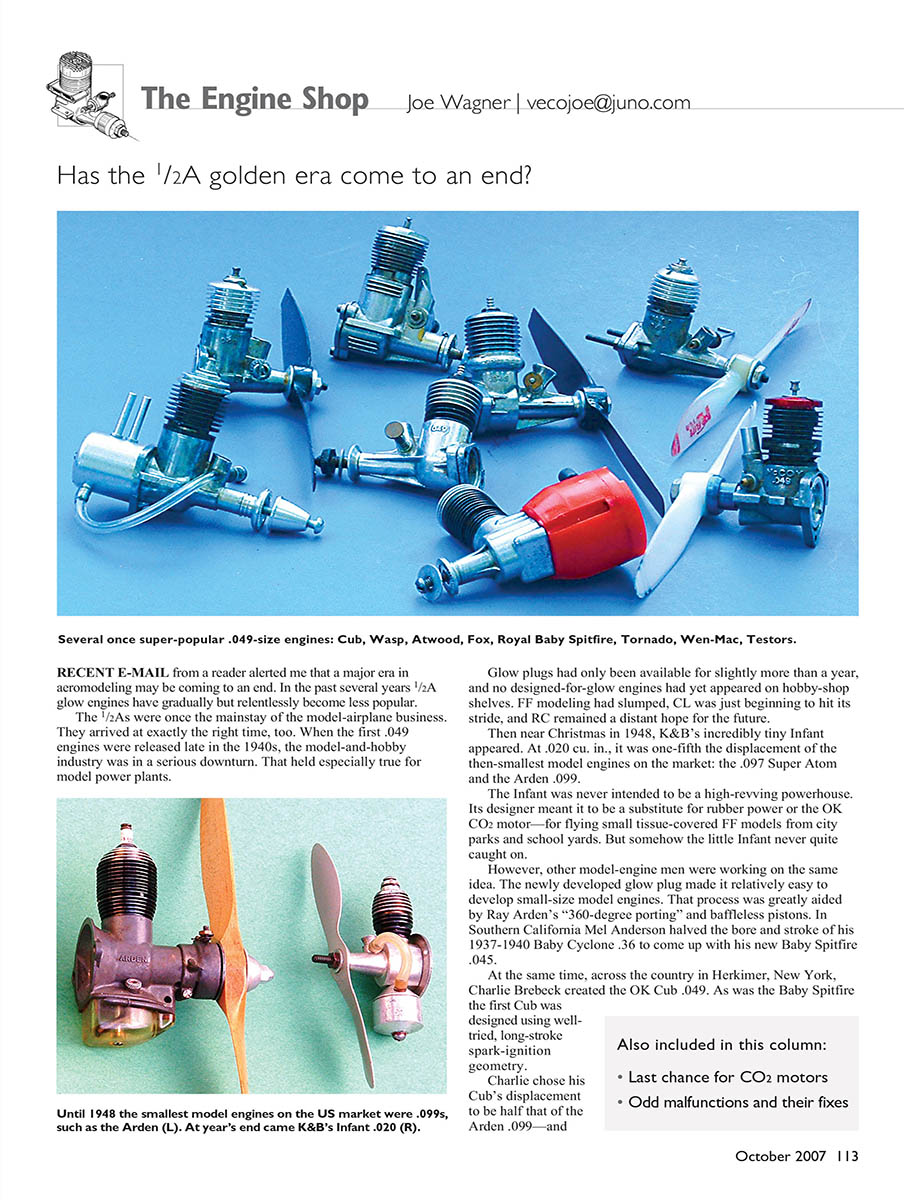 Several once super-popular .049-size engines: Cub, Wasp, Atwood, Fox, Royal Baby Spitfire, Tornado, Wen-Mac, Testors.