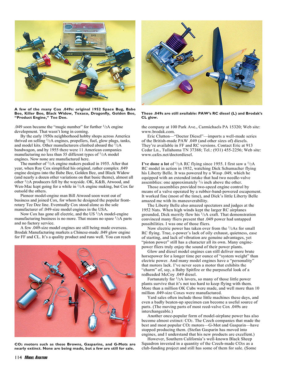 These .049s are still available: PAW’s RC diesel (L) and Brodak’s