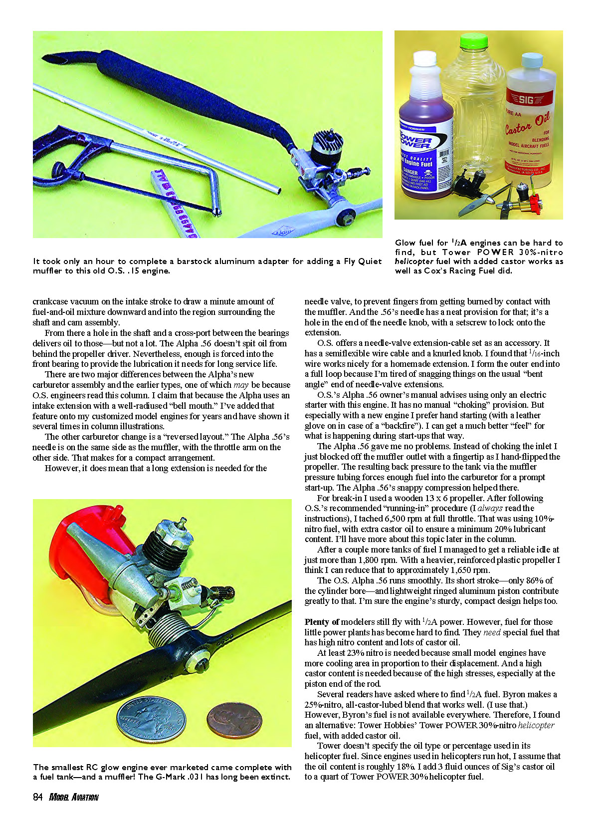 The O.S. Alpha .56 runs smoothly. Its short stroke—only 86% of