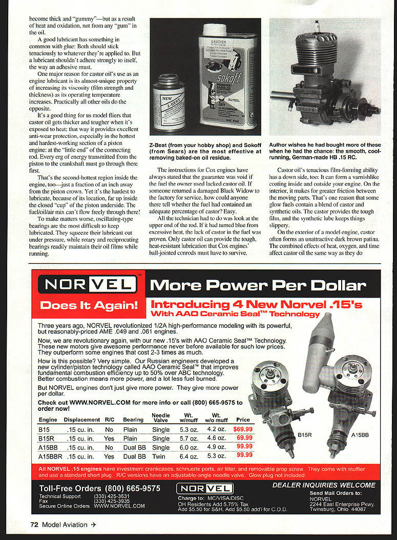 U J00 Wagner KI.U'I-1 Er WI-1 11 [--J1'I liii BY THIS TIMEhalf year after first Engine Shop column appeared MAIve received nearly 100 letters readers Most questions wrote personal reply Please enclose SASE send query needs answer dozen readers asked about model fuels lubrication rust protection after-run oils Because misunderstandings seem common area model engine operation Ill explain some wet aspects model airplane engines thoroughly can oil model fuel does lot inside engines just keeping moving parts slippery forms barrier film over everything prevent corrosion wear proper lubrication metal parts will never touch film keeps separated its own thickness thickness greater maximum surface imperfections no machined surface perfectly smooth theres no way metal-to-metal wear can occur Remember point second vital function model engine lubricants cooling youve ever seen steel being machined production youll remember flood cutting oil gushed over part being shaped keeps temperature part its cutting tool uniform ensuring dimensional stability long tool life oily discharge muffler engine does similar job cooling fins outside engine conduct excess heat away inner surfaces cylinder surplus oil fuelglow diesel sparkcarries away much waste heat energy generated combustion process long trouble-free model engine life except ABC engines cool running essential Particularly high-revving competition engines lubricant-castor oildoes another very special job Castor oil does what water injection does highpowered full-scale engines helps prevent detonation normal operation fuel/oil/air mixture internal combustion engines cylinder ignites burns smoothly progressively doing delivers relatively uniform pressure descending piston maximizes efficiency minimizes stress Detonation almost instantaneous energy release generates shock waves uneven pressures hot spots within engines combustion chamber Its grossly inefficient because releases fuels energy faster piston can move response Thats reason blown holes piston crowns Consider difference between nitroglycerin dynamite Nitroglycerin ultrasensitive difficult-to-control explosive thats rarely used anymore Dynamite long standard quarrying mining tunnel boring because its reliable predictable performance merely nitroglycerin absorbed inert filler materialusually diatomaceous earth acts moderator slows smooths out terms really can apply what happens explosion release energy Castor oil performs same function model engines tiny droplets oil suspended combustible mixture top cylinder burn instead like diatomaceous earth dynamite act shock absorbers during millisecondlong explosions provide power impulses spin model engines crankshafts Castor oil much-misunderstood underrated substance Take advertising term degummed castor oil Thats like offering decaffeinated bananas Gum comes treesnot beans Castor oil does 70 Model Aviation t Racing 60s 1946 Hornet first model engine specify castor oil exclusively lubrication Castor oil miracle lubricant Sigs product medicinal castor oil Spot lubrication teflon-loaded Tetra Gun oil brought gains 600 850 rpm works well costs old-time Control Line Stunt engines become thick gummybut result heat oxidation gum oil good lubricant has something common glue Both should stick tenaciously whatever theyre applied lubricant shouldnt adhere strongly itself way adhesive must major reason castor oils use engine lubricant its almost-unique property increasing its viscosity film strength thickness its operating temperature increases Practically other oils opposite Its good thing us model fliers castor oil gets thicker tougher its exposed heat way provides excellent anti-wear protection especially hottest hardest-working section piston engine little end connecting rod erg energy transmitted piston crankshaft must go through first Thats second-hottest region inside engine toojust fraction inch away piston crown Yet its hardest lubricate because its location far up inside closed cup piston underside fuel/oil/air mix cant flow freely through make matters worse oscillating-type bearings difficult keep lubricated squeeze lubricant out under pressure rotary reciprocating bearings readily maintain oil films running instructions Cox engines have always stated guarantee void fuel owner used lacked castor oil someone returned damaged Black Widow factory service could anyone tell whether fuel contained adequate percentage castor Easy technician look upper end rod turned blue excessive heat lack castor fuel proven Only castor oil can provide tough heat-resistant lubrication Cox engines ball-jointed conrods must have survive Castor oils tenacious film-forming ability has down side too can form varnishlike coating inside outside engine interior makes greater friction between moving parts Thats reason some glow fuels contain blend castor synthetic oils castor provides tough film synthetic lube keeps things slippery exterior model engine castor often forms unattractive dark brown patina combined effects heat oxygen time affect castor oil same way Three years ago NORVEL revolutionized 1/2A high-performance modeling its powerful reasonably-priced AME 049 061 engines Now revolutionary again new 15s AAO Ceramic SeaITM Technology new motors give awesome performance never before available such low prices outperform some engines cost 2-3 times much possible Very simple Russian engineers developed new cylinder/piston technology called AAO Ceramic Seal improves fundamental combustion efficiency up 50% over ABC technology Better combustion means power lot less fuel burned NORVEL engines dont just give power give power per dollar Check out WWWNORVELCOM info call 800 665-9575 order now Engine Displacement R/C Bearing Needle Valve B15 l5cuin No Plain Bi SR lScuinYes Plain wtwt w/muff wlo muff Price Single53 oz 42 oz$6999 Single57 oz 46 oz6999 A15BB 15 cu inNoDual BB Sin9le60 oz 49 oz9999 A15BBR 15 cu inYesDual BB Twin64 oz 53 oz9999 72 Model Aviation st hobby shop Sokoff Author wishes