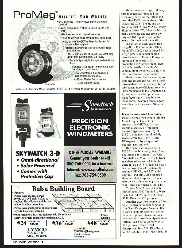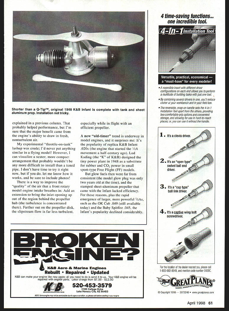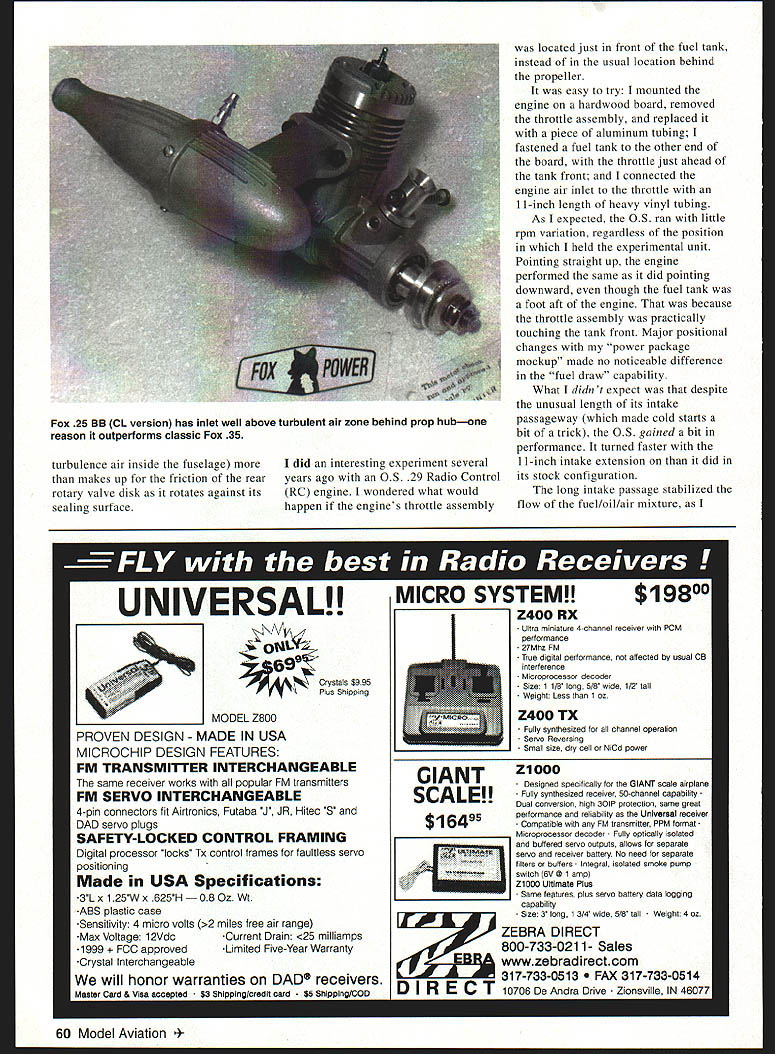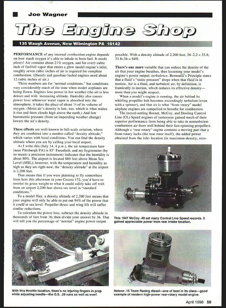U Joe Wagner CUA t 15 PERFORMANCE internal combustion engine depends much oxygen its able inhale burn fuel needs plenty Air contains about 21% oxygen cubic inch fuel/oil vapor enters glow model engines inlet roughly seven cubic inches air required complete combustion Diesels gasoline-fueled engines need about 12 cubic inches air numbers normal conditions hut conditions vary considerably much time model airplanes being flown Engines lose power hot weather air less dense increasing altitude Humidity also causes power loss whenever water vapor absorbed atmosphere takes place about 1/5 its volume oxygen Moist airs density low too what makes rise form clouds high above earth low barometric pressure impending weather change lowers airs density effects well-known full-scale aviation combined number called density altitude varies local conditions can find density altitude calling local airport As write July 14 4 pm air temperature near Pittsburgh PA 830 Farenheit hygrometer no means precision instrument indicates humidity about 80% airport located 860 feet above Mean Sea Level MSL however temperature humidity high right now density altitude airport 2200 feet means planning fly somewhere afternoon Cessna 172 youd have restrict its gross weight what could safely take off airport 2200 feet above sea level standard conditions model flier density altitude 2200 feet means engine will able put out 94% power could sea level Propeller thrust wing lift will suffer similar reductions calculate power loss subtract density altitude thousands feet 36 divide answer 36 will tell percentage normal engine power output possible density altitude 2200 feet 3622 338 33836 Theres variable can reduce density air engine breathes thus lessening models engines power output turbulence Bernoullis Principle states fluids static pressure drops fluid motion Air fluid turbulent air definition frantically motion reduces its effective density might suspect models engine running air behind its whirling propeller hub becomes exceedingly turbulent spinner air what front rotary model airplane engines compelled breathe combustion record-setting Hornet McCoy Dooling Control Line CL Speed engines yesteryear gained much superior performance being able take nonturbulent combustion air well behind fast-spinning propellers Although rear rotary engine contains moving part front rotary lacks rear rotor itself added power obtained inlet location maximum-density zeroApril 1998 59 1947 McCoy 49 set Control Line Speed records gained appreciable power rear intake location throttle location theres no injuring fingers prop adjusting needlethe OS 29 runs well ever Nelson 15 Team Racing dieselone best its classgood example modern high-power rear-rotary model engine turbulence air inside fuselage makes up friction rear rotary valve disk rotates against its sealing surface did interesting experiment several years ago OS 29 Radio Control RC engine wondered what would happen engines throttle assembly located just front fuel tank instead usual location behind propeller easy try mounted engine hardwood board removed throttle assembly replaced piece aluminum tubing fastened fuel tank other end board throttle just ahead tank front connected engine air inlet throttle 11-inch length heavy vinyl tubing As expected 05 ran little rpm variation regardless position held experimental unit Pointing straight up engine performed same did pointing downward though fuel tank foot aft engine because throttle assembly practically touching tank front Major positional changes power package mockup made no noticeable difference fuel draw capability What didnt expect despite unusual length its intake passageway made cold starts bit trick 05 gained bit performance turned faster 11-inch intake extension did its stock configuration long intake passage stabilized flow fuel/oil/air mixture ~Tawi -u mri NTiNiif rA UNIVERSAL! crystals $9 95 us Shipping MODEL Z800 PROVEN DESIGN MADE IN USA MICROCHIP DESIGN FEATURES FM TRANSMItTER INTERCHANGEABLE same receiver works popular FM transmitters FM SERVO INTERCHANGEABLE 4-pin connectors fit Atrtronics Futaba J JR Hitec 5 DAD servo plugs SAFETY-LOCKED CONTROL FRAMING Digital processor locks Tx control frames faultless servo positioning Made USA Specifications 3 L x 1 25 W x 625H 0 8 Oz WI ABS plastic case Sensitivity 4 micro volts 2 miles free air range Max Voltage l2VdcCurrent Drain 25 milliamps 1999 approvedLimited Five-Year Warranty Crystal Interchangeable will honor warranties DAD receivers Master Card & Visa accepted $3 Shipping/credit card $5 Shipping/COD MICRO SYSTEM! $19800 Z400 RX ultra miniature 4-channei receiver PM performance 27Mhz FM True digitai performance affected usual OB interference Microprocesaor decoder Size 1 1/8 iong 5/8 wide 1/2 tall Weight Lesa 1 oz Z400 TX Fully synthesized ail channel operation Servo Reversing Small size dry celi Nicd power GIANTOfi GIANT scaie SCALE!Fully synthesized recerve 50channeicapbiiity Dual conversion high performance reliabiiity Universal receiver compatible FM transmitter PPM format Microprocessor decoder y optically lactated buffered servo outputs shows separate servo receiver battery No need separate liters buffers integral isolated smoke pump 1jswitch 5V @ 1 amp ZiOCO Ultimate Pf us Same fe9tures plus servo battery data egging capability 3 long 1 3/4 wide S/B tali Weight 4 oz ZEBRA DIRECT 800-733-0211-Sales 317-733-0513 FAX 317-733-0514 D R E C T 10706 De Andra Drive Zionsville IN 46077 60 Model Aviation 25 BB CL version has inlet well above turbulent air zone behind prop hubone reason outperforms classic Fox 35 explained previous column probably helped performance Im sure major benefit came engines ability draw fresh nonturbulent air experimental throttle-on-tank lashup crude Id never put anything similar flying model However can visualize neater compact arrangement probably wouldnt difficult install tuned pipe dont have time try right now let know works sure include photos way improve 