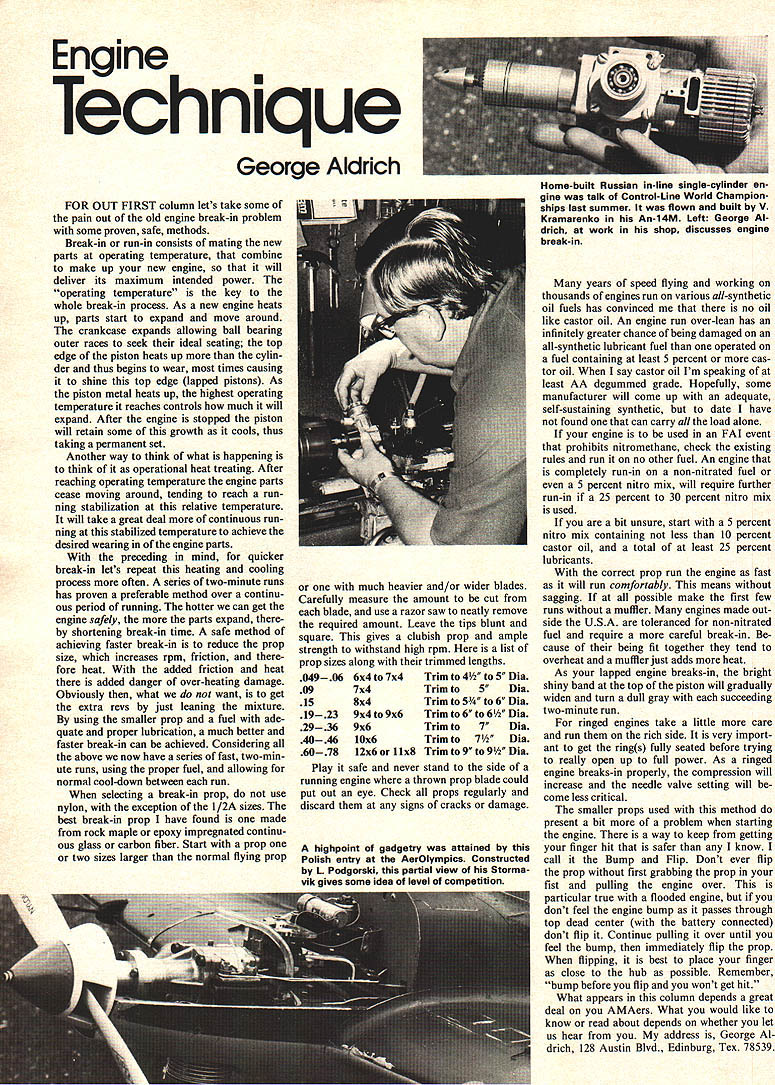 Engine Technique George Aldrich FOR OUT FIRST column lets take some pain out old engine break-in problem some proven safe methods Break-in run-in consists mating new parts operating temperature combine make up new engine will deliver its maximum intended power operating temperature key whole break-in process As new engine heats up parts start expand move around crankcase expands allowing ball bearing outer races seek ideal seating top edge piston heats up cylin der thus begins wear times causing shine top edge lapped pistons As piston metal heats up highest operating temperature reaches controls much will expand After engine stopped piston will retain some growth cools thus taking permanent set Another way think what happening think operational heat treating After reaching operating temperature engine parts cease moving around tending reach run ning stabilization relative temperature will take great deal continuous run ning stabilized temperature achieve desired wearing engine parts preceding mind quicker break-in lets repeat heating cooling process often series two-minute runs has proven preferable method over continu ous period running hotter can get engine safely the parts expand shortening break-in time safe method achieving faster break-in reduce prop size increases rpm friction fore heat added friction heat added danger over-heating damage Obviously what want get extra revs just leaning mixture using smaller prop fuel ade quate proper lubrication much better faster break-in can achieved Considering above now have series fast two-min ute runs using proper fuel allowing normal cool-down between run selecting break-in prop use nylon exception 1 /2A sizes best break-in prop have found made rock maple epoxy impregnated continu ous glass carbon fiber Start prop two sizes larger normal flying prop much heavier and/or wider blades Carefully measure amount cut blade use razor saw neatly remove required amount Leave tips blunt square gives clubish prop ample strength withstand high rpm list prop sizes along trimmed lengths 04906 09 15 1923 2936 40-46 60 78 6x4 7x4 7x4 8x4 9x4to9x6 9x6 10x6 l2x6or 11x8 Trim 4 5 Dia Trim to5Dia Trim 53/4 6 Dia Trim 6 6 Dia Trim to7Dia Trim 7 Dia Trim 9 9 Dia Play safe never stand side running engine thrown prop blade could put out eye Check props regularly discard signs cracks damage years speed flying working thousands engines run various all-synthetic oil fuels has convinced no oil like castor oil An engine run over-lean has infinitely greater chance being damaged all-synthetic lubricant fuel operated fuel containing least 5 percent cas tor oil say castor oil Im speaking least AA degummed grade Hopefully some manufacturer will come up adequate self-sustaining synthetic date have found can carry load alone engine used FAI event prohibits nitromethane check existing rules run no other fuel An engine completely run-in non-nitrated fuel 5 percent nitro mix will require further run-in 25 percent 30 percent nitro mix used bit unsure start 5 percent nitro mix containing less 10 percent castor oil total least 25 percent lubricants correct prop run engine fast will run comfortably means sagging possible make first few runs muffler engines made out side USA toleranced non-nitrated fuel require careful break-in cause being fit together tend overheat muffler just adds heat As lapped engine breaks-in bright shiny band top piston will gradually widen turn dull gray succeeding two-minute run ringed engines take little care run rich side very import ant get rings fully seated before trying really open up full power As ringed engine breaks-in properly compression will increase needle valve setting will come less critical smaller props used method present bit problem starting engine way keep getting finger hit safer know call Bump Flip Dont ever flip prop first grabbing prop fist pulling engine over particular true flooded engine dont feel engine bump passes through top dead center battery connected dont flip Continue pulling over until feel bump immediately flip prop flipping best place finger close hub possible Remember bump before flip wont get hit What appears column depends great deal AMAers What would like know read about depends whether let us hear address George Al drich 128 Austin Blvd Edinburg Tex 78539 Home-built Russian in-line single-cylinder en gine talk Control-Line World Champion ships last summer flown built V Kramarenko An-14M Left George Al drich work shop discusses engine break-in highpoint gadgetry attained Polish entry AerOlympics Constructed L Podgoraki partial view Storma vik gives some idea level competition