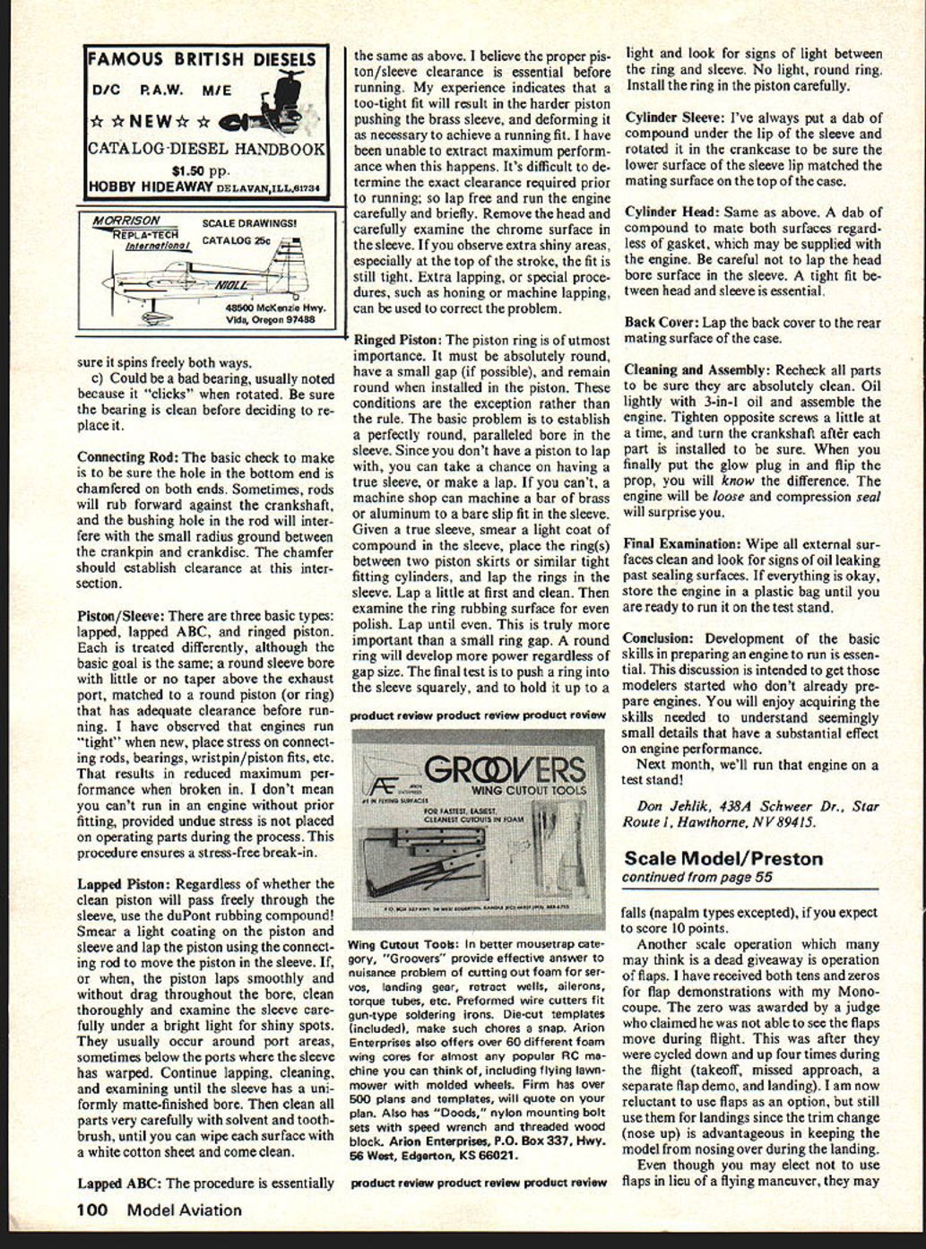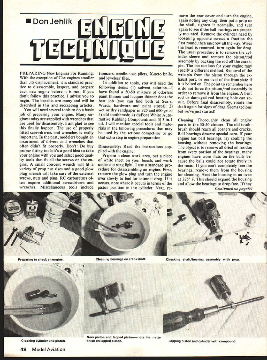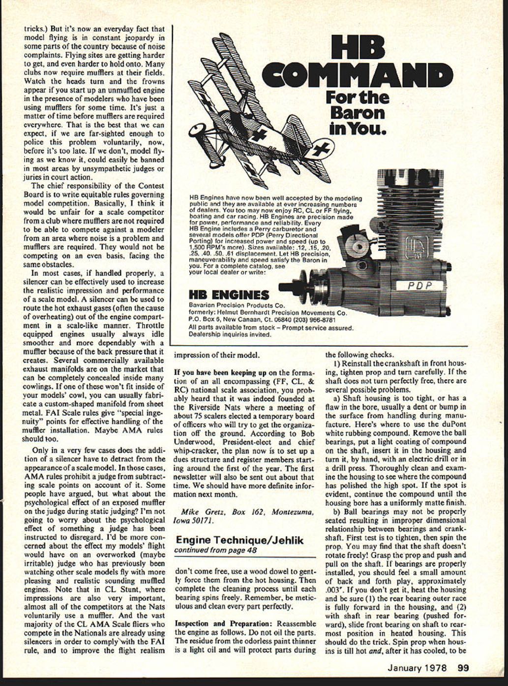 Don Jehilk LfLJLLI PREPARING New Engines Running exception Cox engines smaller 15 displacement standard prac tice disassemble inspect prepare new engine before run dont follow practice advise begin benefits will described succeeding articles will need several tools basic job preparing engine en gines today supplied wrenches used disassembly am glad see finally happen use properly fitted screwdrivers wrenches really important past modelers bought assortment drivers wrenches often didnt fit properly Dont buy proper fitting toolsits good idea take engine select good qual ity tools fit screws en gine small crescent wrench will fit variety prop nut sizes good glow plug wrench will take care external screws nuts plug RC carburetors ten require additional screwdrivers wrenches Miscellaneous tools include tweezers needle-nose pliers X-acto knife jewelers files addition tools will need following items solvent solutionI have found 50-50 mixture odorless paint thinner lacquer thinner does best job can find both Sears Wards hardware paint stores 2 wet dry sandpaper 320 600 grits 3 old toothbrush 4 duPont White Auto motive Rubbing Compound 5 3-in-I oil will mention special tools mate rials following procedures may used serious competitor go extra step engine preparation Disassembly Read instructions sup plied engine Prepare clean work area put piece white sheet bench work under strong light use standard pro cedure disassembling engine First remove glow plug turn engine over slowly feel internal drag occurs note occurs terms piston position cylinder Next re New piston lapped pistonnote matte finish lapped piston move rear cover turn engine again noting drag put prop shaft tighten normally turn again see ball bearings proper ly mounted Remove cylinder head loosening opposite screws fraction first round unscrew way head removed turn again drag usual procedure remove cyl inder sleeve remove piston/rod assembly backing rod off crankpin instructions engine may specify different method Removal wristpin piston through ex haust port removal frontplate bolted point remember force piston/rod assembly order remove engine bent rod damaged rod bearing hole can re sult Before final disassembly rotate shaft again signs drag Seems tedious weve just started Cleaning Thoroughly clean engine parts 50-50 cleaner old tooth brush should reach corners cracks Ball bearings deserve special care engine has ball bearings try soaking housing removing bearings object remove dried oil residue portion bearings engines have worn flats balls cause balls could rotate freely races cant completely free bearings remove housing cleaning Heat housing oven 3250 F should expand housing allow bearings drop free Continued page 99 Lapping piston cylinder compound WI Checking shaft/bearing assembly prop tricks its now everyday fact model flying constant jeopardy some parts country because noise complaints Flying sites getting harder get harder hold onto clubs nov require mufflers fields Watch heads turn frowns appear start up unmuffled engine presence mbdelers have using mufflers some time Its just matter time before mufflers required everywhere best can expect far-sighted enough police problem voluntarily now before its too late dont model fly ing know could easily banned areas unsympathetic judges juries court action chief responsibility Contest Board write equitable rules governing model competition Basically think would unfair scale competitor club mufflers required able compete against modeler area noise problem mufflers required would competing basis facing same obstacles cases handled properly silencer can effectively used increase realistic impression performance scale model silencer can used route hot exhaust gases often cause overheating out engine compart ment scale-like manner Throttle equipped engines usually always idle smoother dependably muffler because back pressure creates Several commercially available exhaust manifolds market can completely concealed inside cowlings wont fit inside models cowl can usually fabri cate custom-shaped manifold sheet metal FAT Scale rules give special inge nuity points effective handling muffler installation Maybe AMA rules should too Only very few cases does addi tion silencer have detract appearance scale model cases AMA rules prohibit judge subtract ing scale points account Some people have argued what about psychological effect exposed muffler judge during static judging Im going worry about psychological effect something judge has instructed disregard Id con cerned about effect models flight would have overworked maybe irritable judge has previously watching other scale models fly pleasing realistic sounding muffled engines Note CL Stunt impressions also very important almost competitors Nats voluntarily use muffler vast majority CL AMA Scale fliers compete Nationals already using silencers order comply FAT rule improve flight realism KB aron inYou HB Engines have now well acc~ public available ever dealers too may now enjoy RC boating car racing HE Engines precision power performance reliability HB Engine includes Perry carburetor several models offer PDP Perry Directional Porting increased power speed up 1500 RPMs Sizes available 12 15 20 25 40 50 61 displacement Let HE precision maneuverability speed satisfy Baron complete catalog see local dealer write NB ENGINES Bavarian Precision Products Co formerly Helmut Bernhardt Precision Movements Co PO Box 6 New Canaan Ct 06840 203 966-8781 parts available stock pt service assured Dealership inquiries invited impression model Ii have keeping up forma tion encompassing FF CL & RC national scale association prob ably heard indeed founded Riverside Nats meeting about 75 scalers elected temporary board officers will try get organiza tion off ground According Bob Underwood President-elect chief whip-cracker plan now set up dues structure register members start ing around first year first newsletter will also sent out about time should have definite inf