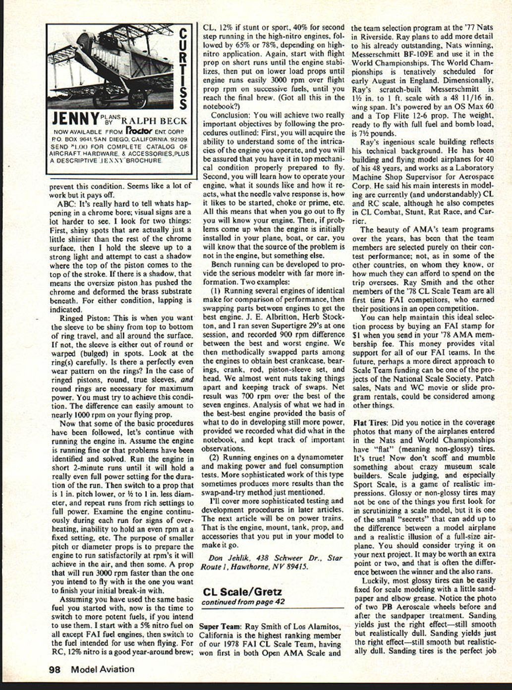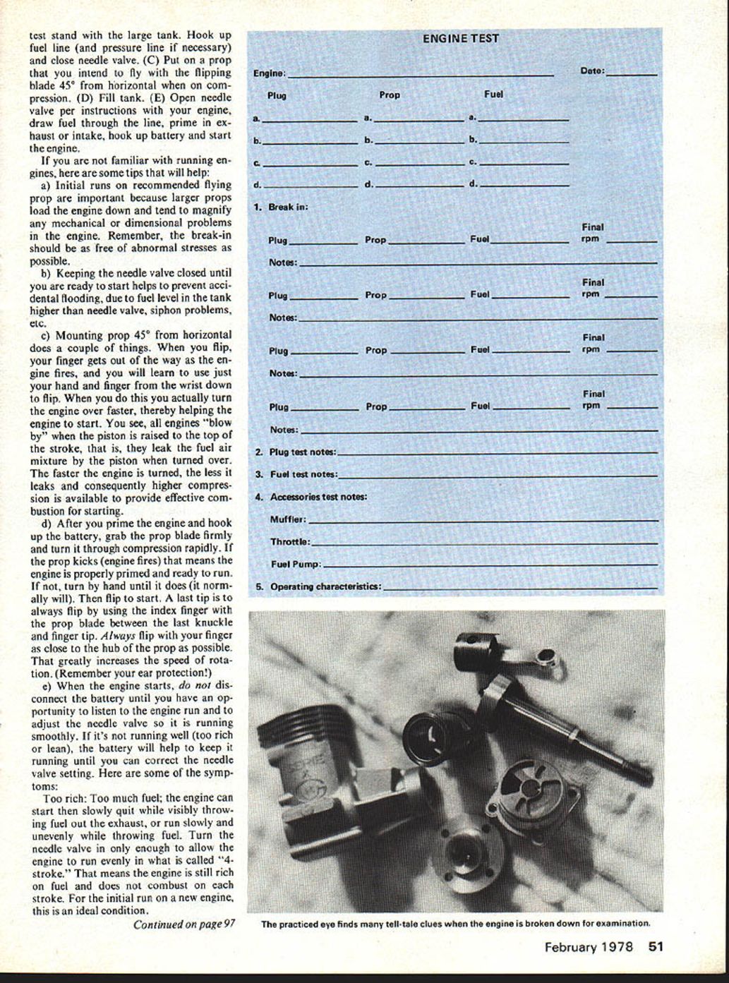 Don Jehlik cIiLJL BENCH RUNNING ENGINES Last lets take engine run month reviewed basic procedures Ive gone out field run engines use preparing new engines run Now found Ive forgotten something Ive needed test Heres checklist items Test stand large small tank tubing props test flight duplicate flight fuels fill bulb pump plugs glasses Also good battery leads tachom eter stopwatch 3-in-I oil tools rags notebook pencil ear protectors engine practice set everything out sure its Begin making entry notebook Engine tested type fuel etc sample format shown Ex ample 1 information entered will help keep organized during running procedures B Mount engine 50 Model Aviation going ing ut engines suitable test stand essential Ear protectors safety glasses recommended rpiii UneUk ills imporiani muns Wil inenoed flying proplarger PrODS load engine gown cause overneatina p peeu u aujust true neaule valve soon aiter engine star e ideal condition initial run new engine requires turning needle valve just enough produce 4-stroke run running engine cnecea jor temperaturem head shown bearing areas lower upper crankcase mean ing excessive heat spots fully examined text test stand large tank Hook up fuel line pressure line necessary close needle valve C Put prop intend fly flipping blade 450 horizontal com pression D Fill tank E Open needle valve per instructions engine draw fuel through line prime ex haust intake hook up battery start engine familiar running en gines some tips will help a Initial runs recommended flying prop important because larger props load engine down tend magnify mechanical dimensional problems engine Remember break-in should free abnormal stresses possible b Keeping needle valve closed until ready start helps prevent acci dental flooding due fuel level tank higher needle valve siphon problems etc c Mounting prop 450 horizontal does couple things flip finger gets out way en gine fires will learn use just hand finger wrist down flip you actually turn engine over faster thereby helping engine start see engines blow piston raised top stroke leak fuel air mixture piston turned over faster engine turned less leaks consequently higher compres sion available provide effective com bustion starting d After prime engine hook up battery grab prop blade firmly turn through compression rapidly prop kicks engine fires means engine properly primed ready run turn hand until does norm ally will flip start last tip always flip using index finger prop blade between last knuckle finger tip Always flip finger close hub prop possible greatly increases speed rota tion Remember ear protection e When engine starts dis connect battery until have op portunity listen engine run adjust needle valve running smoothly its running well too rich lean battery will help keep running until can correct needle valve setting some symp toms Too rich Too much fuel engine can start slowly quit visibly throw ing fuel out exhaust run slowly unevenly throwing fuel Turn needle valve enough allow engine run evenly what called 4stroke means engine still rich fuel does combust stroke initial run new engine ideal condition Continued page 97 ENGINE TEST Engin Plug Prop Fuel 8a ________________ 8________________ ________________ b_______________ I,_______________ C _________________ C ________________ C ________________ dd _______________ d _______________ 1 Breakln Plug Prop_____________ Fuel_____________ Notes Plug___________ Prop____________ Fuel Notes Final PlugPropFuelrpm Notes Final PlugPropFuelrpm Notes Plug test notes Fuel test notes Accessories test notes Muffler Throttle Fuel Pump Operating characteristics February 1978 51 Date__________ Final rpm _________ Final rpm____ 2 45 practiced eye finds tell-tale clues engine broken down examination NEWf MUFF-L-IT SERIES Available B C engines E REGULAR IT REAR EX Six eight Ob reduction noise engines Proportional volumne expan sion chamber Large exhaust nozzle low back pressure Little no loss power No 33109IN$749 No 3022940tO35 No 3034550$549 *nubu B m 0 oh4a No304RX09it$1095 No305552944$1195 90306534550tt3n5 1/2A MUFFLER Fits COX 049 engines No 3000049$549 No 3005051$549 Sympo 78 can whip out article covering some aspect Free Flight within next month two please send abstract proposed paper Bob Dodds Box 436 Rancho Stanta Fe CA 92067 Bob Meuser 4200 Gregory St Oak land CA 94619 Bumbled Bee/Pallet continued page 58 ber years great success also pre-shrink condenser paper damp ening allowing air-dry before applying structure reduces later warping surfaces due vary ing humidity Power requirements will course vary site site depending upon ceiling height However will likely working 035 065 rubber loop lengths between 10 14 depending upon weight particular model again characteristics site Adjustments desired flight circle fly conventionally left 35- 50-ft circles partially built-in vir tue fin formed condenser paper covering between two sup port posts forward canard surface being off-set left turn because socket rear post glued right side motorstick front socket center-line Additional turn trim can accomplished using either side-thrust differential incidence twist left right canard halves some combination two Optimum flight performance requires much trial-and-error testing varying combinations power rubber cross-sec tion length number winds wing canard trim settings Two partic ular tips dont afraid experiment CG location adding very small amount ballast clay fore aft sure wind rubber-motor left otherwise youre going very embar rassed Bumbled-Bee tries fly back towards instead forward away However get going right direction pa tience methodical approach trim adjustments think youll find little Easy-B canard fun fly fully competi tive conventional designs very least its eye-catcher conversation-starter Engine Technique/Jehlik continued page 51 Too lean enough fuel engine starts gains rpm rapidly slows down dies usually 3-5 seconds prepared adjust needle valve soon after engine starts Ive provided plen